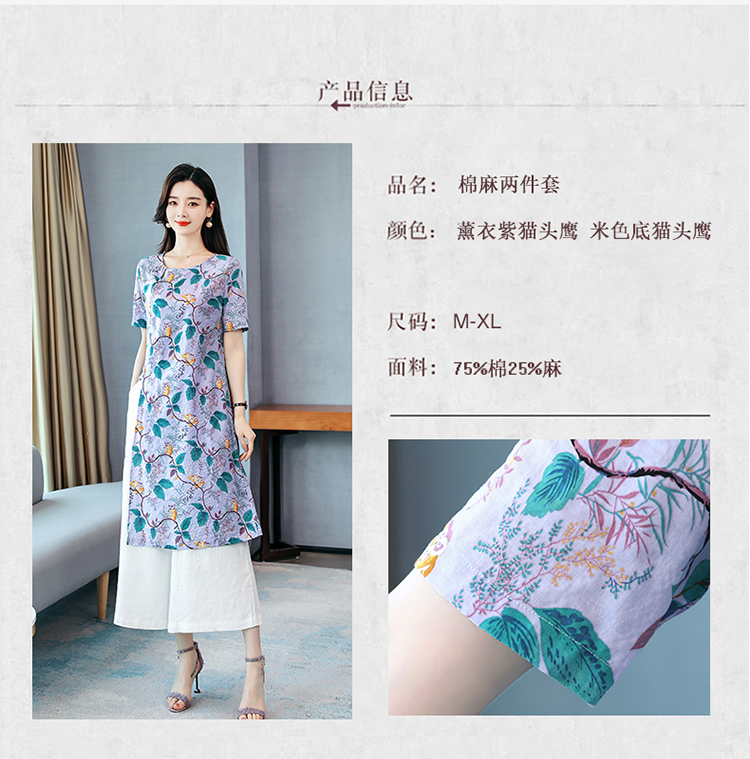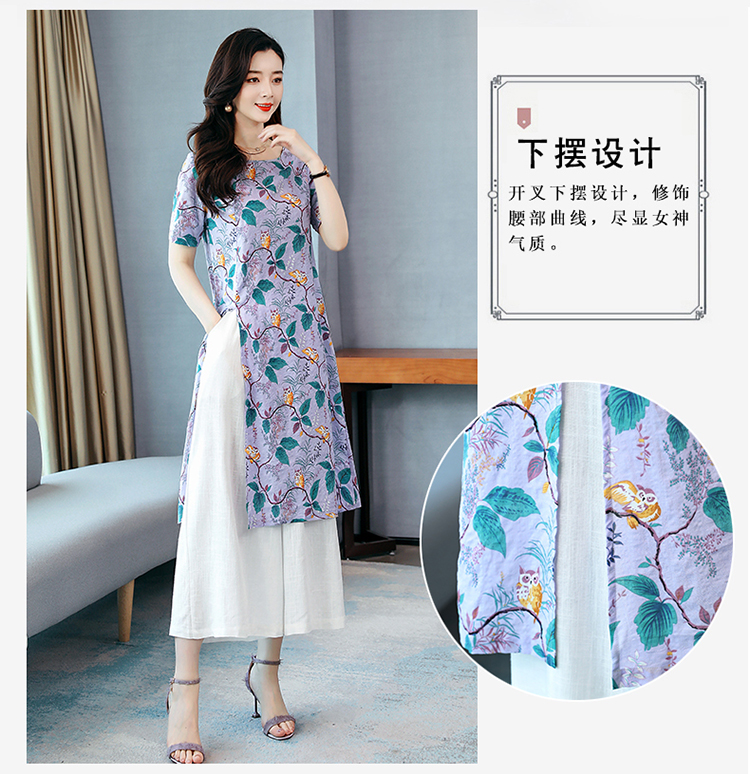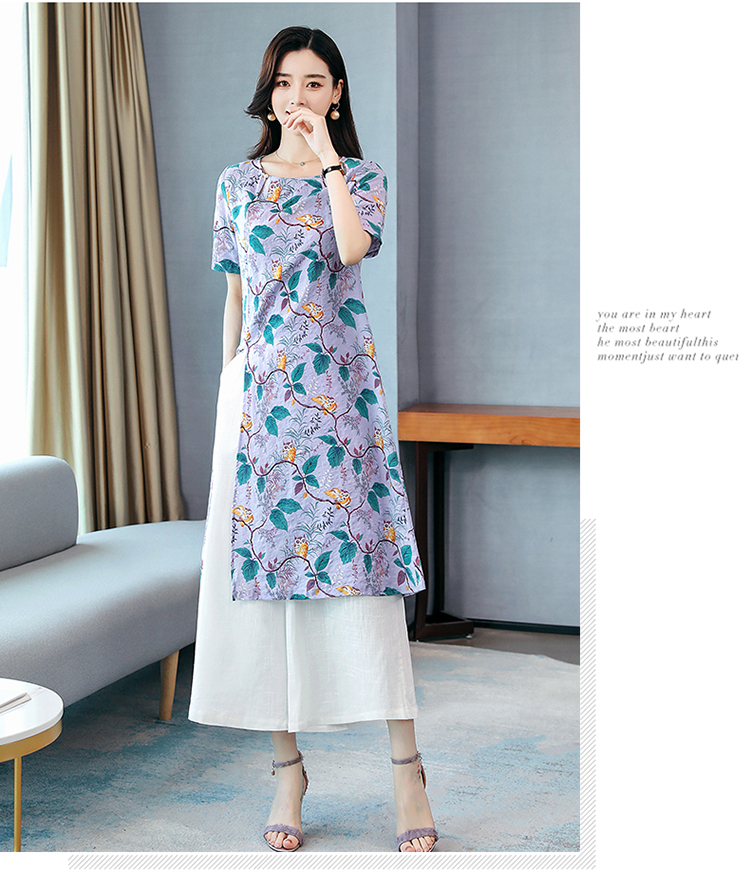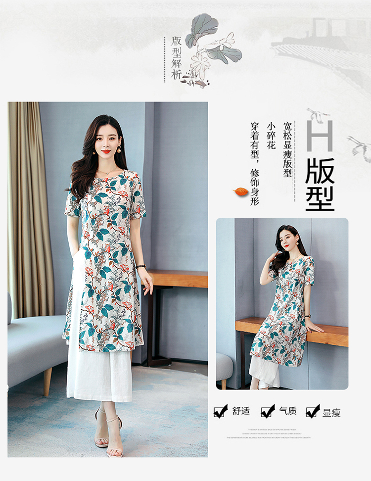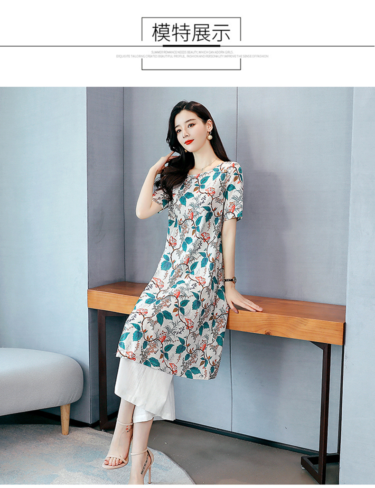 WZNH-MCXZ208夏季棉麻复古中长款短袖显瘦印花两件套