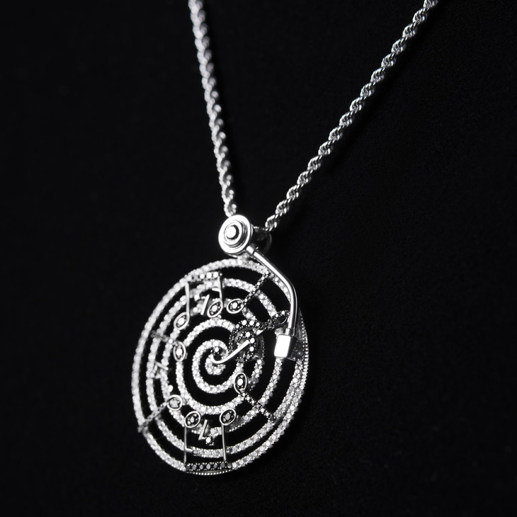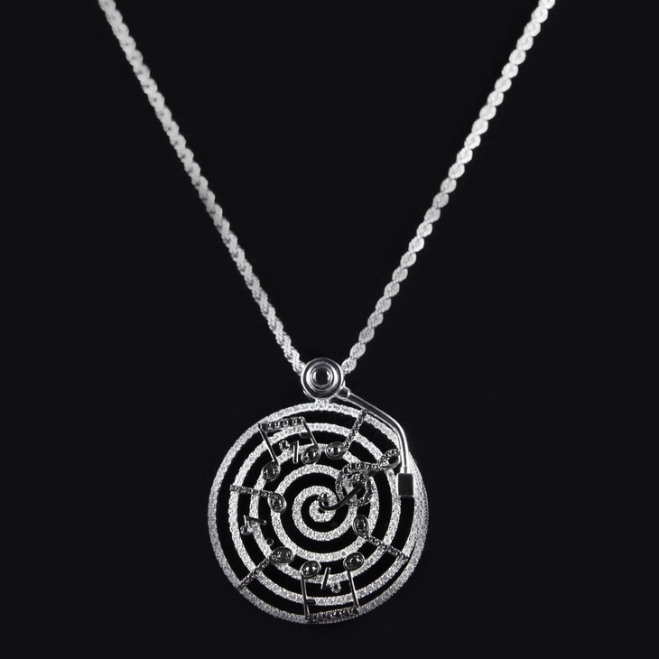 把"婚礼进行曲"开头一小节的八个音符用黑色钻石镶嵌在了白色钻石镶成的五线谱上,黑白钻的整体更是一张转动着的黑胶唱片, 可谓创意无限,文艺又别致。