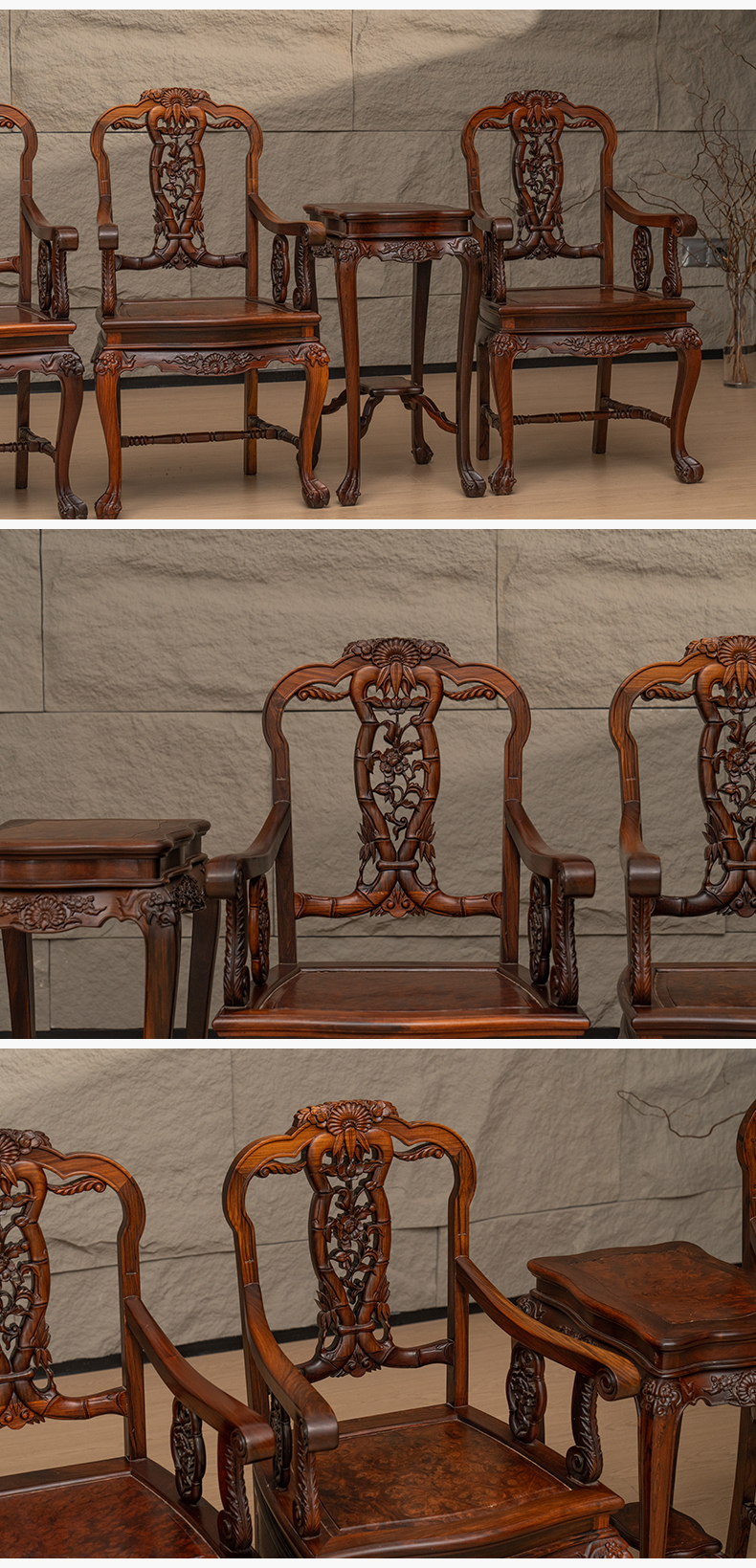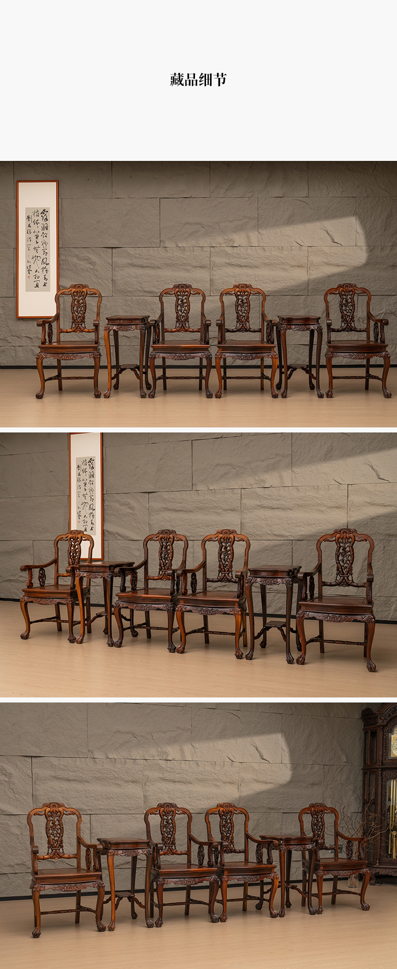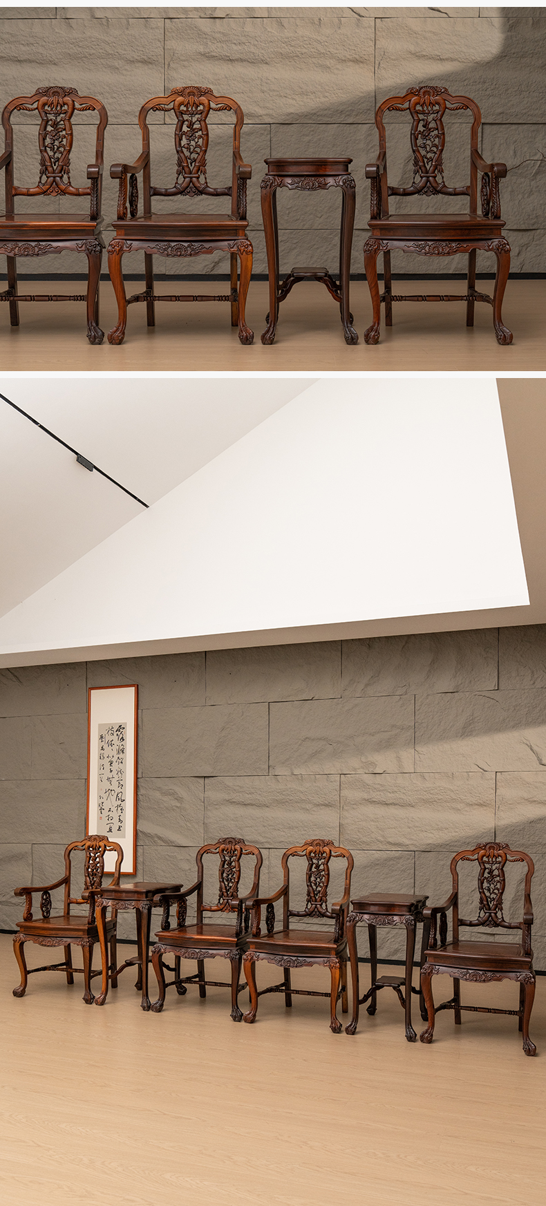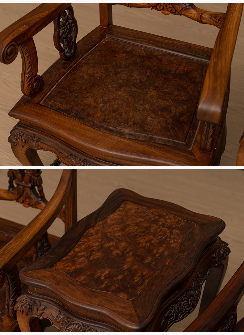 民国 红木镶瘿木雕花卉纹扶手椅成堂(四椅两几)