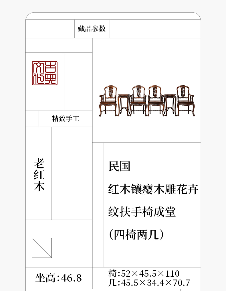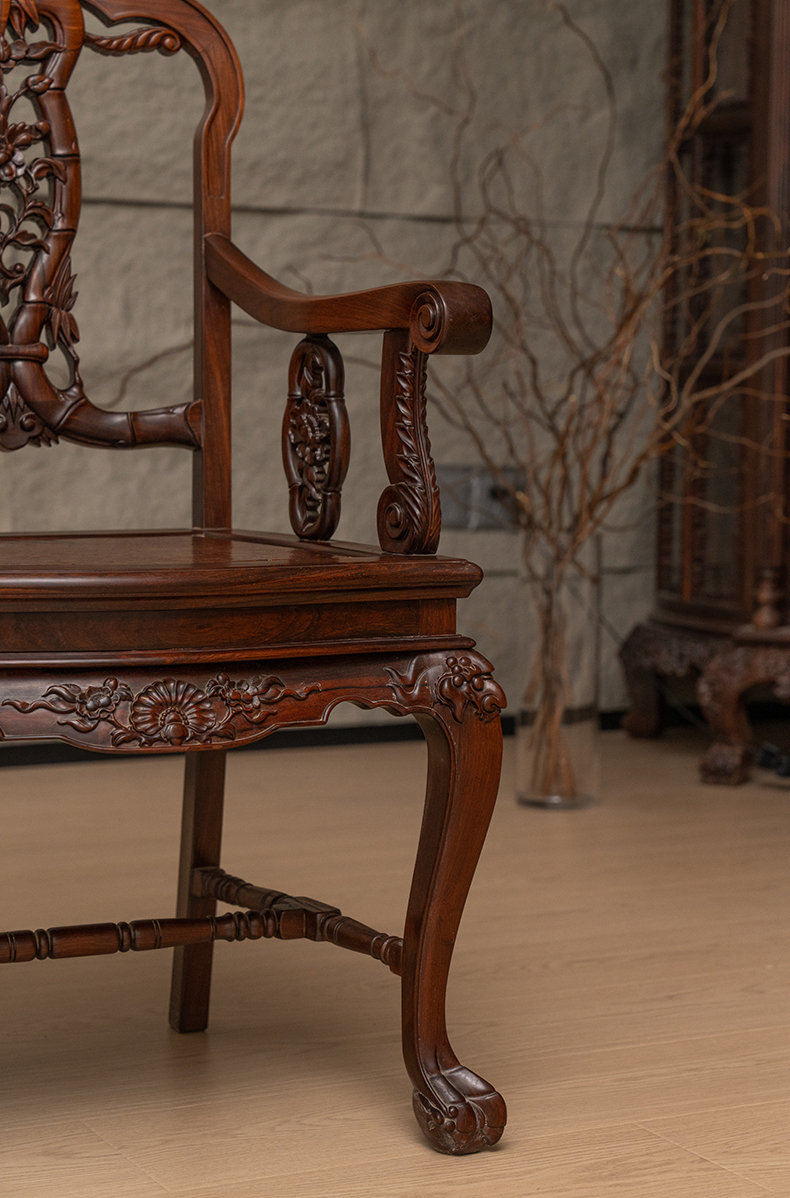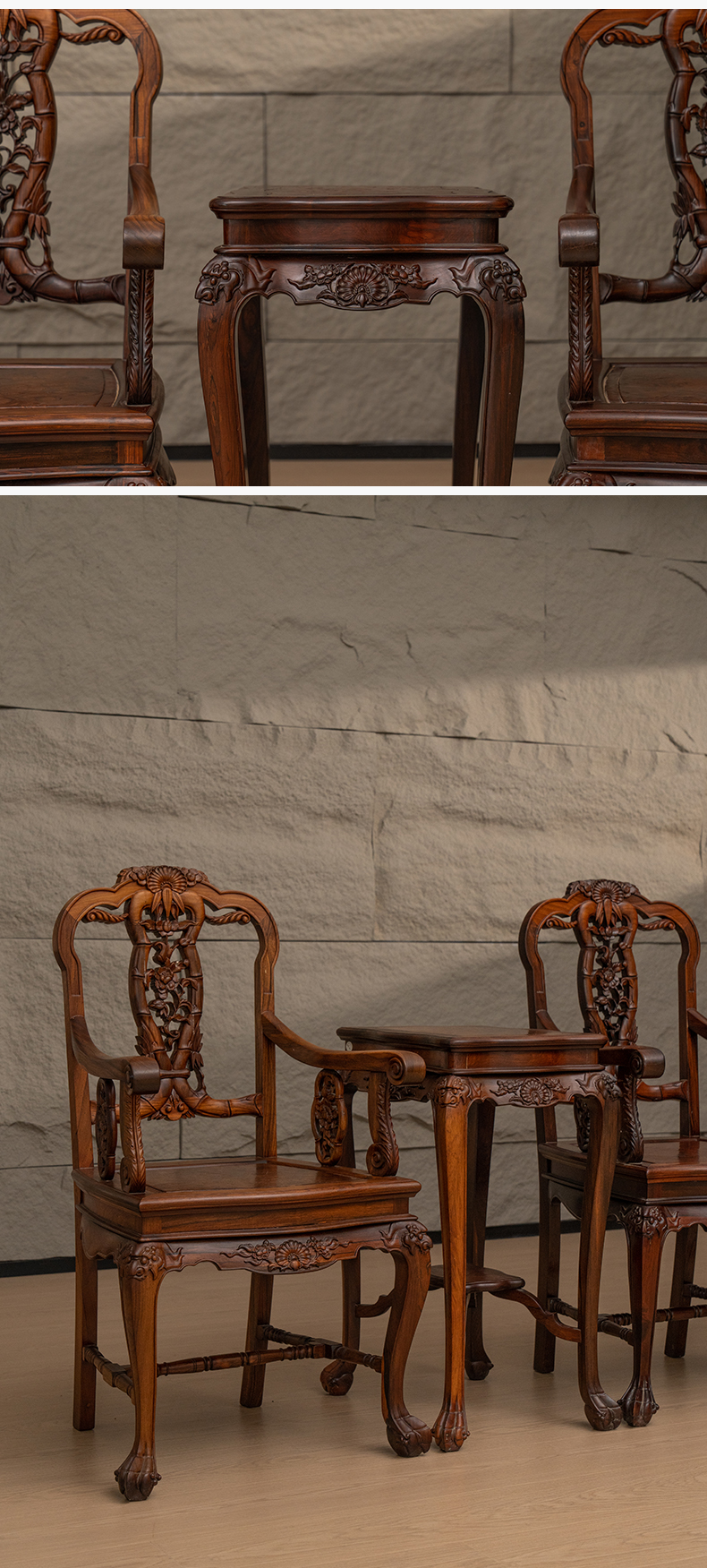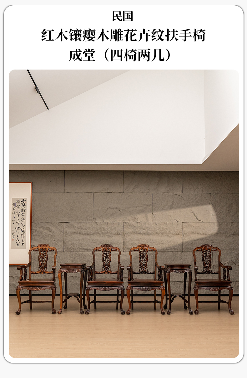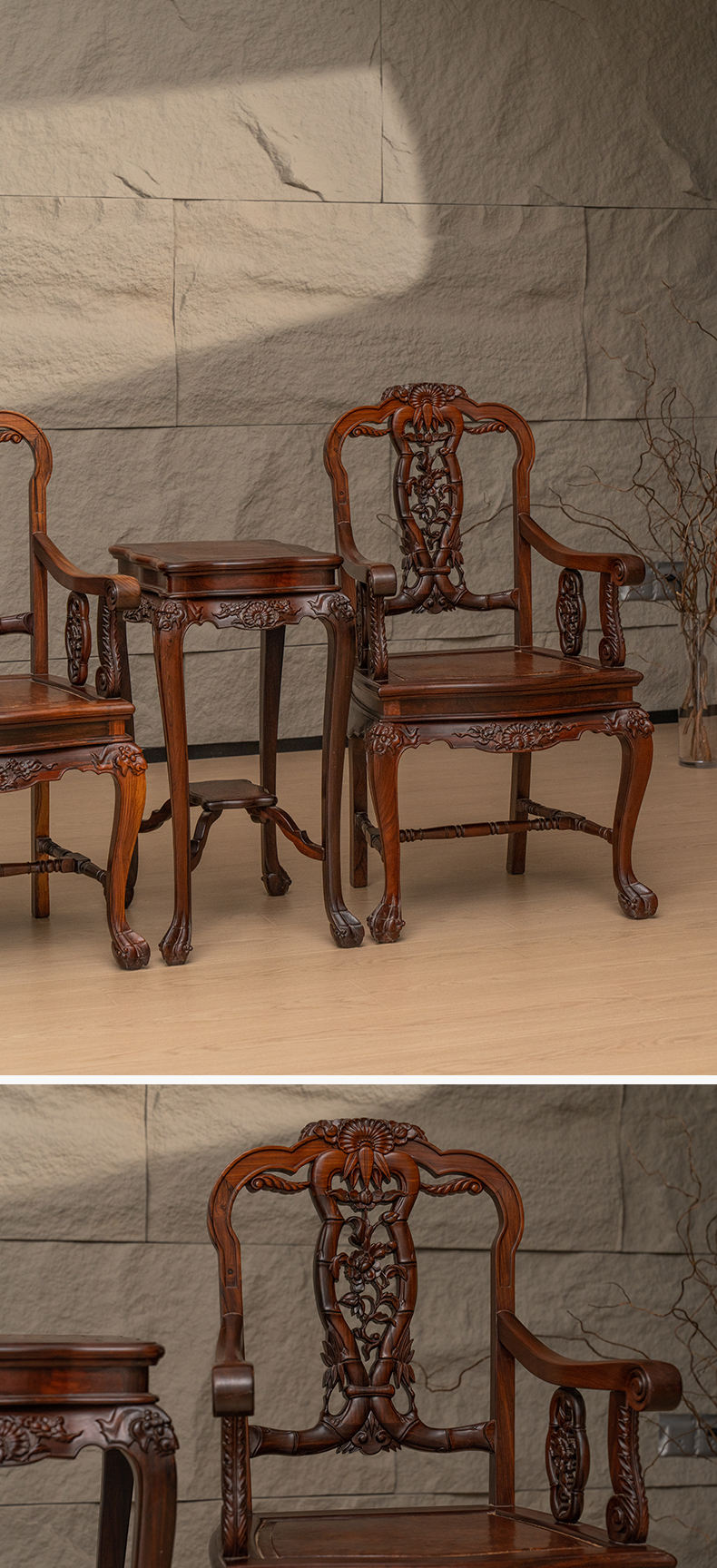 民国 红木镶瘿木雕花卉纹扶手椅成堂(四椅两几)