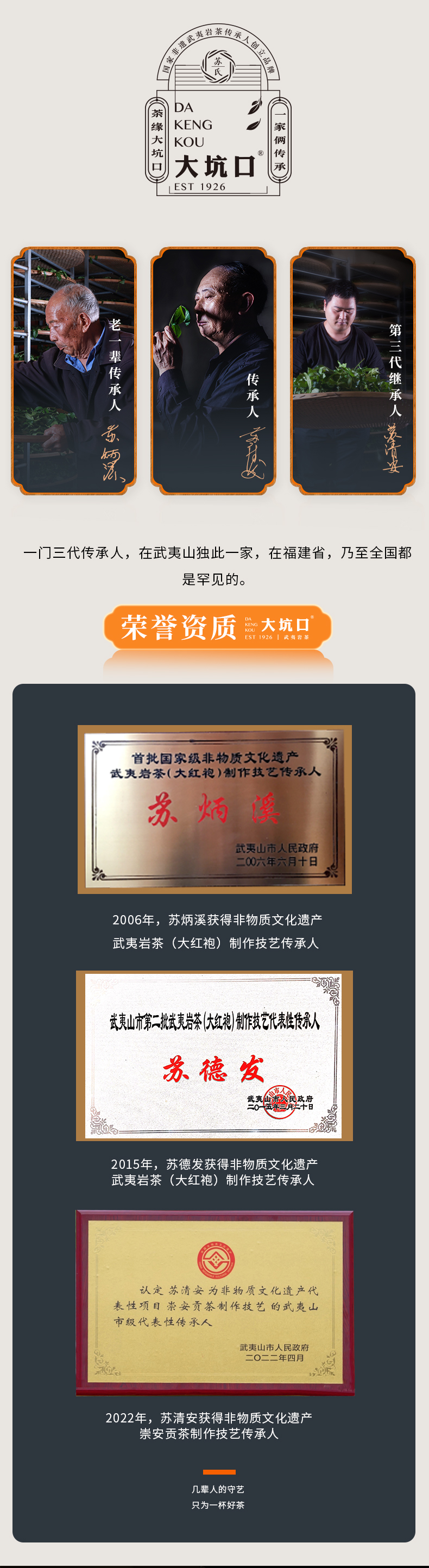 大坑口岩茶有限公司,位于武夷山市-天心村,茶山分布于正岩产区的“三坑、两涧”,由首批非物质文化遗产武夷岩茶制作技艺传承人:苏炳溪和第二批传承人:苏德发先生的精心手工制作,造就了大坑口岩茶的独特品质