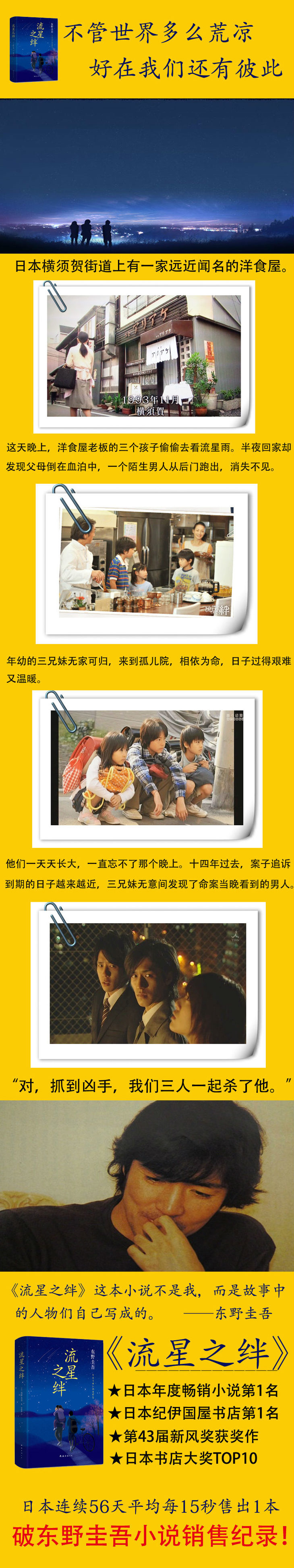 日本当代长篇小说,东野圭吾情感悬疑大作,日本连续56天平均每15秒售出1本,破东野圭吾小说销售纪录,并获日本年度畅销小说首名、日本纪伊国屋书店首名以及第43届新风奖,二宫和也、锦户亮、户田惠梨香、三浦友和主演同名日剧,囊括8项大奖。东野圭吾说:“《流星之绊》这本小说不是由我,而是由故事中的人物们自己写成的。”