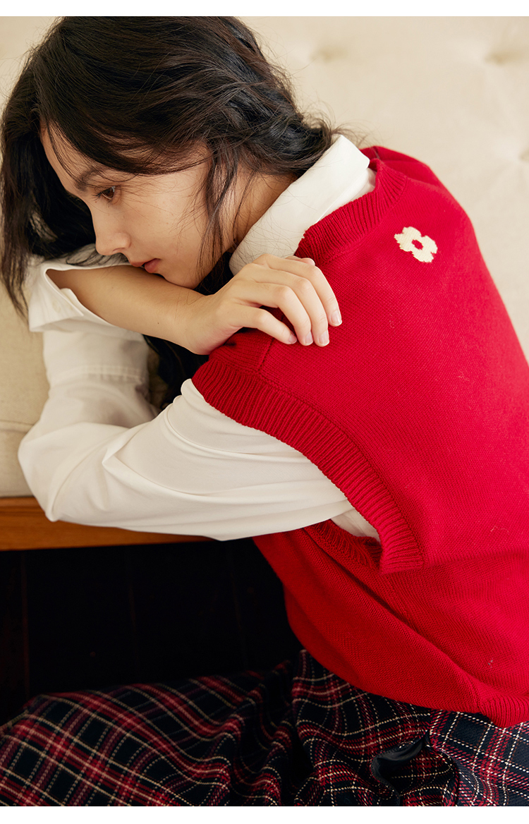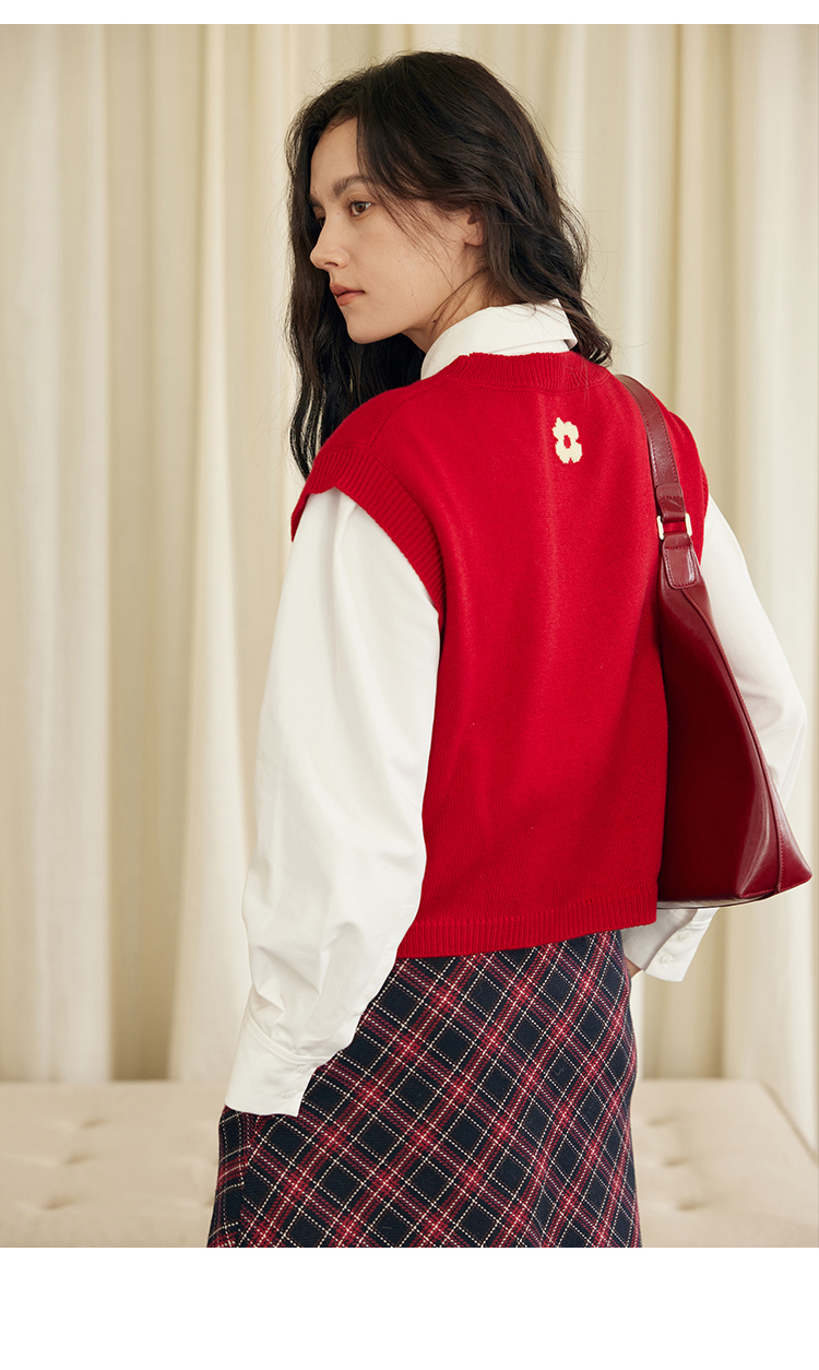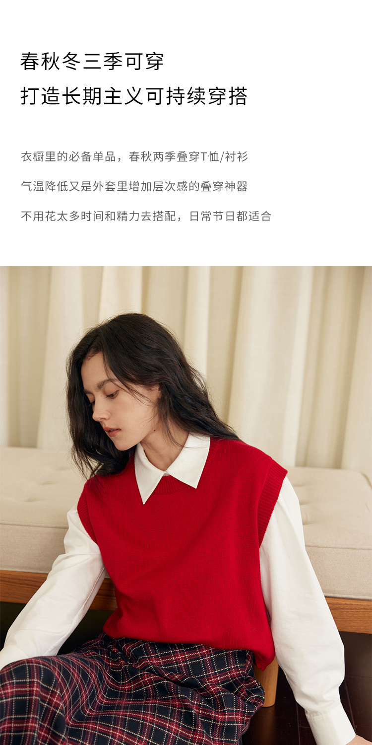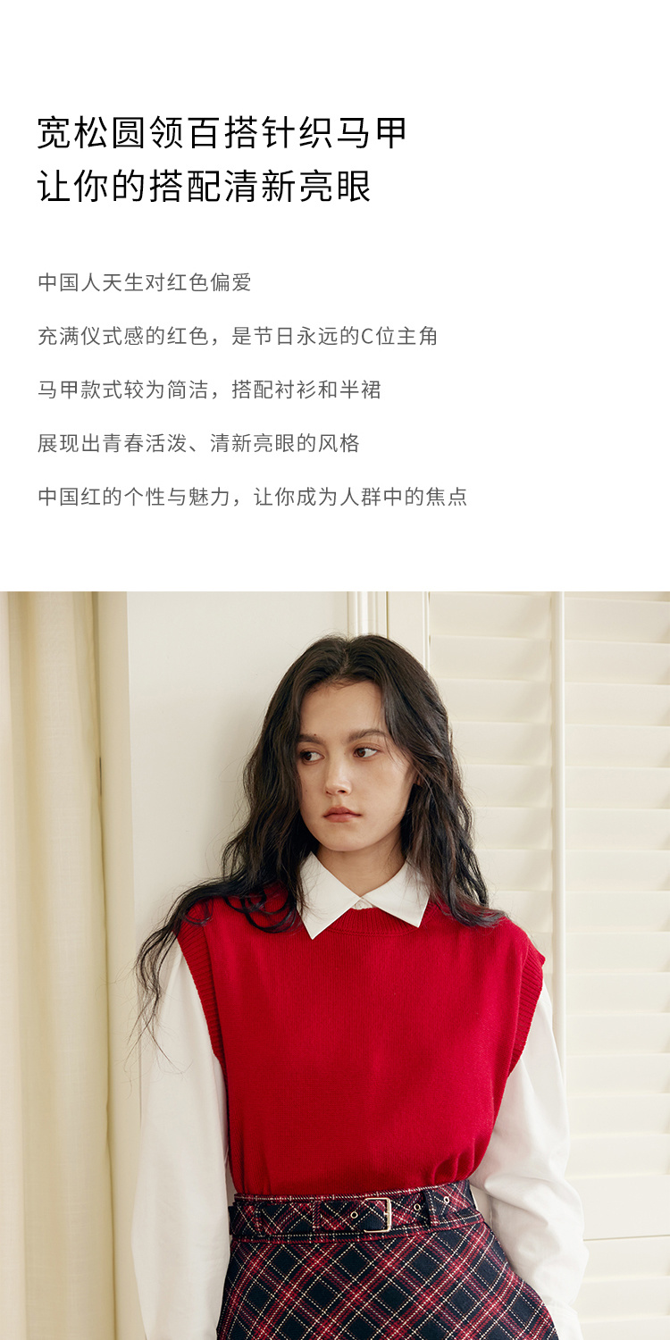 HeyDress羊毛针织马甲女冬季红色复古圆领宽松保暖短款百搭背心