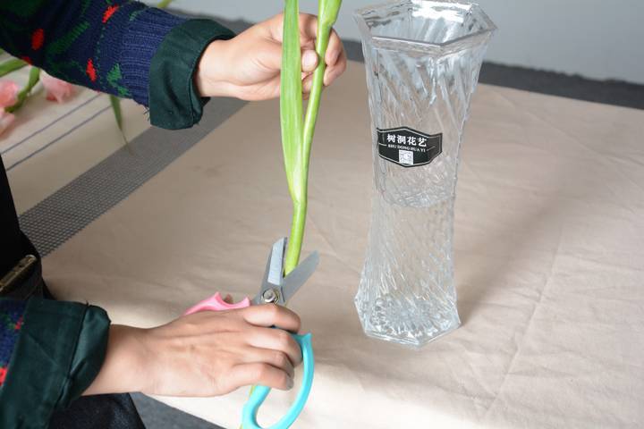 4、用剪刀斜剪45°根部,插入花瓶中(水位大概花瓶1/2左右即可)