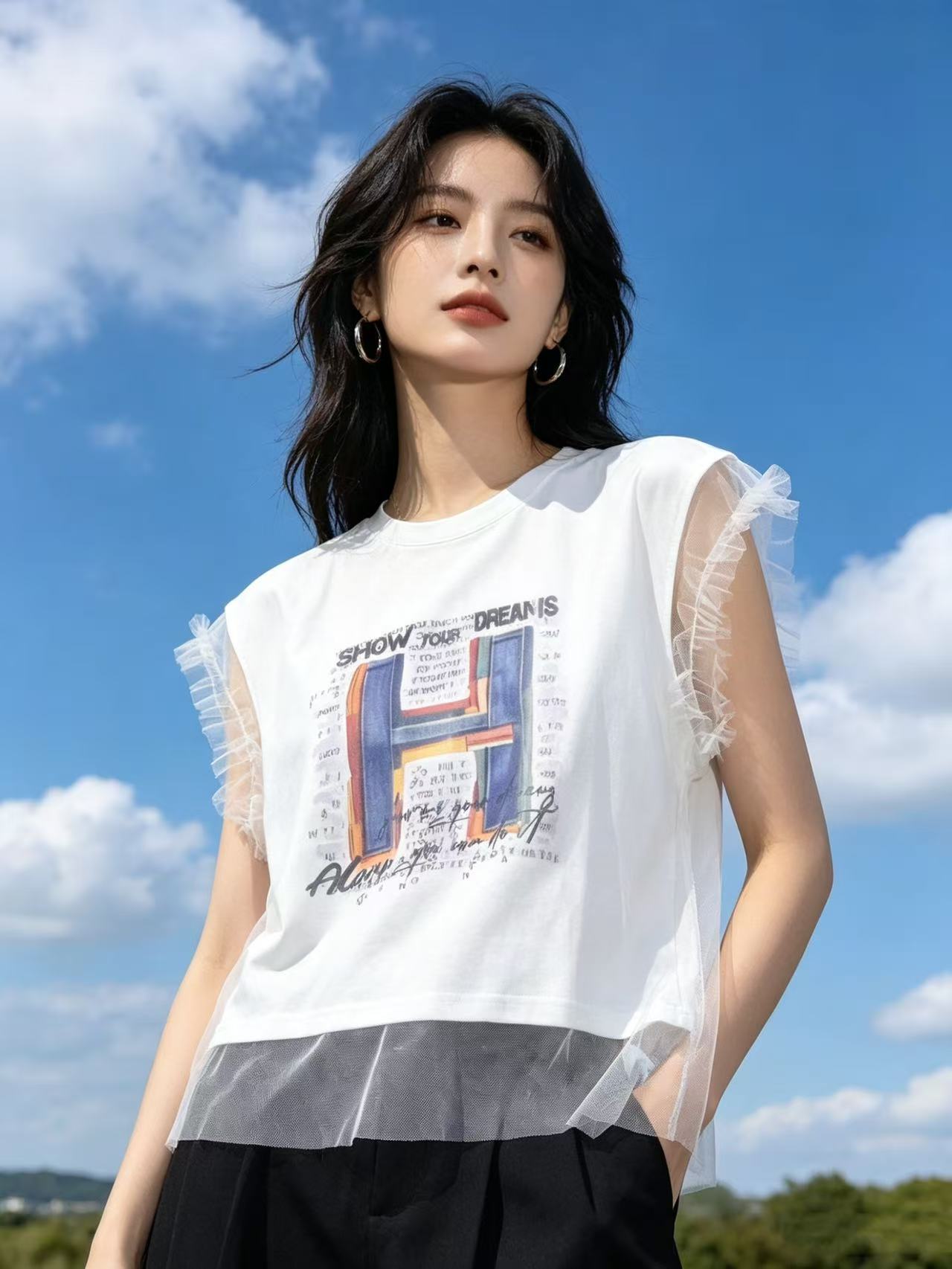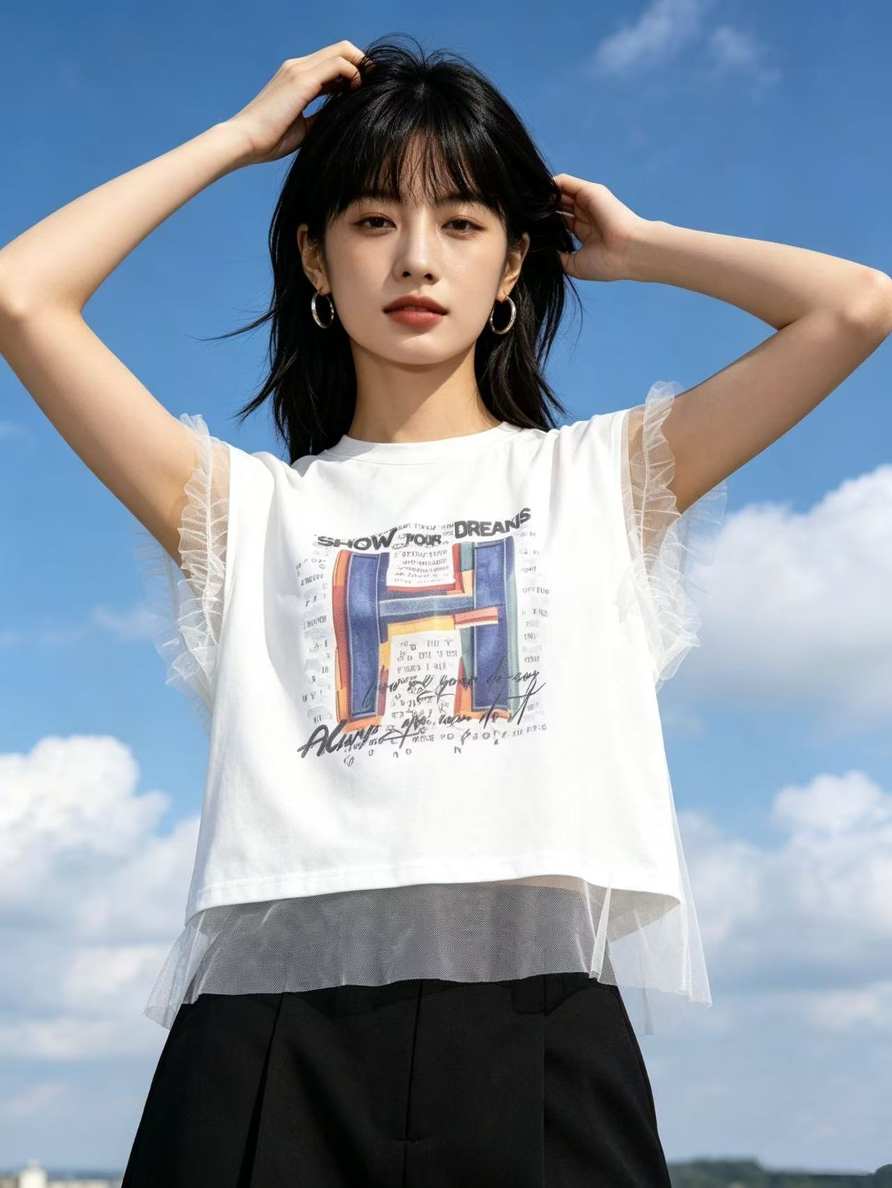 重工/工艺T【自营】超仙气网纱款!韩系设计感短袖90棉T恤夏季-喜出