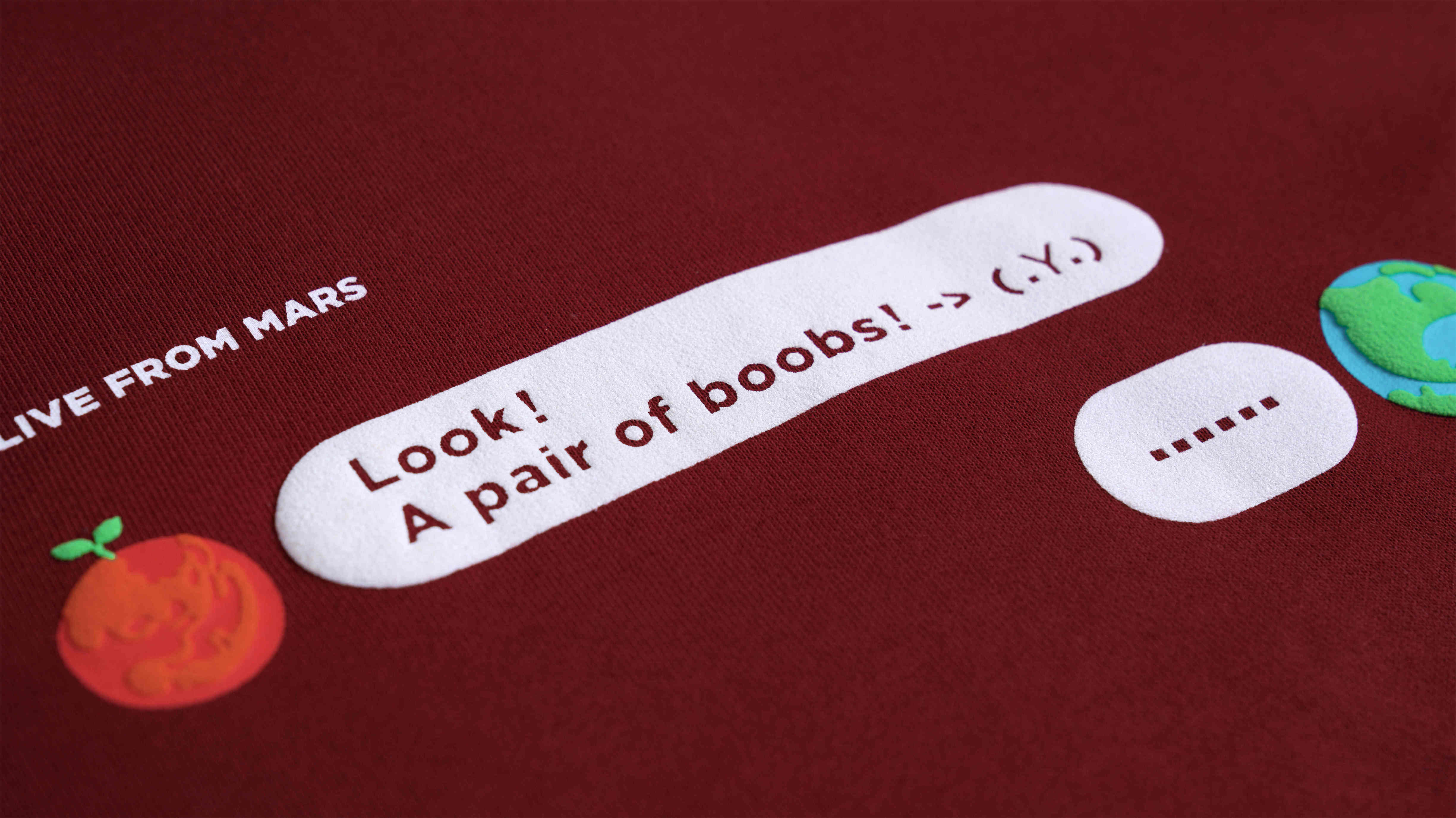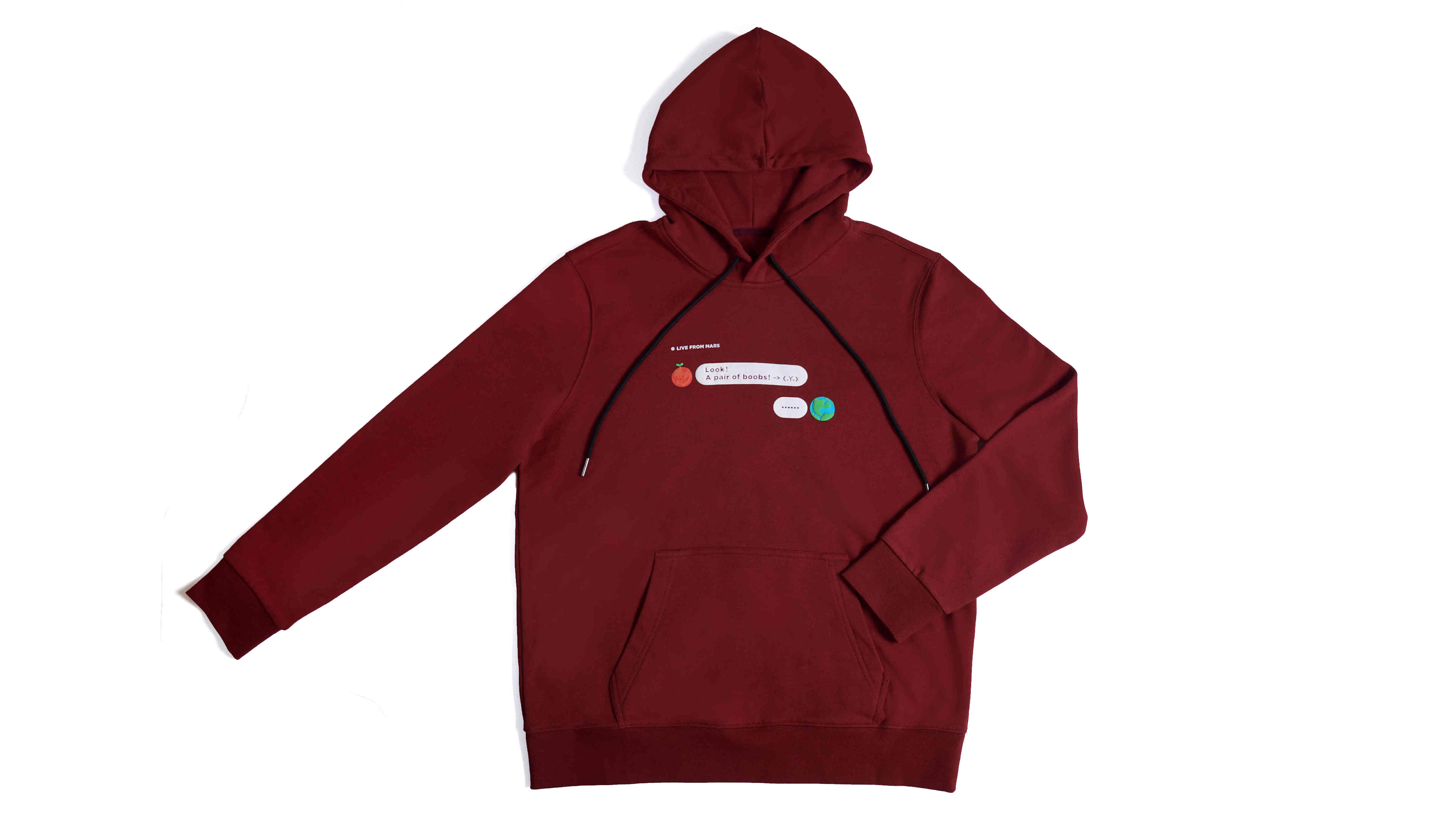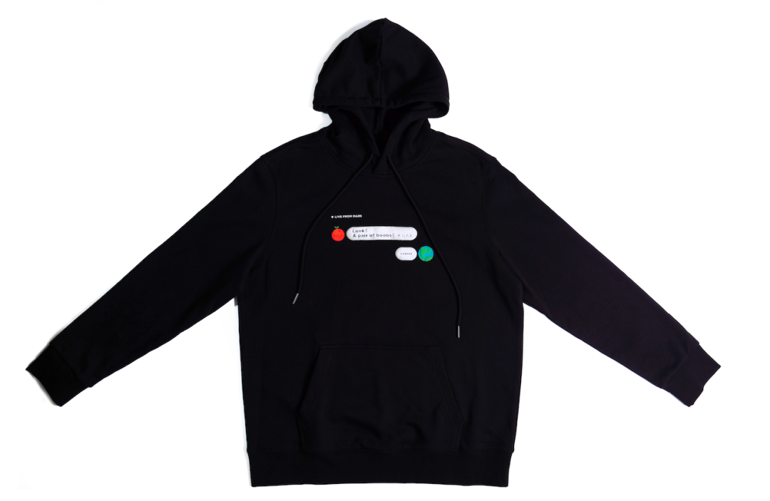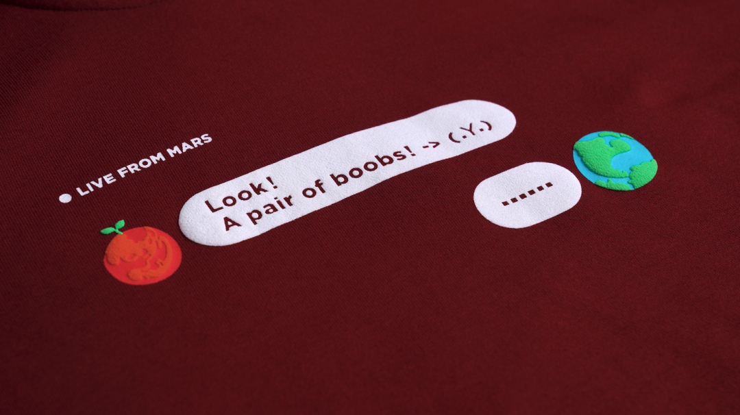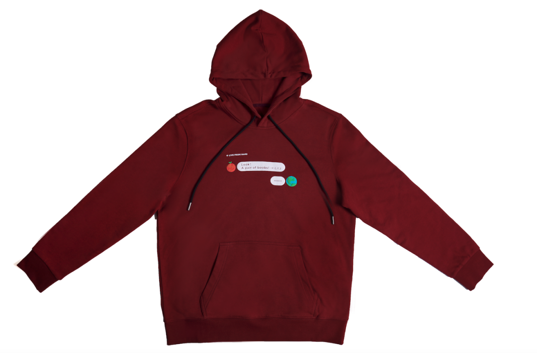把火星和地球具象表现,设计了好几个版本,选来选去还是对话框模拟最直观,成品(这次只做了帽衫款)