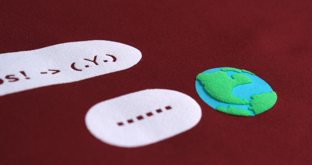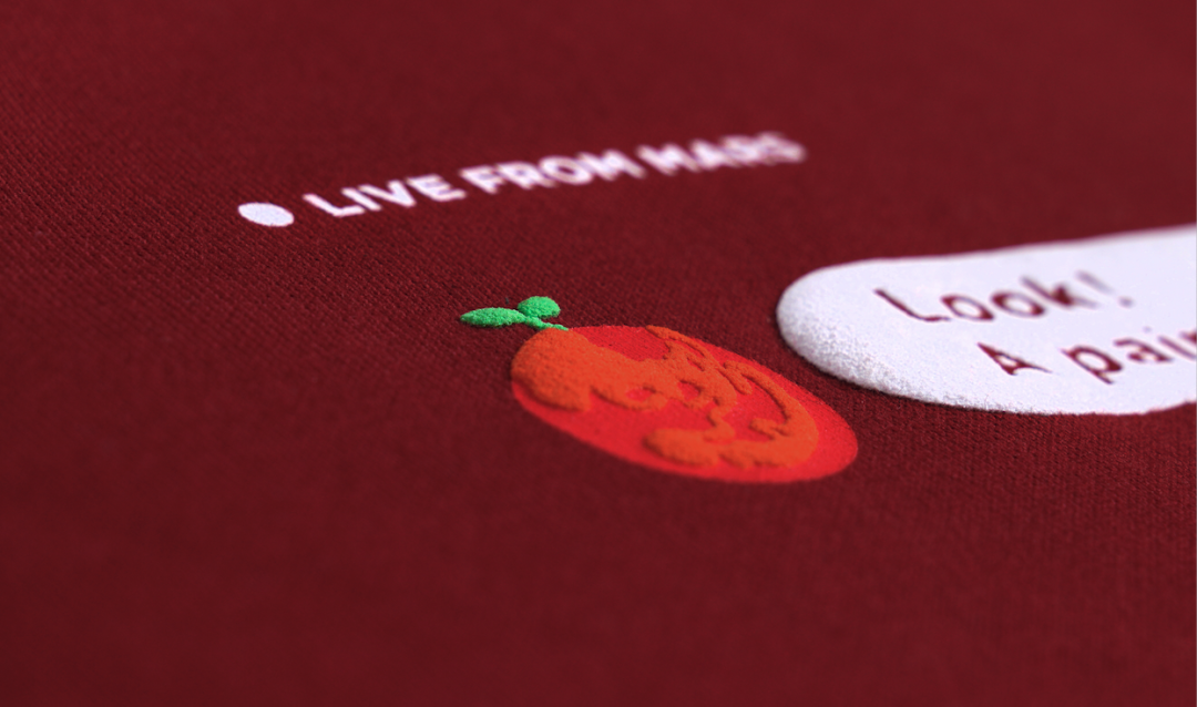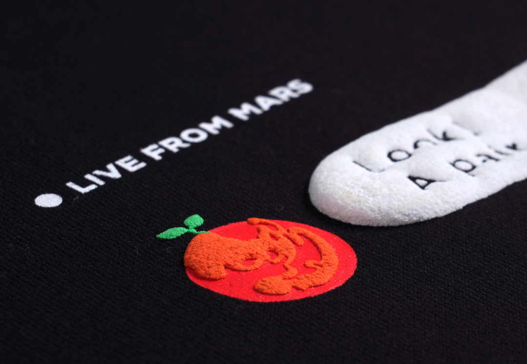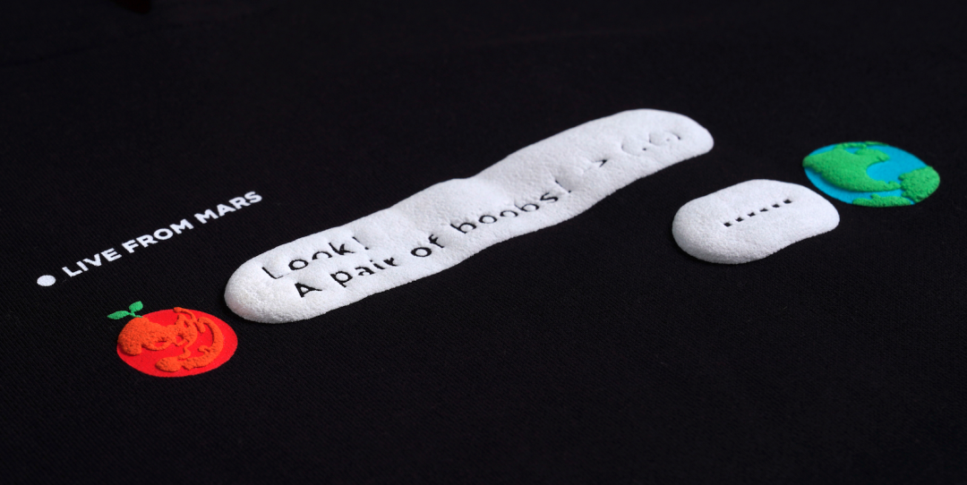 ,字体和宇航员是弹力胶浆丝网印花。