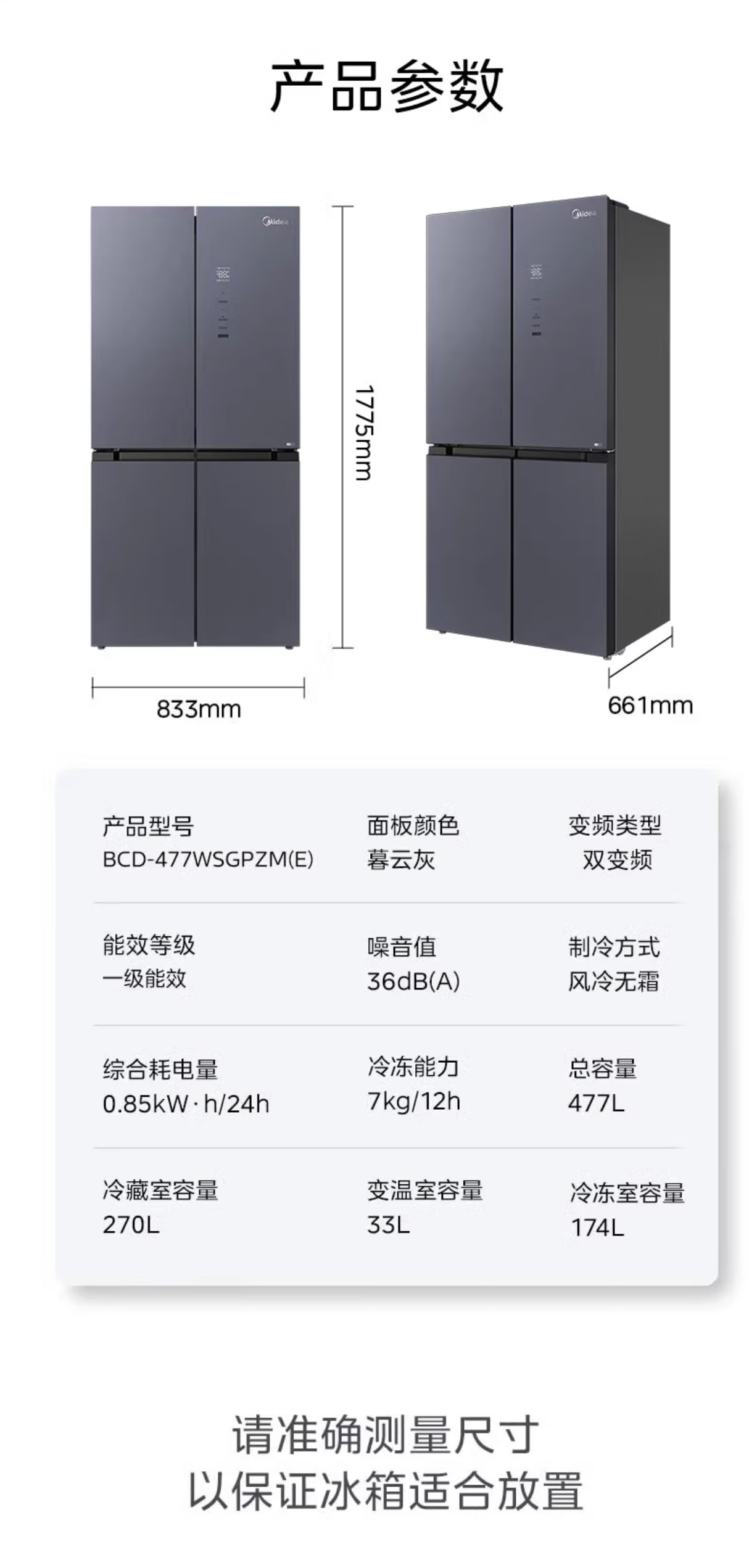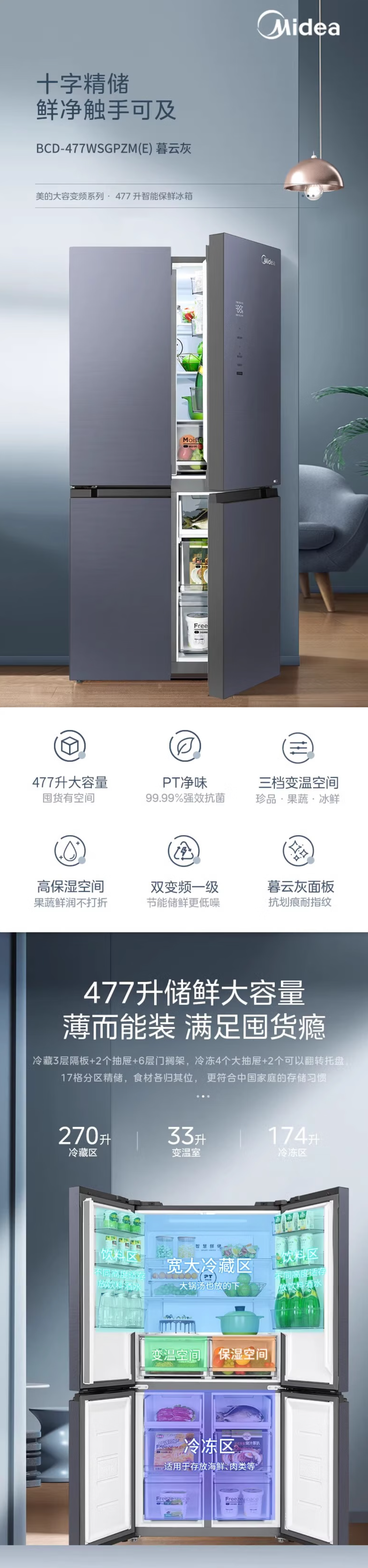 美的(Midea)477升十字门冰箱大容量变频一级雷达感温智能家电玻璃面板BCD-477WSGPZM(E) 暮云灰