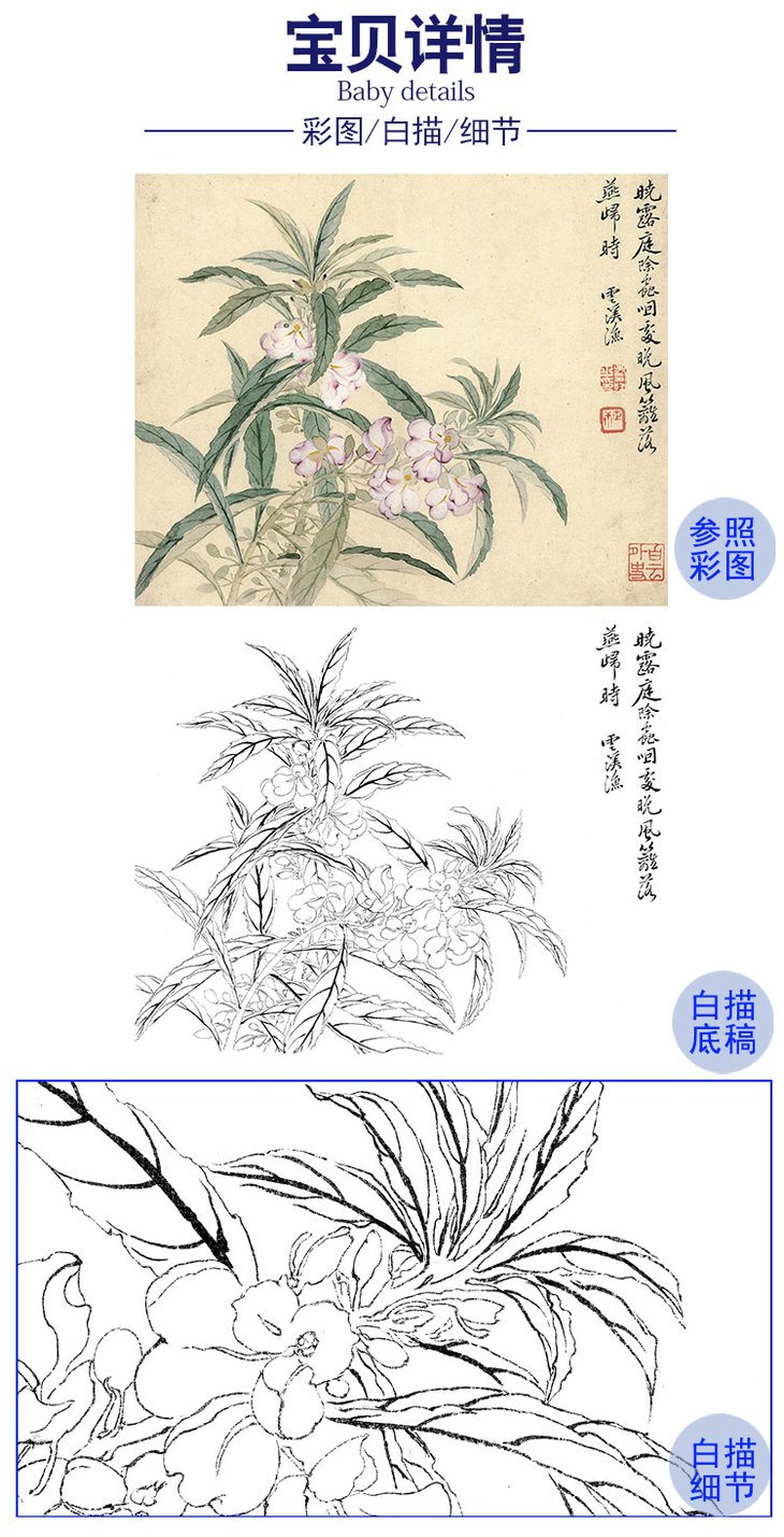 【大彩图】李晓明横幅工笔画白描底稿《群芳谱》牡丹临摹勾线花鸟线稿KA25
