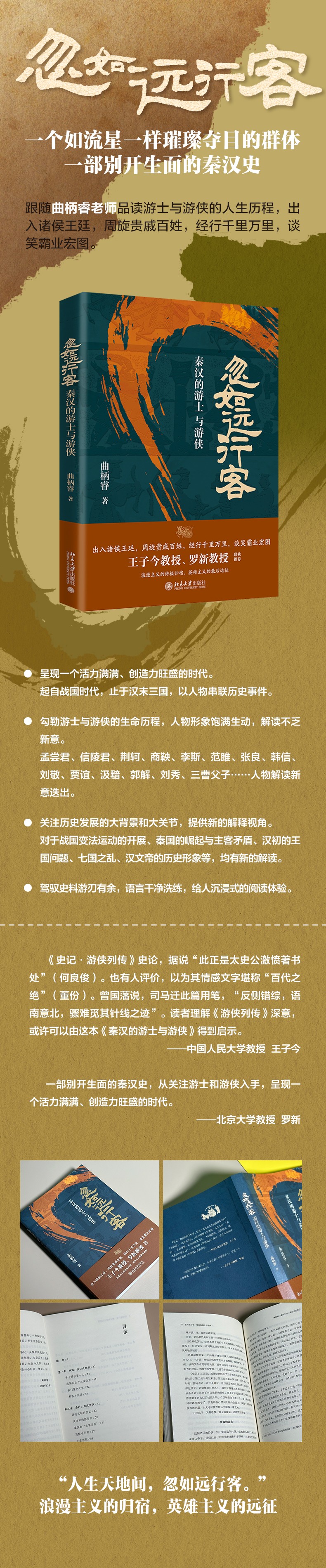 本书叙述了秦汉时代游士与游侠兴起又渐趋消亡的过程,描绘了这一时期广阔的历史图景和多彩的社会风尚。在关注历史运动的大背景和大关节的同时,将学术研究和非虚构写作有机结合起来,对于范雎、张良、韩信、刘敬、贾谊、汲黯、郭解等前人虽有了解但又缺少细致解读的人物,由心理历程到生命历程,做了深入挖掘和解析,构建起了一个又一个鲜活丰满的人物形象;对于诸如战国变法运动的开展、秦国的主客矛盾、汉初的王国、汉文帝的历史形象等学界虽有讨论但尚无定论的问题,本书提供了新的解释视角。