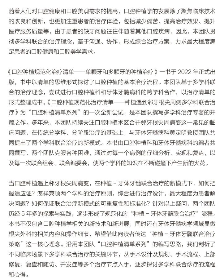 2.本书为“口腔种植清单系列”第二本,延续系列风格,每个治疗程序后均以清单加以总结。
