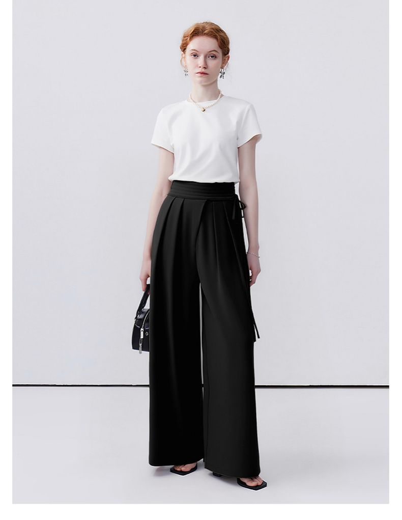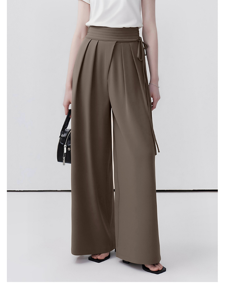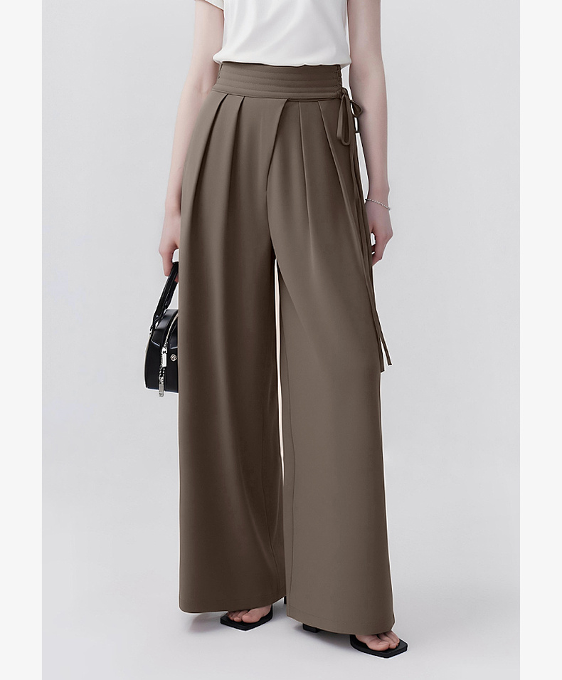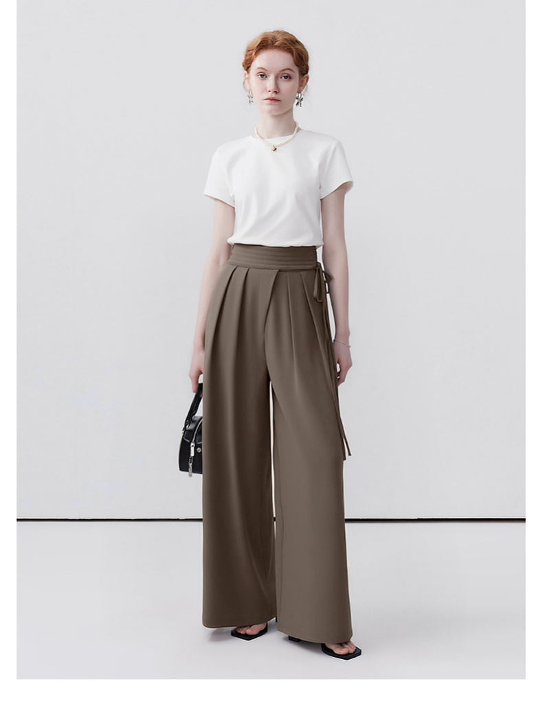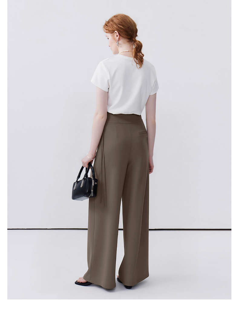 天猫同步【版型赞!垂感显瘦】拉夏贝尔/La Chapelle交叉系带双扣阔腿裤女高腰压褶通勤时尚高级感休闲裤