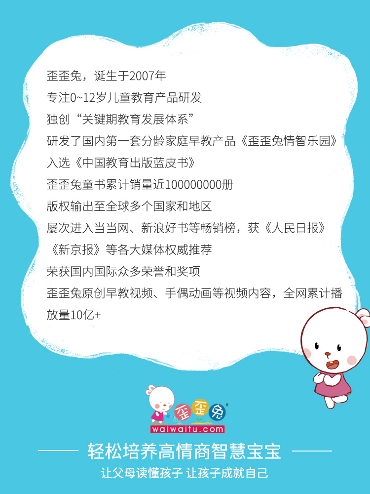 - 歪歪兔,诞生于2007年,专注0-12岁儿童教育产品研发。原创童书销量逾1亿册,音视频播放总量10亿+。