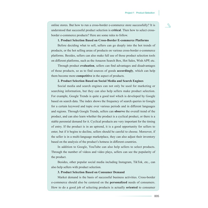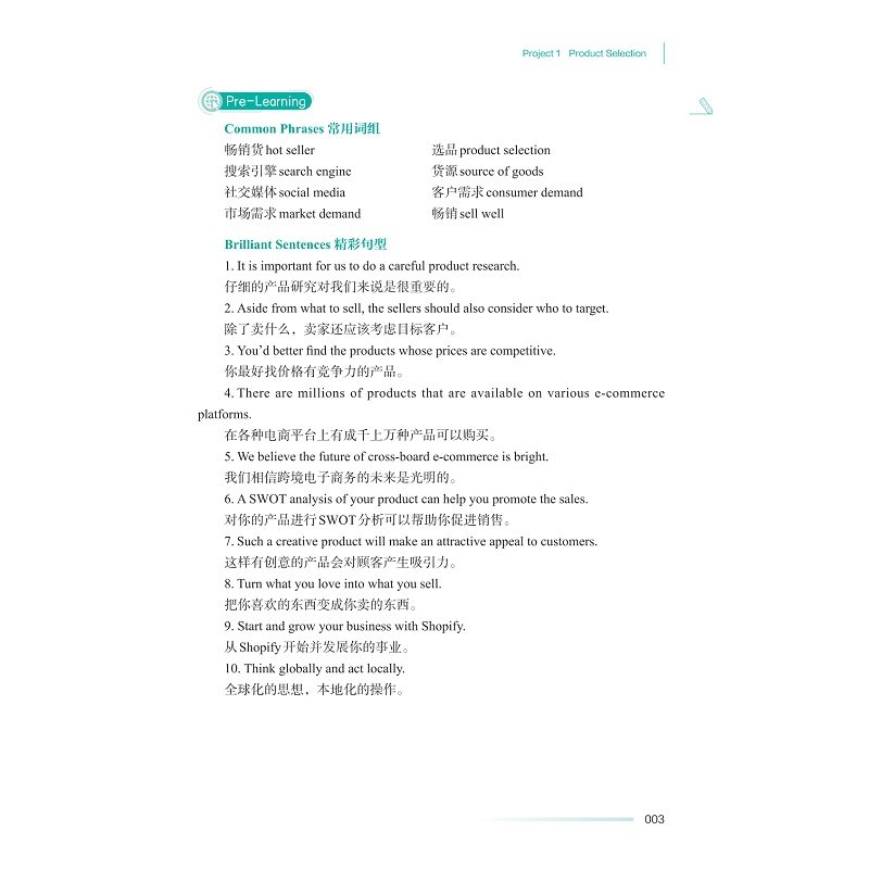 跨境电子商务英语为跨境电商专业的基础课程,主要以跨境电商平台的售前、售中、售后服务所涉及的英语技能主线,内容包括跨境电商专业术语、商务约会、商务洽谈、商务合同、商务信函、产品销售与退换等语言和文字沟通涉及的英语技能。有助于训练和提升学生的英语商务写作能力及英语语言交流能力。全书以英语实践技能为主体的结构,设计了以学生为中心的活动,推出了以任务为引领的教学模式。以英语能力培养为基础,跨境电商职业技能培养为主线,复合型应用能力为核心,使学生具备扎实的理论基础、专业知识,同时具备较强的实践能力和专业技能,能够使用英语熟练操作跨境电商平台,成为熟悉跨境电商相关业务的高素质复合型人才。