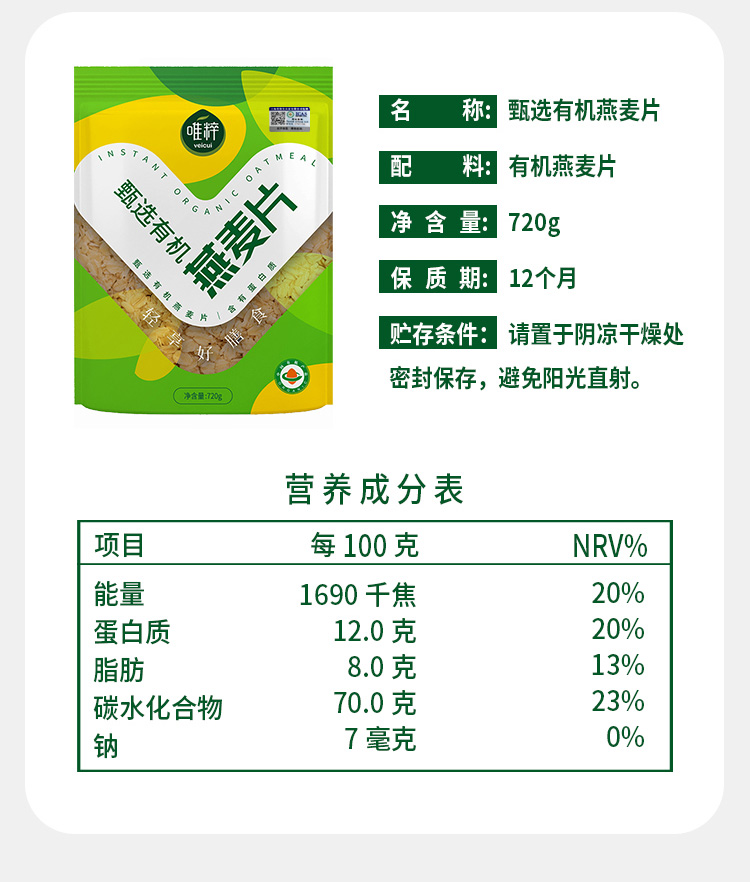唯粹甄选有机燕麦片720g