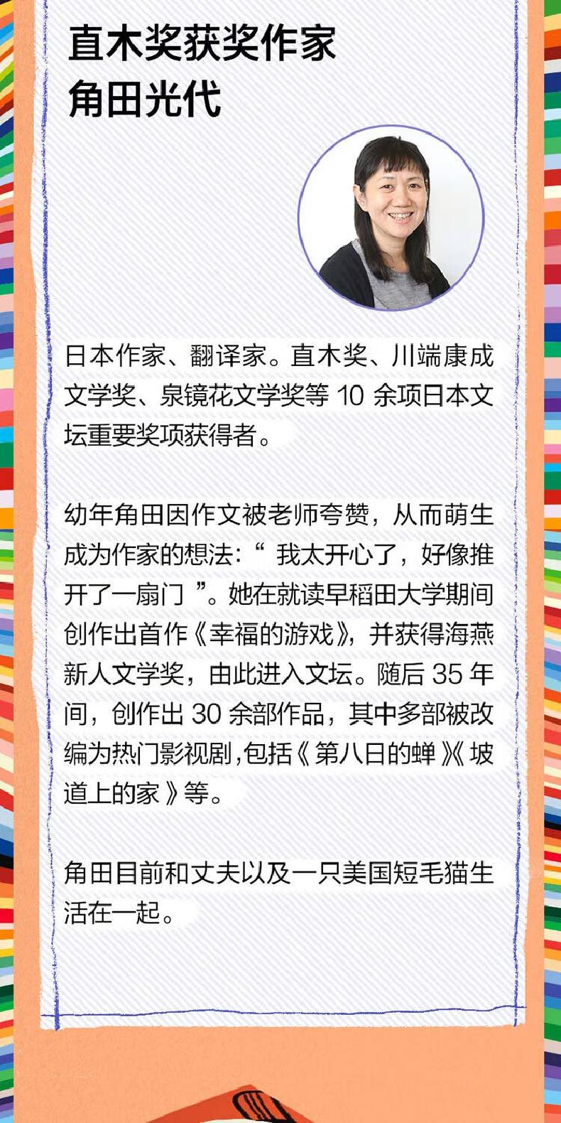 角田光代,著,日本作家、翻译家。直木奖、川端康成文学奖、泉镜花文学奖等10余项日本文坛重要奖项获得者。幼年角田因作文被老师夸赞,从而萌生成为作家的想法:“我太开心了,好像推开了一扇门”。她在就读早稻田大学期间创作出首作《幸福的游戏》,并获得海燕新人文学奖,由此进入文坛。随后35年间,创作出30余部作品,其中多部被改编为热门影视剧,包括《第八日的蝉》《坡道上的家》等。