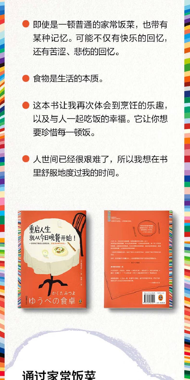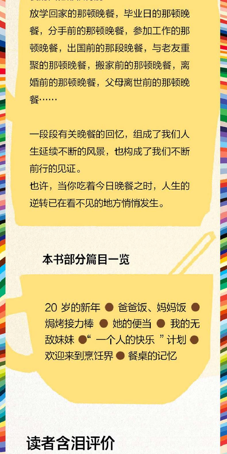 放学回家的那顿晚餐,毕业日的那顿晚餐,分手前的那顿晚餐,参加工作的那顿晚餐,出国前的那段晚餐,与老友重聚的那顿晚餐,搬家前的那顿晚餐,离婚前的那顿晚餐,父母离世前的那顿晚餐……