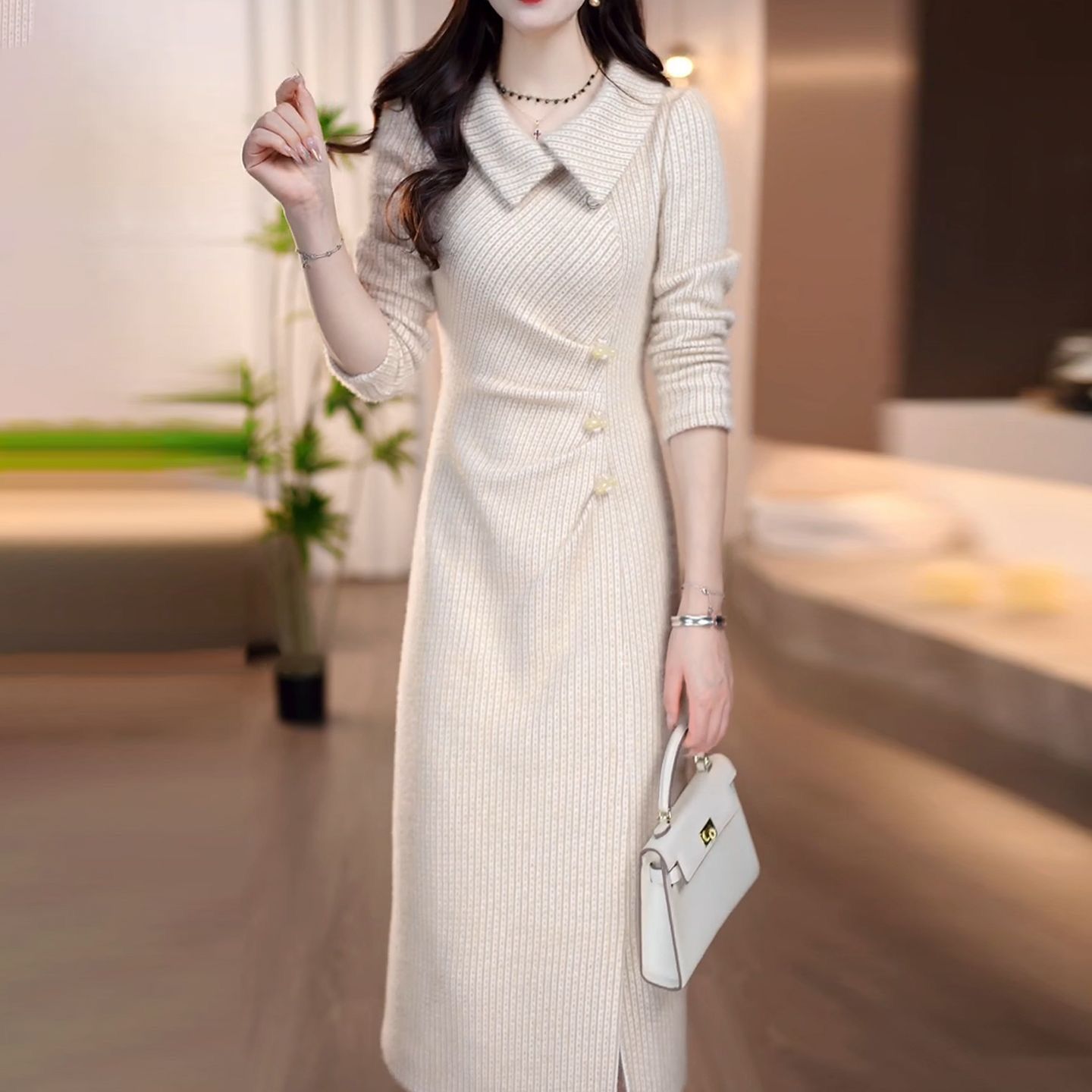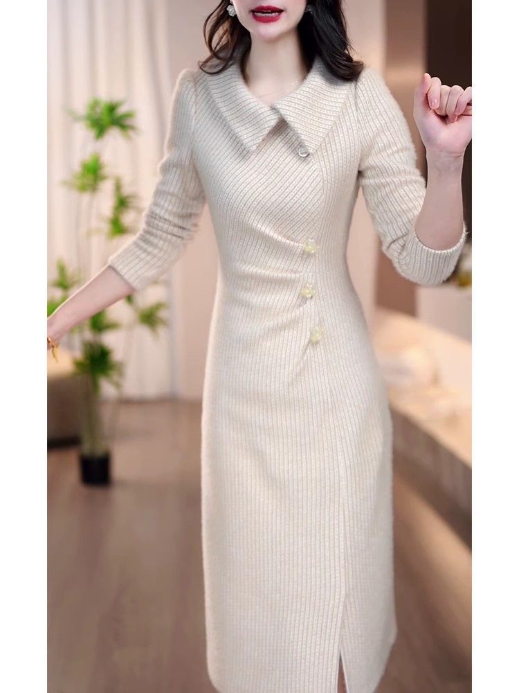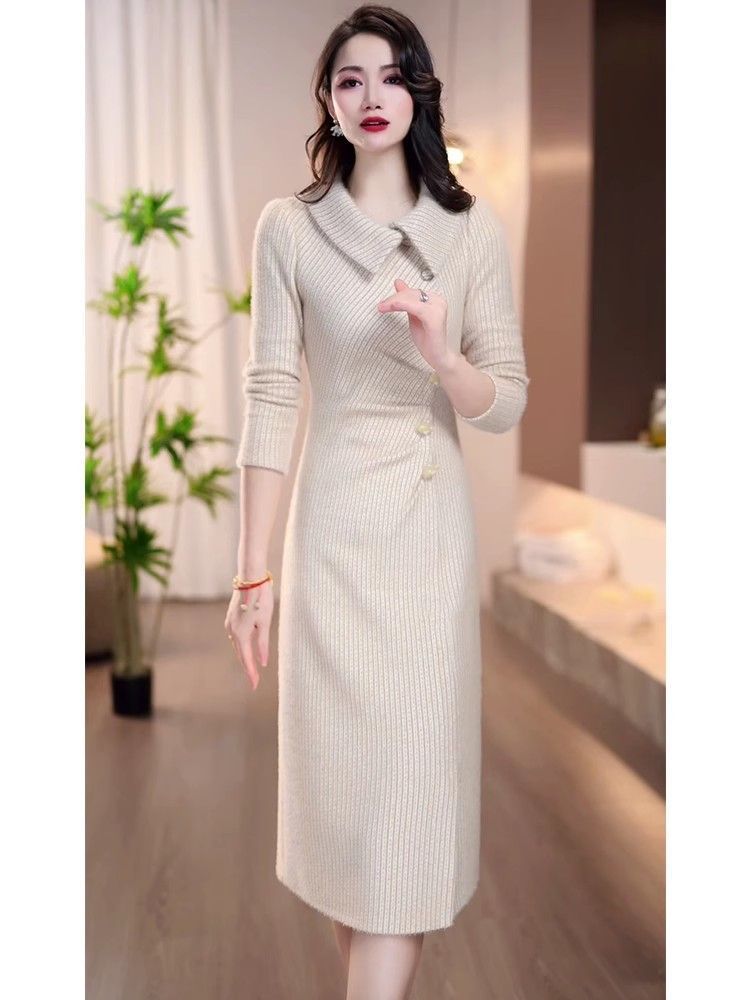 QYM C537洋气交叉翻领优雅大气收腰显瘦连衣裙 商品图1