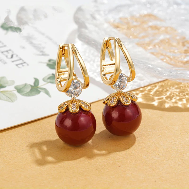 复古高级感酒红色珍珠耳扣新款气质独特日常时尚百搭镶钻耳环耳饰