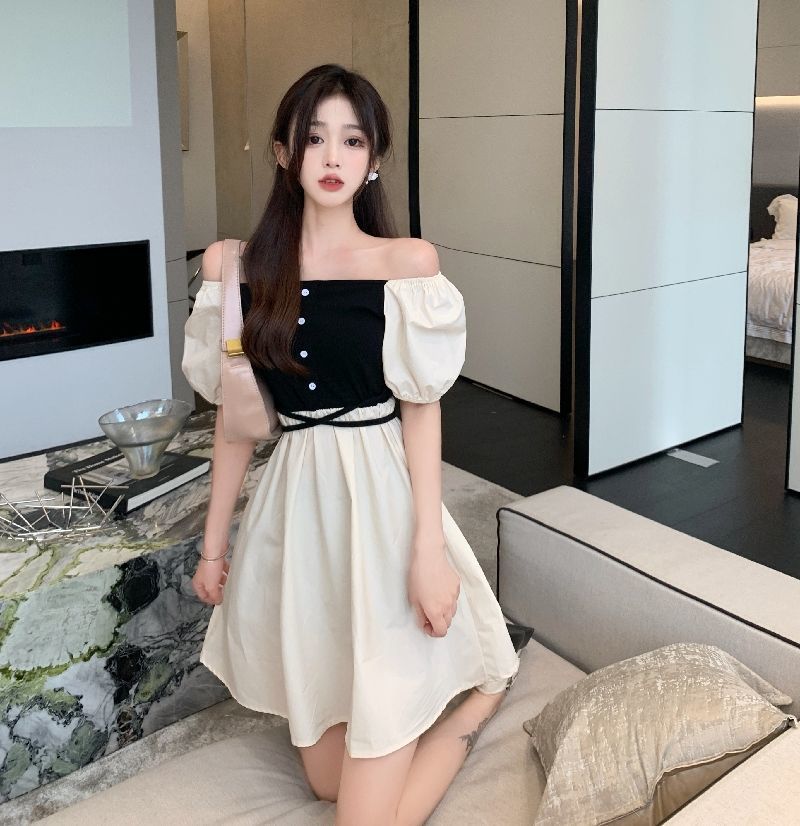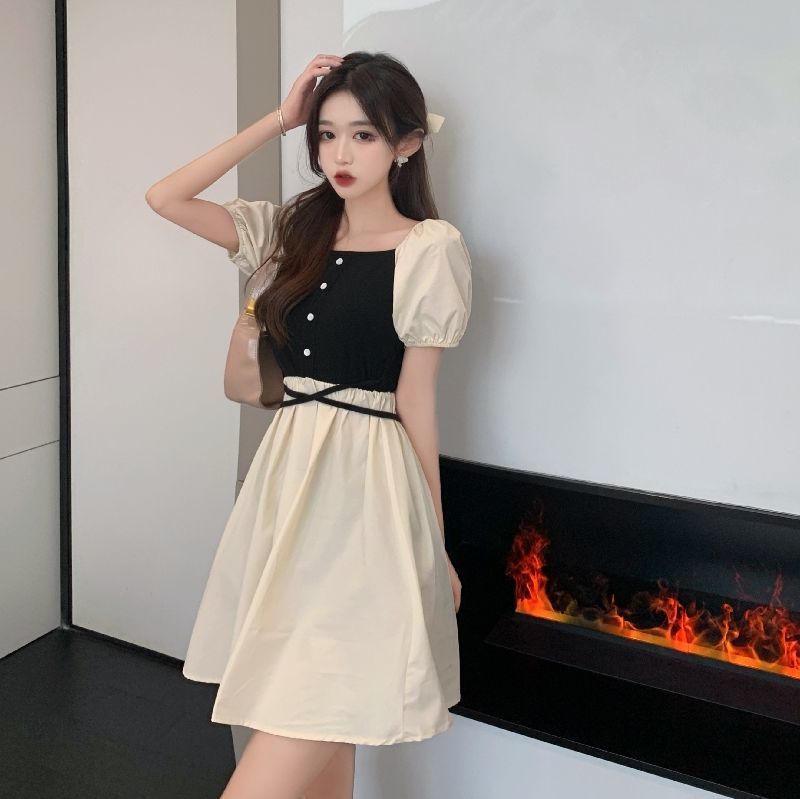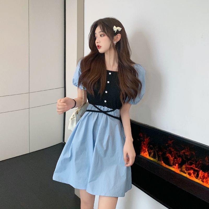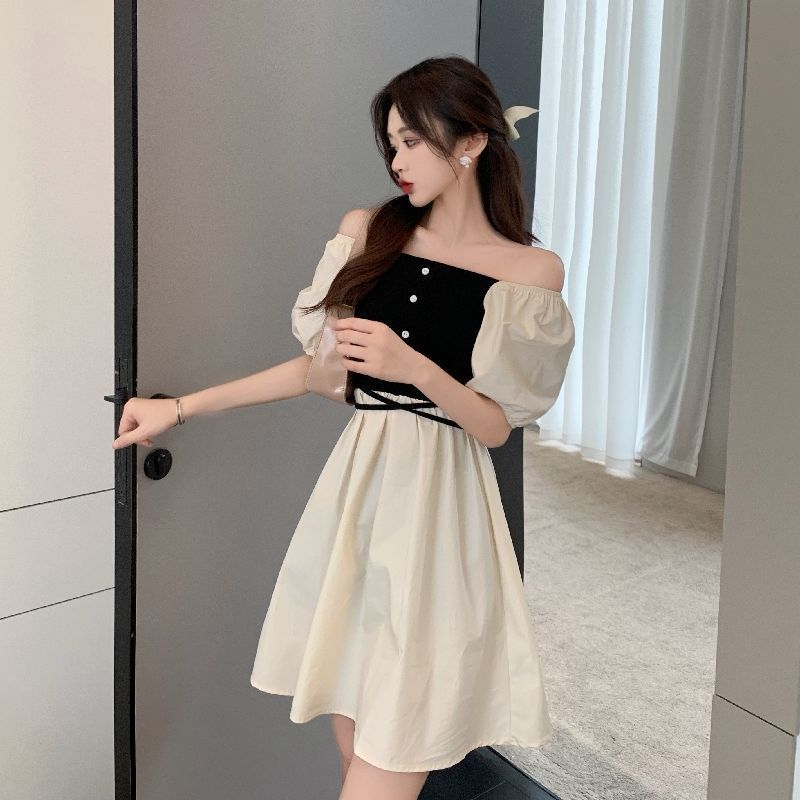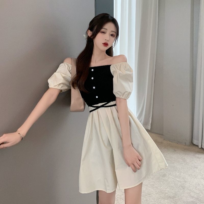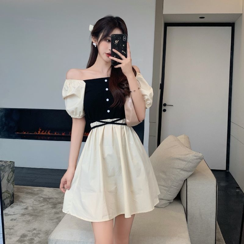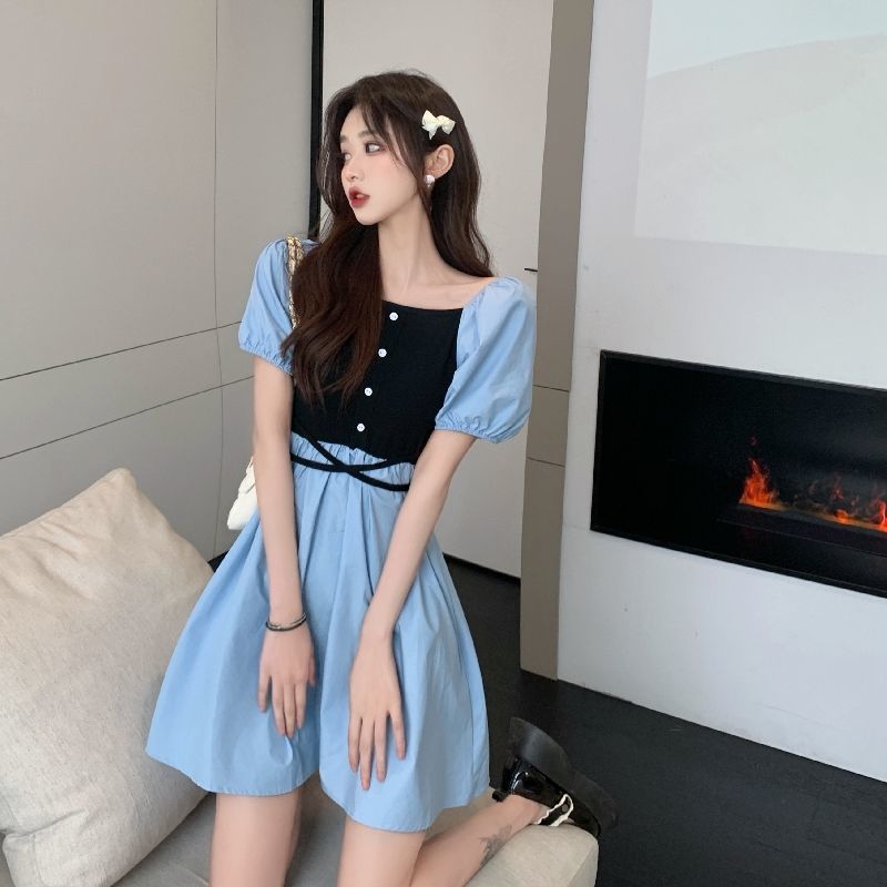 黛唯梵温柔风茶歇桔梗裙2022新款方领法式初恋公主风一字领连衣裙女夏天