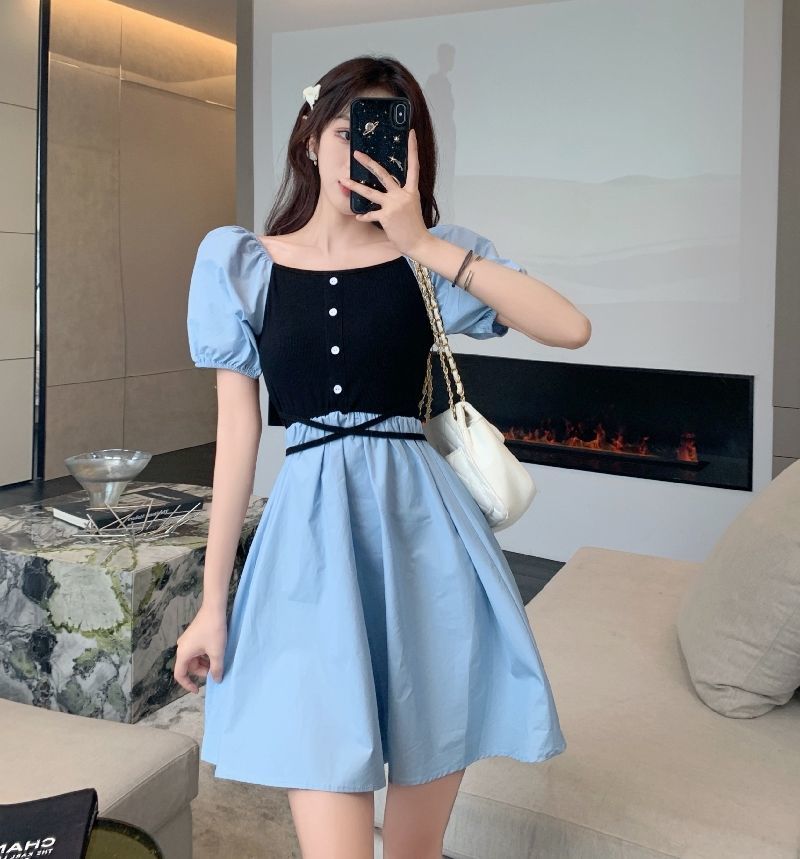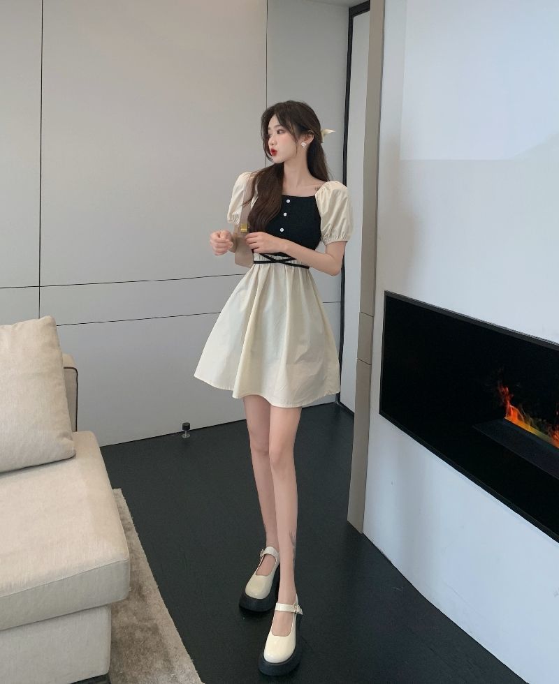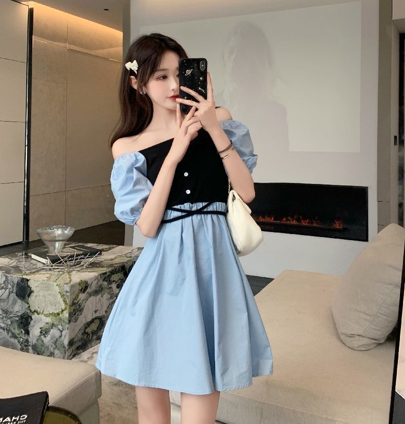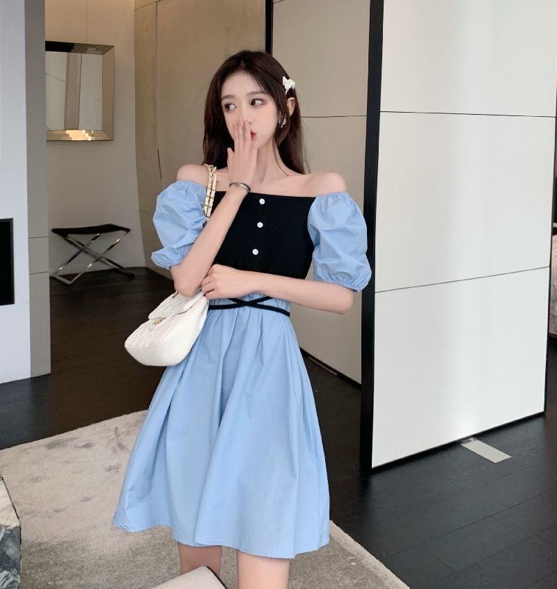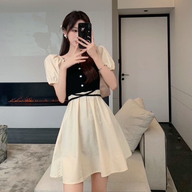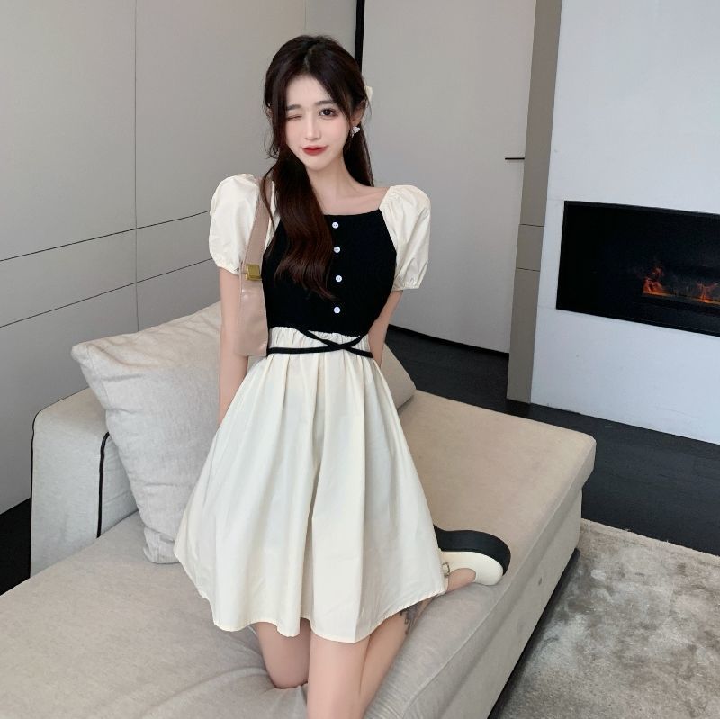 黛唯梵温柔风茶歇桔梗裙2022新款方领法式初恋公主风一字领连衣裙女夏天