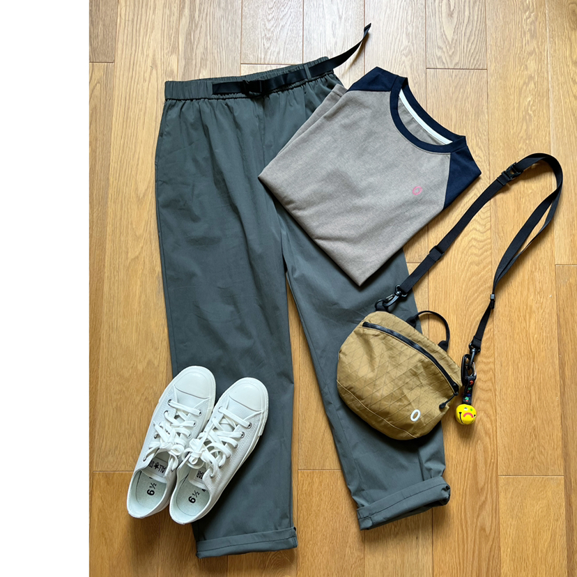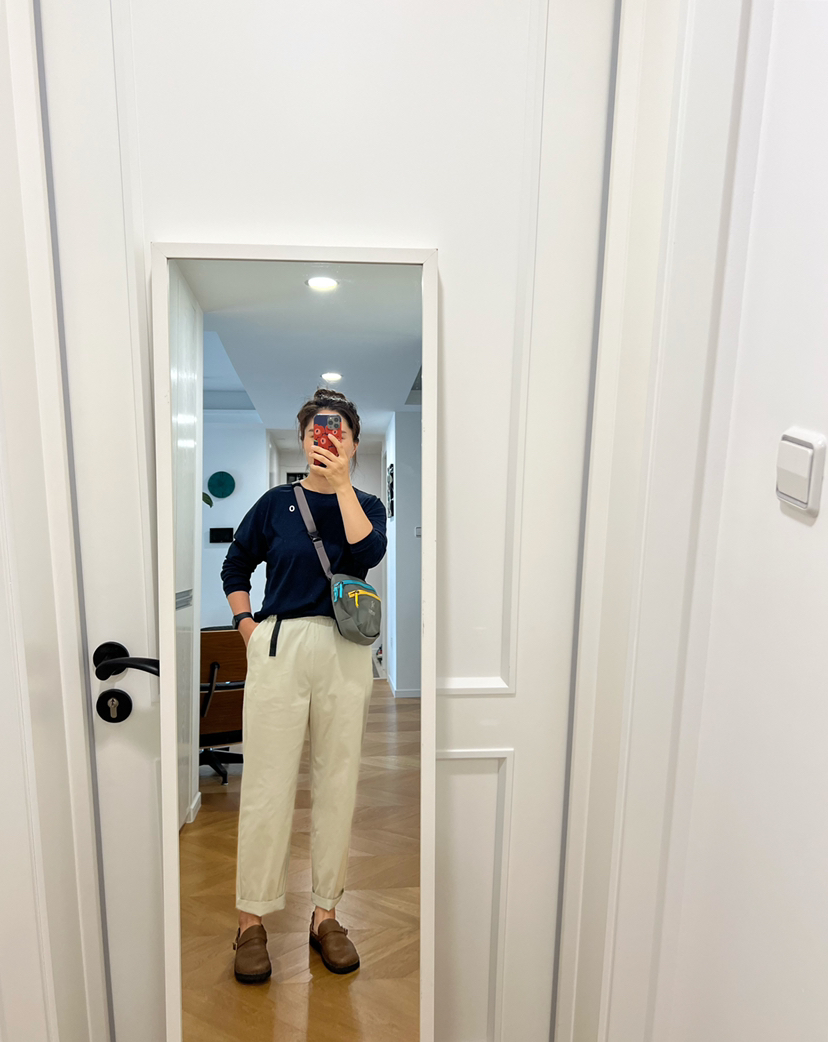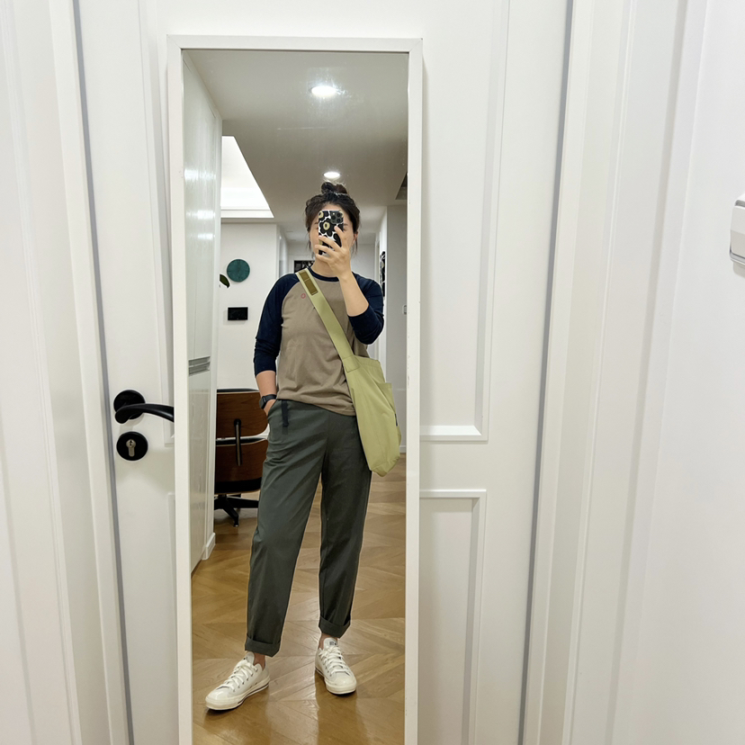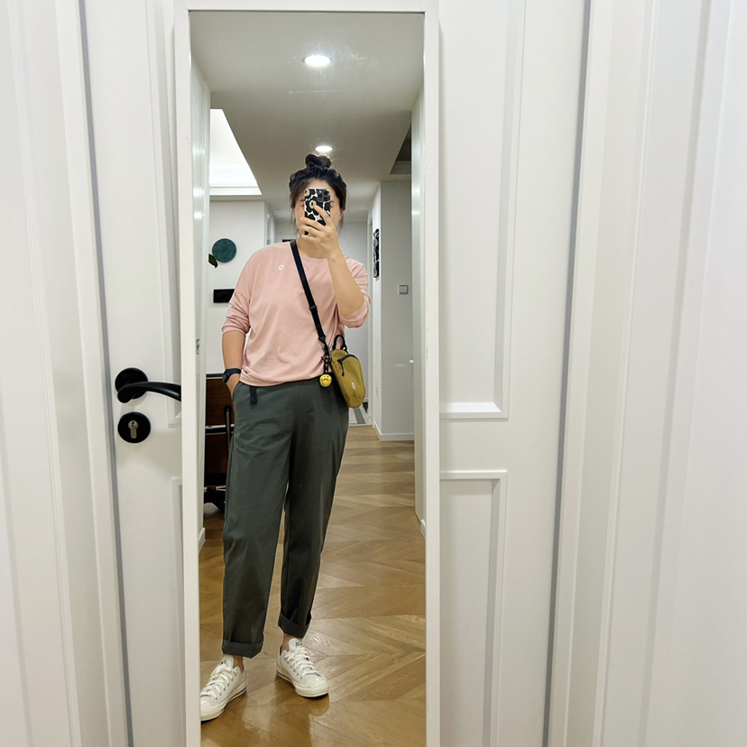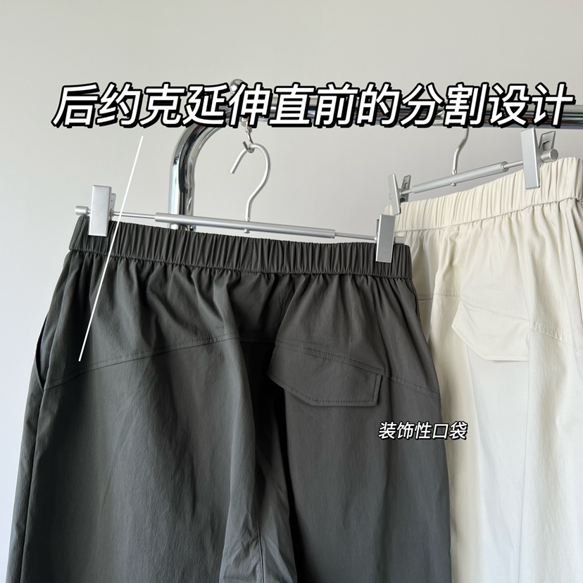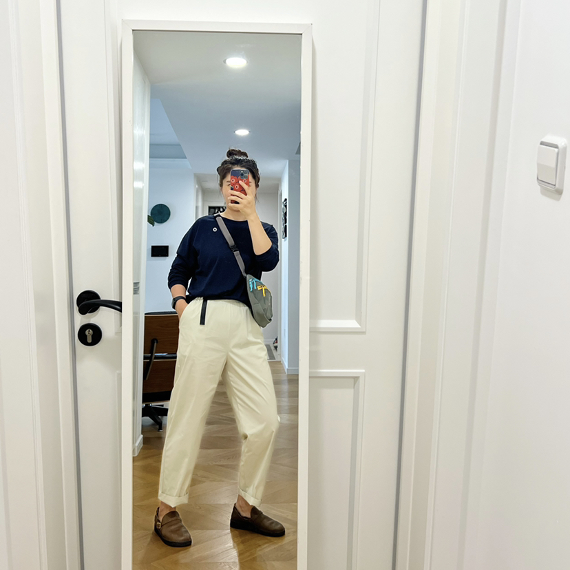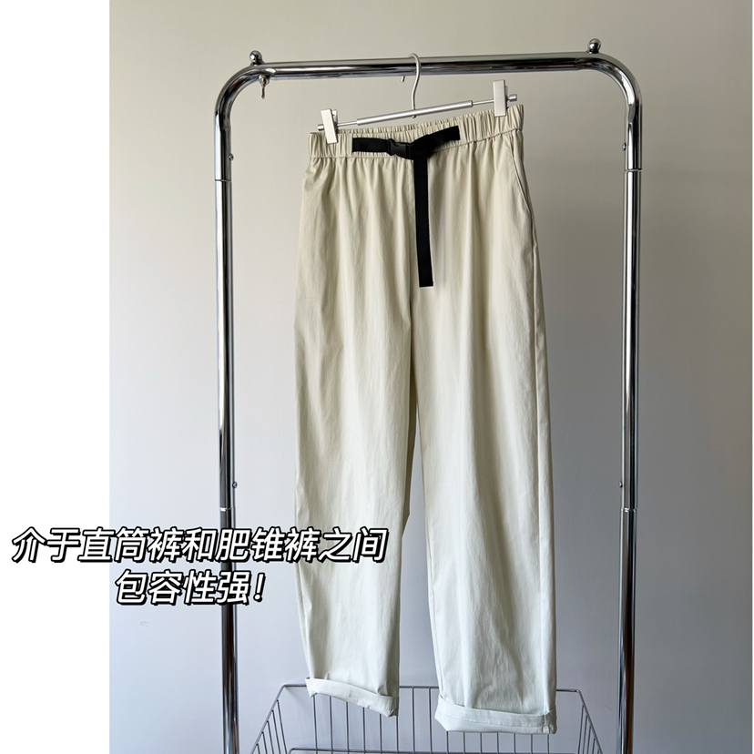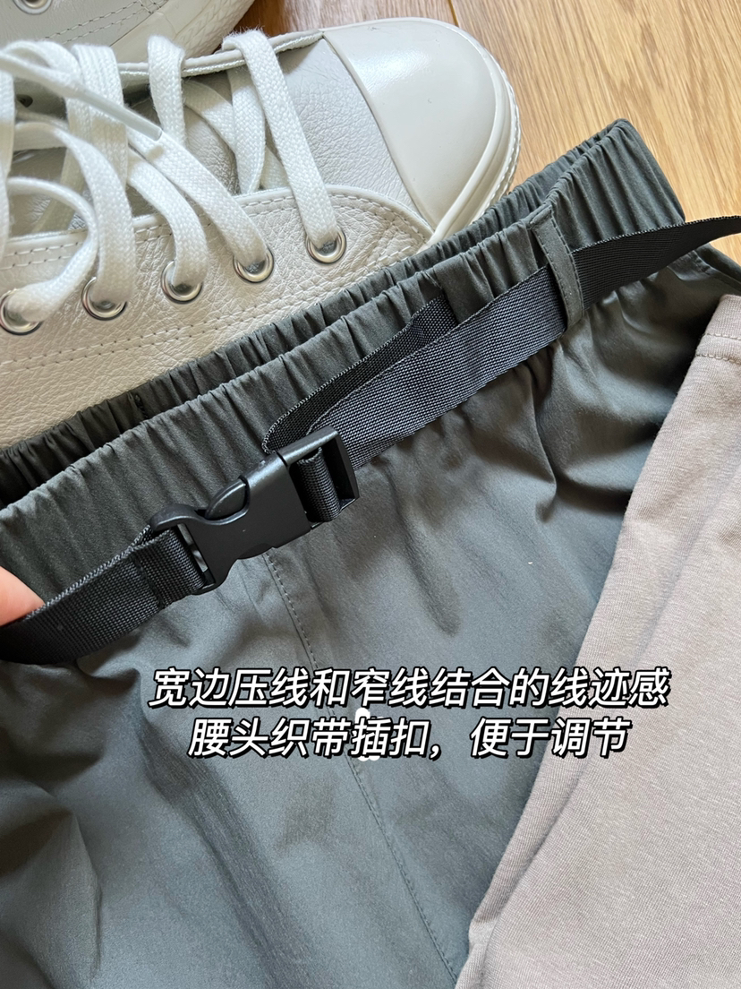 面料不是厚的是薄薄的速干面料,但又不会薄如蝉翼。适合春末+整个夏天+初秋,介于直筒裤和肥锥裤之间,包容性强!宽边压线和窄线结合的线迹感腰头织带插扣,便于调节。后面的口袋是装饰的,整条裤子很轻便和耐穿,日常上下班+休闲+出游露营爬山都可以啊!品质不错的白菜价裤子。鸭蛋皮色=带一点点绿调的米白色,很是耐看!!