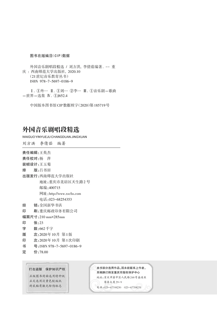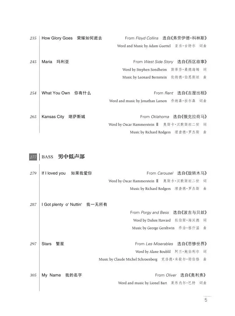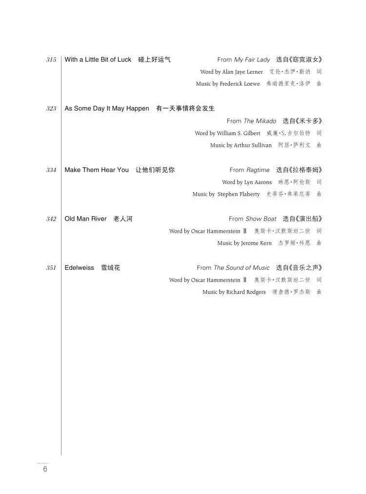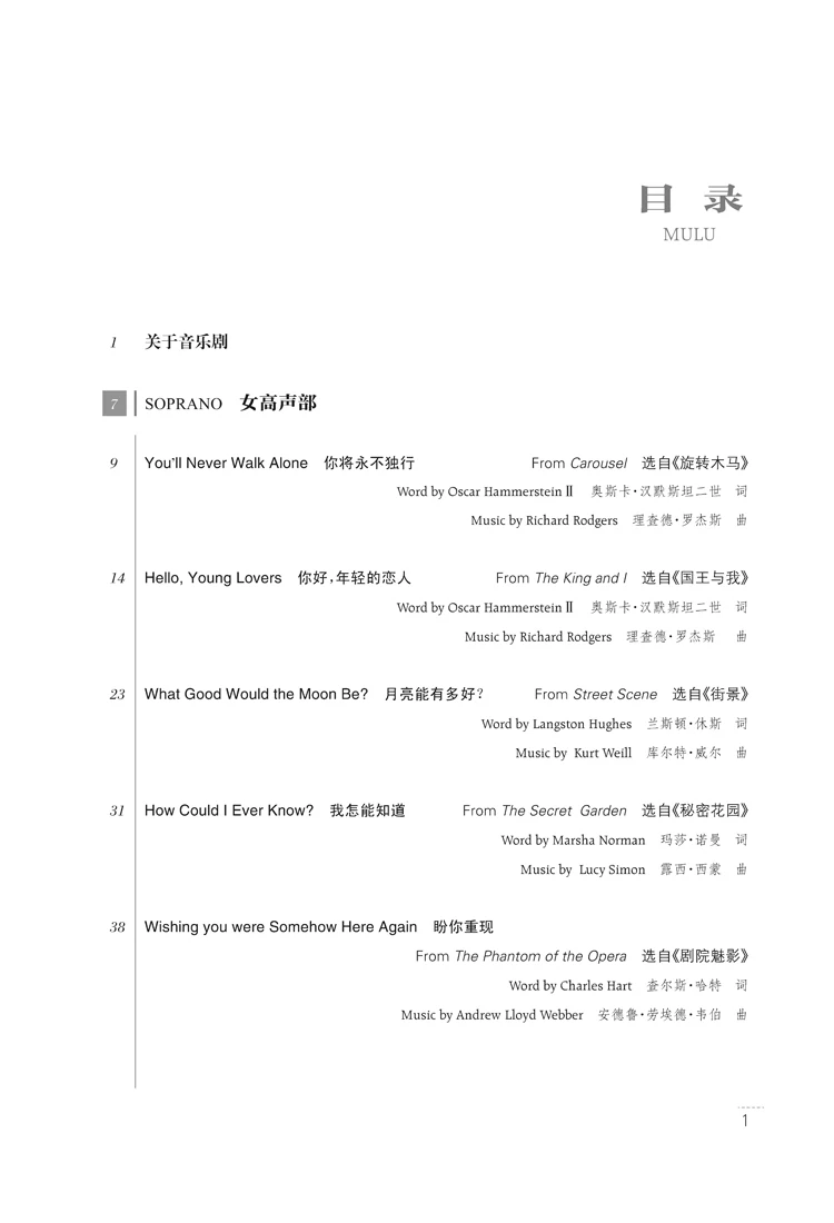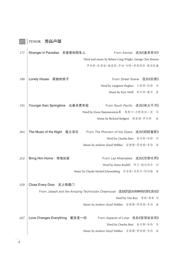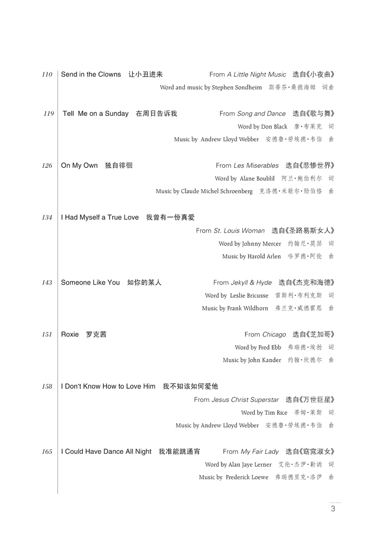 音乐剧是20世纪出现的一门新兴的综合舞台艺术,是声乐演唱或学习者歌唱训练中的一个必经环节,尤为重要。本书选取了外国经典音乐剧唱段41首,其中包括女高音声部11首,如选自《维纳斯的一触》的《轻声低语》、选自《波吉与贝丝》的《夏季里》等;女中低音声部10首,如选自《窈窕淑女》的《我准能跳通宵》、选自《歌与舞》的《在周日告诉我》等;男高音声部11首,如选自《街景》的《孤独的房子》、选自《爱情面面观》的《爱改变一切》等;男中低音声部9首,如选自《卡鲁索》的《如果我爱你》、选自《拉格泰姆》的《让他们听见你》等。全书曲目顺序根据演唱和教学需要,按声部分类、演唱程度按照循序渐进原则进行排列,各声部选曲数量均衡。作者对音乐剧的概念、发展、特点和风格作了简要概述,对每首作品的剧情、场景等作了详细介绍,对歌词作了准确翻译,可以更好地满足学习者演唱和教学需要。本教材可供各层次声乐学习者学习使用。