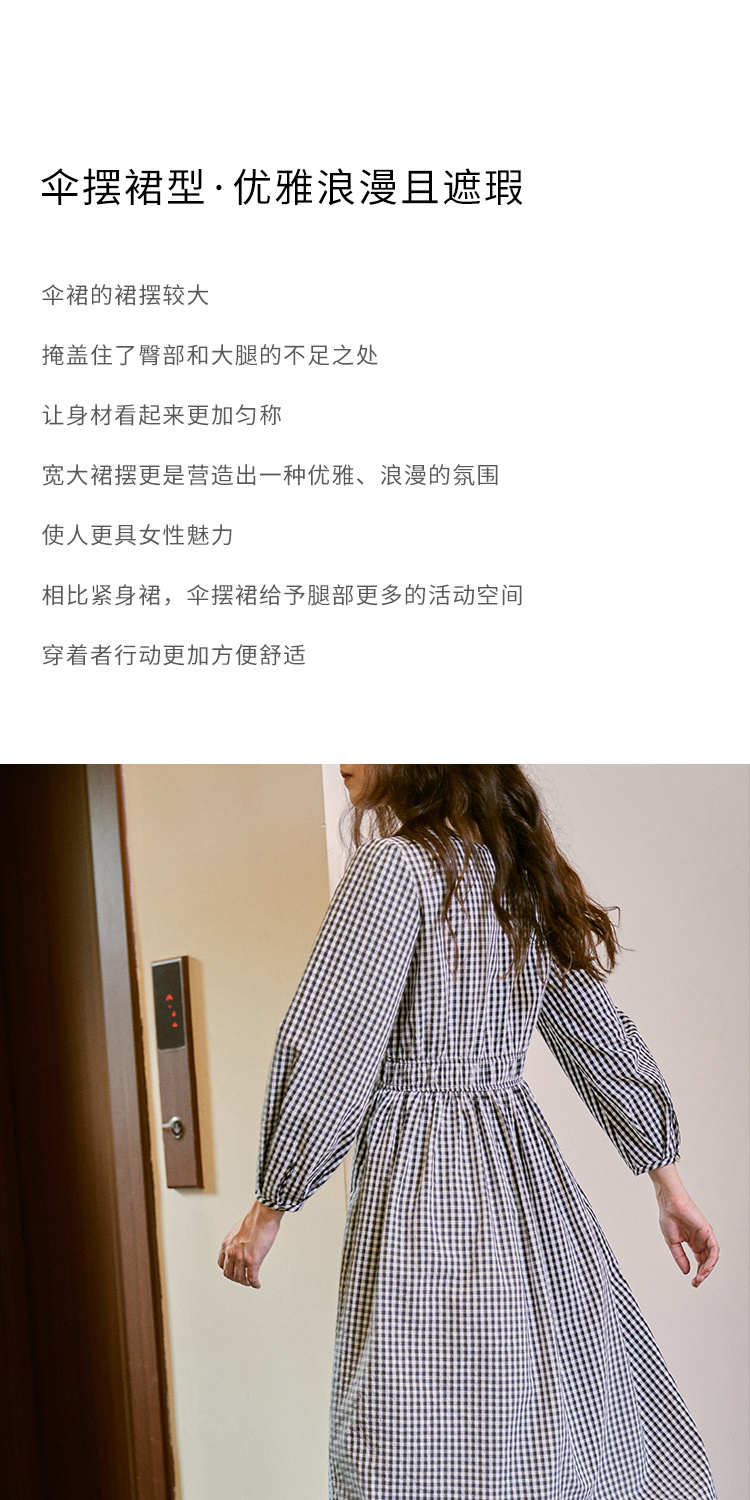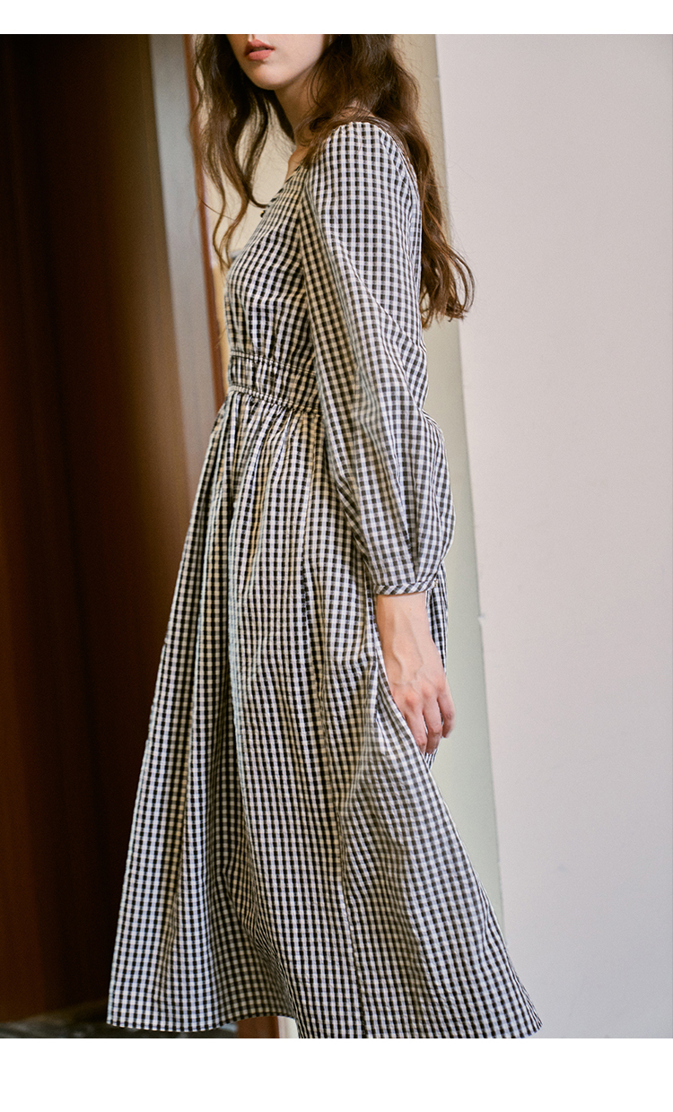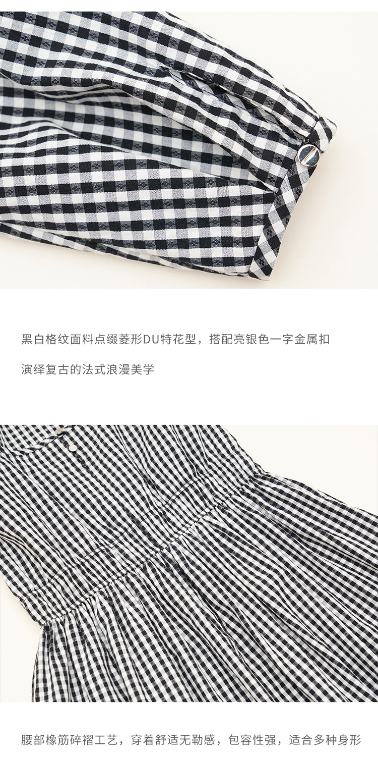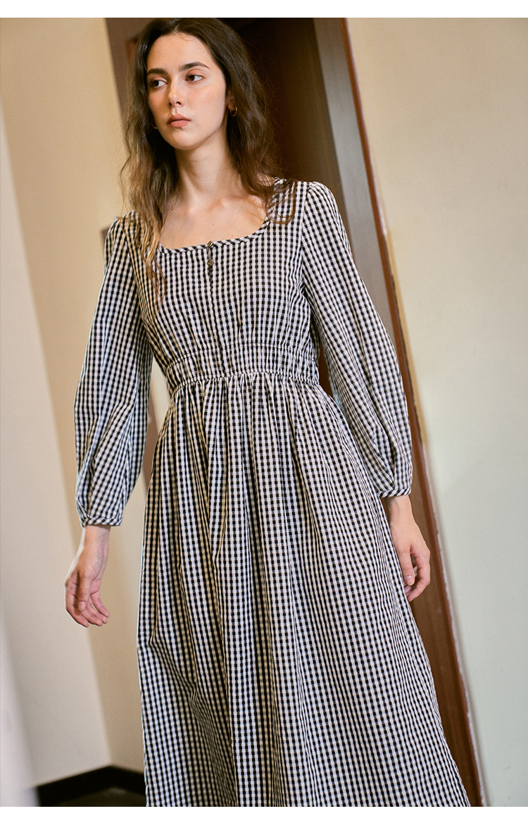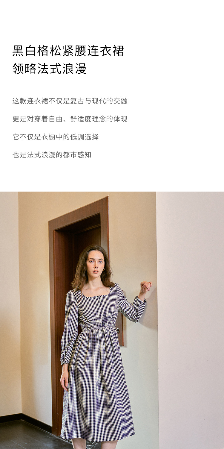 HeyDress复古黑白格连衣裙女秋季抽褶收腰设计法式浪漫长袖裙子