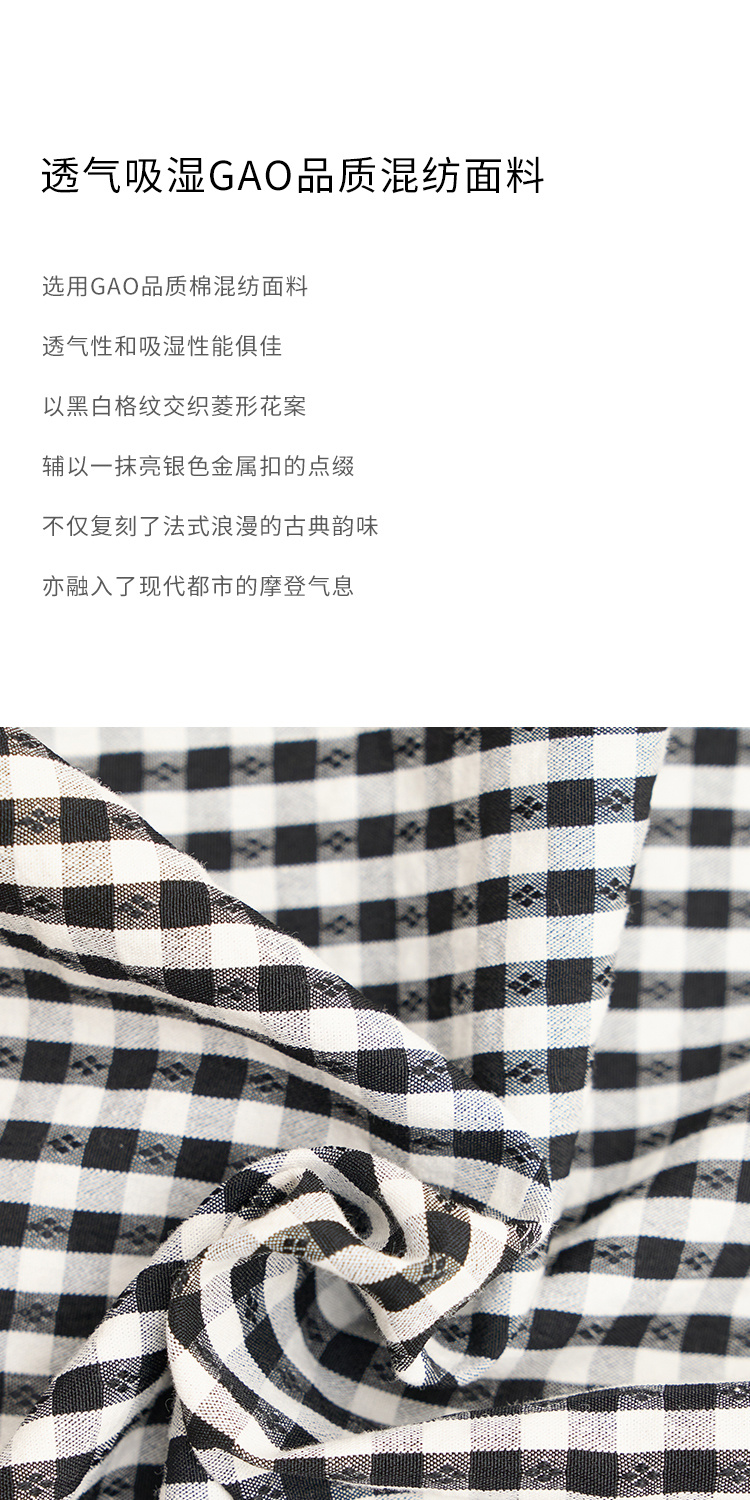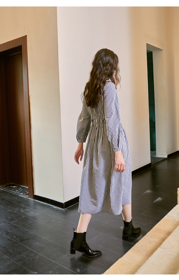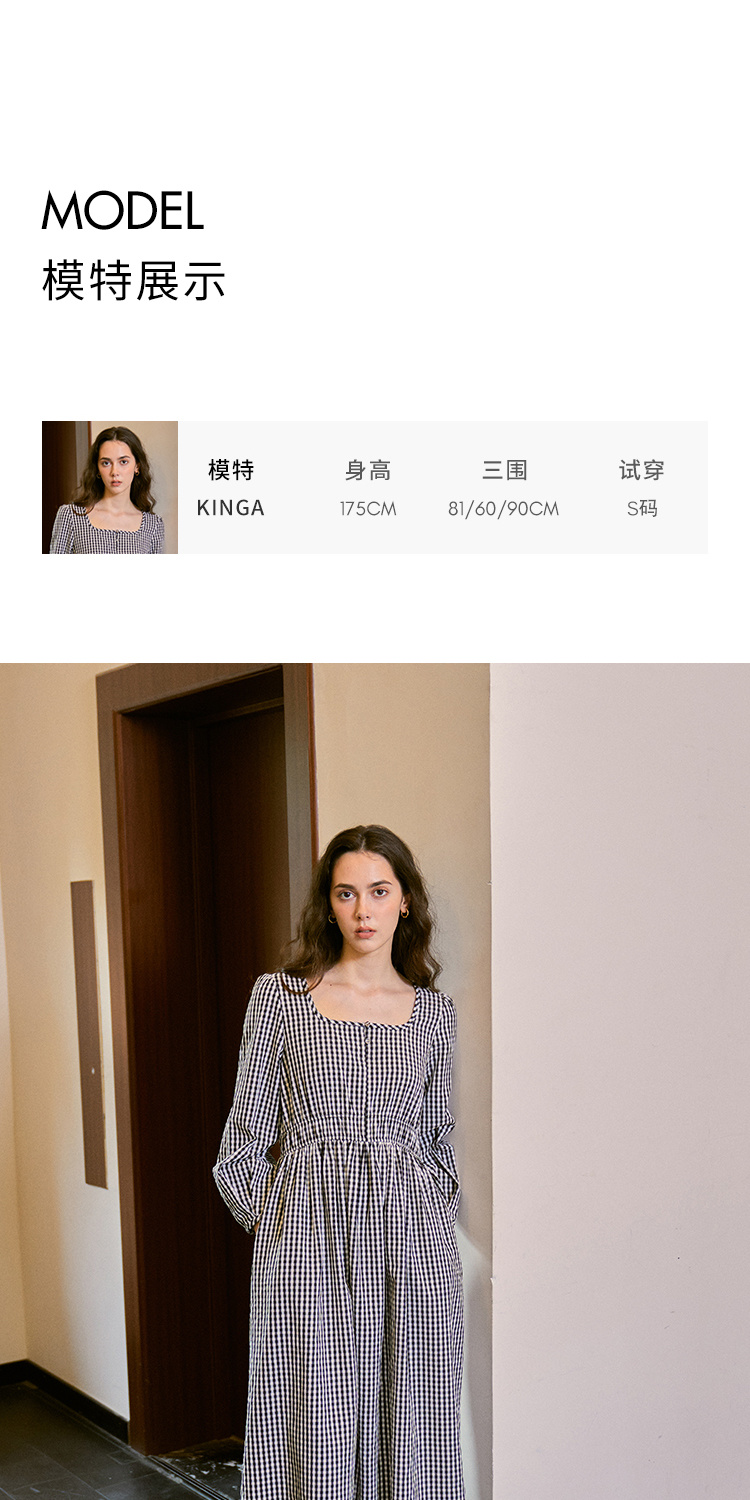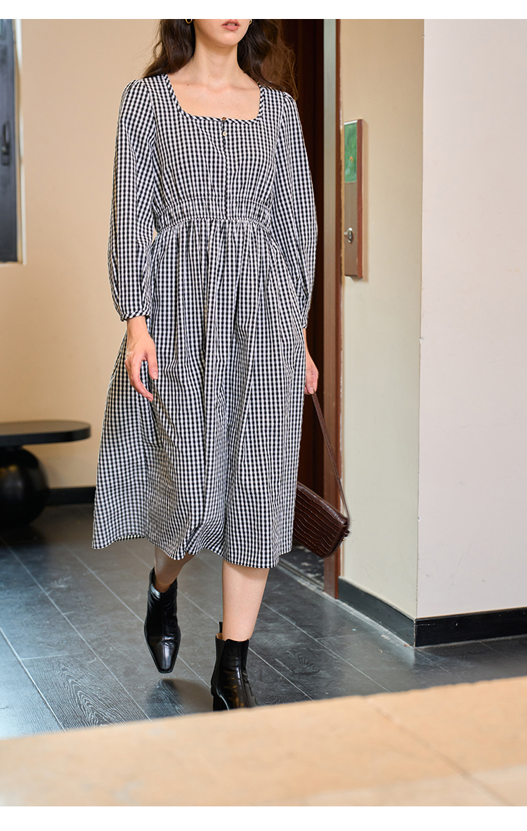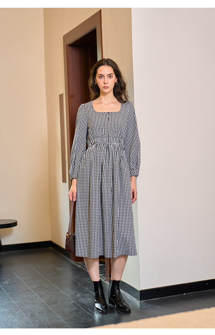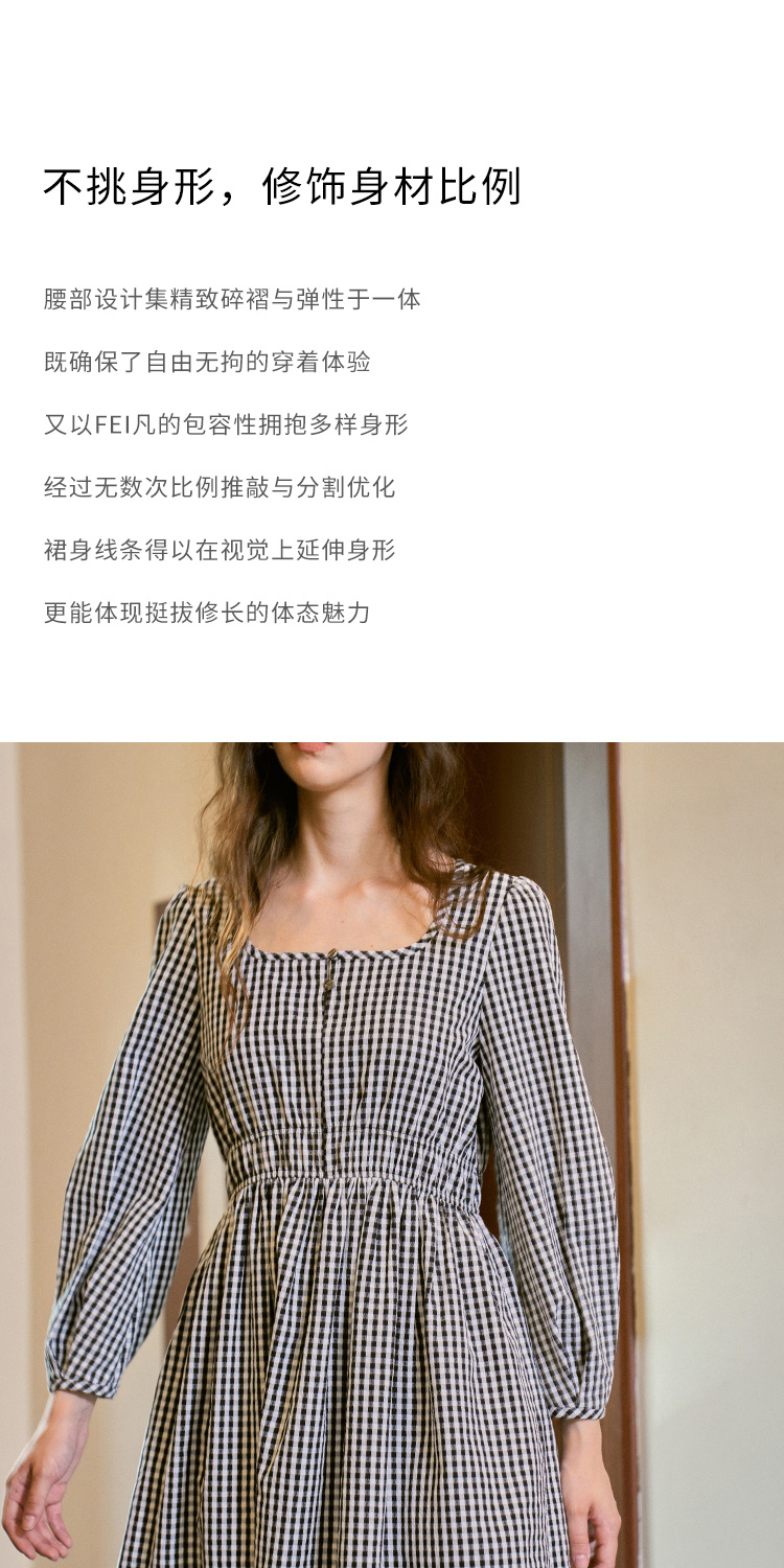 HeyDress复古黑白格连衣裙女秋季抽褶收腰设计法式浪漫长袖裙子