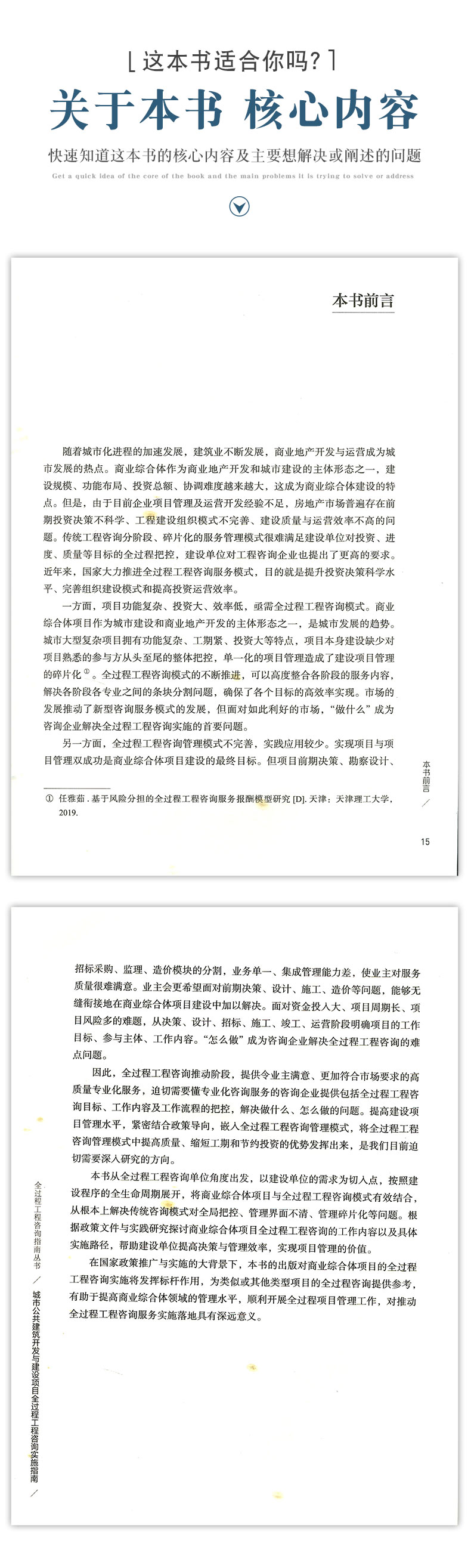 随着城市化进程的加速发展,建筑业不断发展,商业地产开发与运营成为城市发展的热点。商业综合体作为商业地产开发和城市建设的主体形态之一,建设规模、功能布局、投资总额、协调难度越来越大成为商业综合体建设的特点。但是,由于目前企业项目管理及运营开发经验不足,房地产市场普遍存在前期投资决策不科学、工程建设组织模式不完善、建设质量与运营效率不高的问题。传统工程咨询分阶段、碎片化的服务管理模式很难满足建设单位对投资、进度、质量等目标的全过程把控,建设单位对工程咨询企业也提出了更高的要求。近年来,国家大力推进全过程工程咨询服务模式,目的就是提升投资决策科学水平、完善组织建设模式和提高投资运营效率。从实务细节上详细介绍了全过程工程咨询的依据、咨询服务内容、操作流程和注意事项以及重难点分析,为各方开展全过程工程咨询提供业务操作和考核的操作指南。主要针对于工程咨询领域的读者,本书定位于专业应用型图书,为读者学习了解全过程工程咨询的实际应用,掌握全过程工程咨询操作技能提供全面的指引。