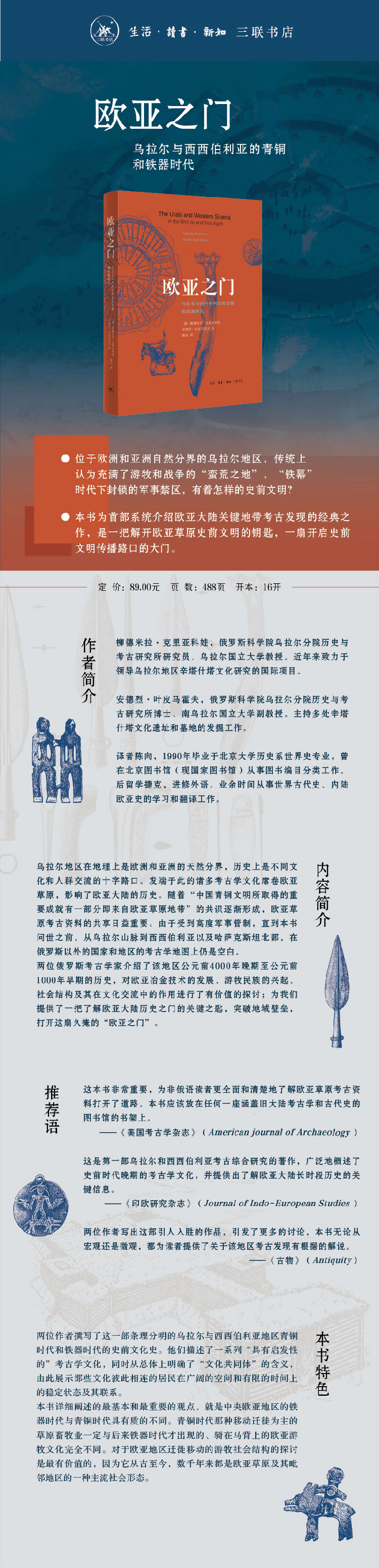 两位俄罗斯考古学家介绍了该地区公元前4000年晚期至公元前1000年早期的历史,对欧亚冶金技术的发展、游牧民族的兴起、社会结构及其在文化交流中的作用进行了有价值的探讨;为我们提供了一把了解欧亚大陆历史之门的关键之匙,突破地域壁垒,打开这扇久掩的“欧亚之门”。