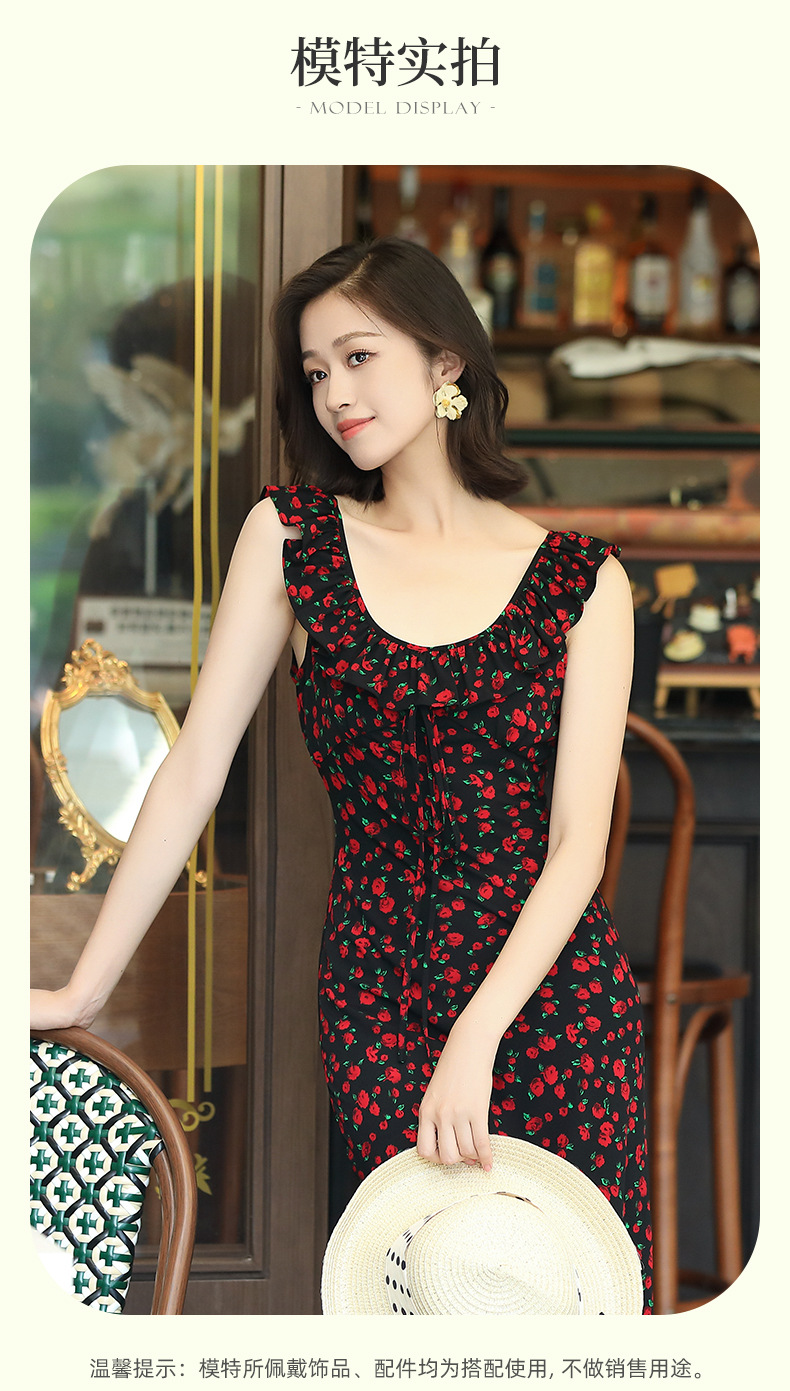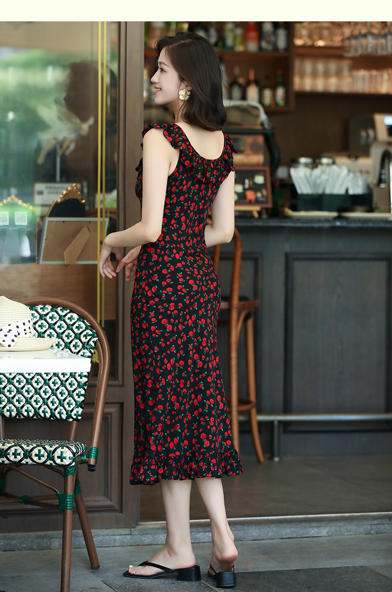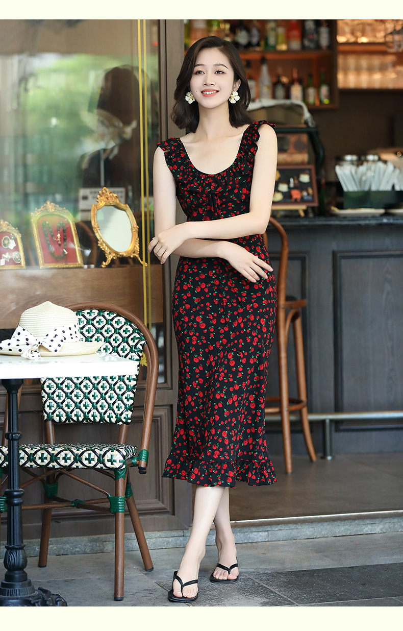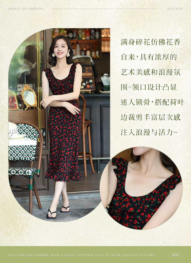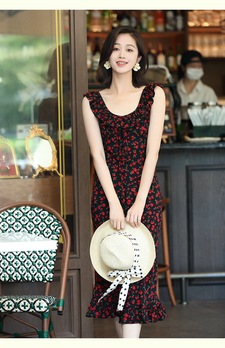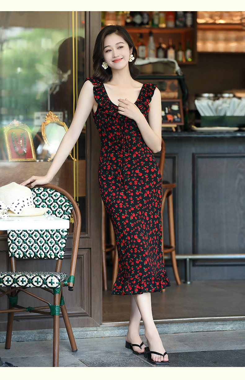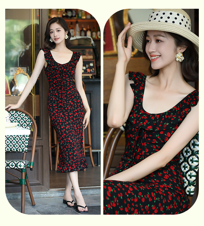 OY-24508夏季新款碎花无袖连衣裙优雅红色显瘦修身吊带鱼尾裙24508