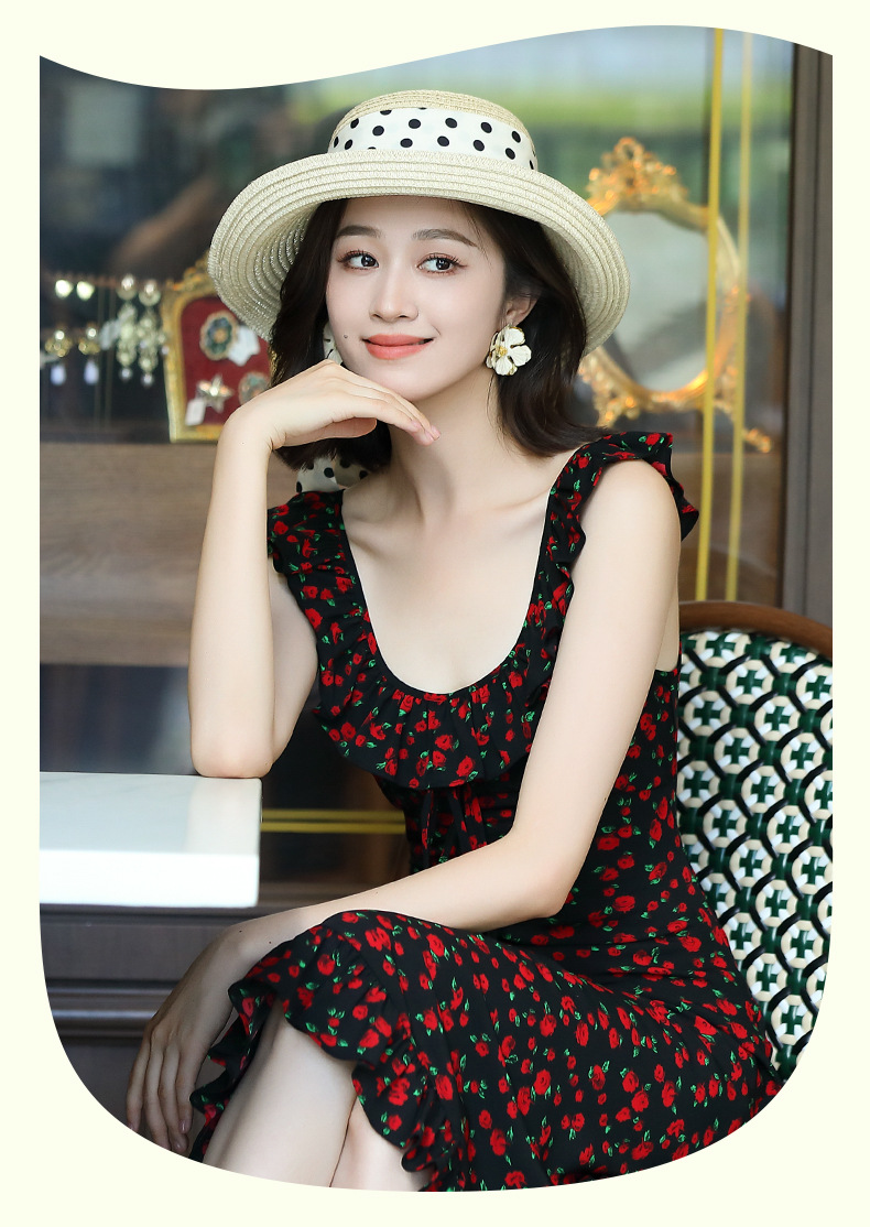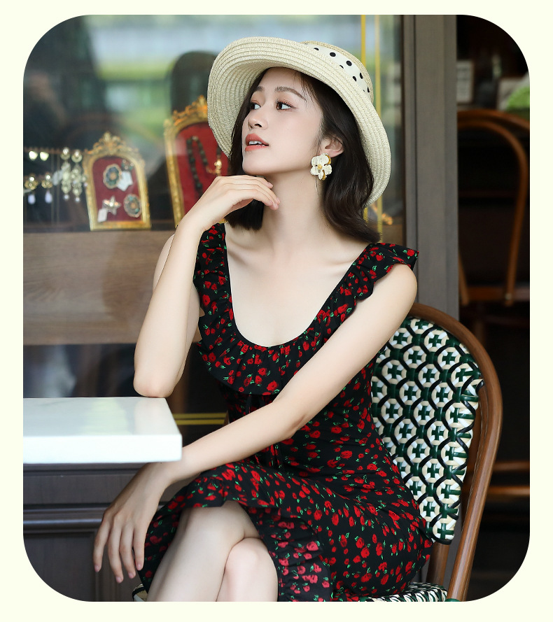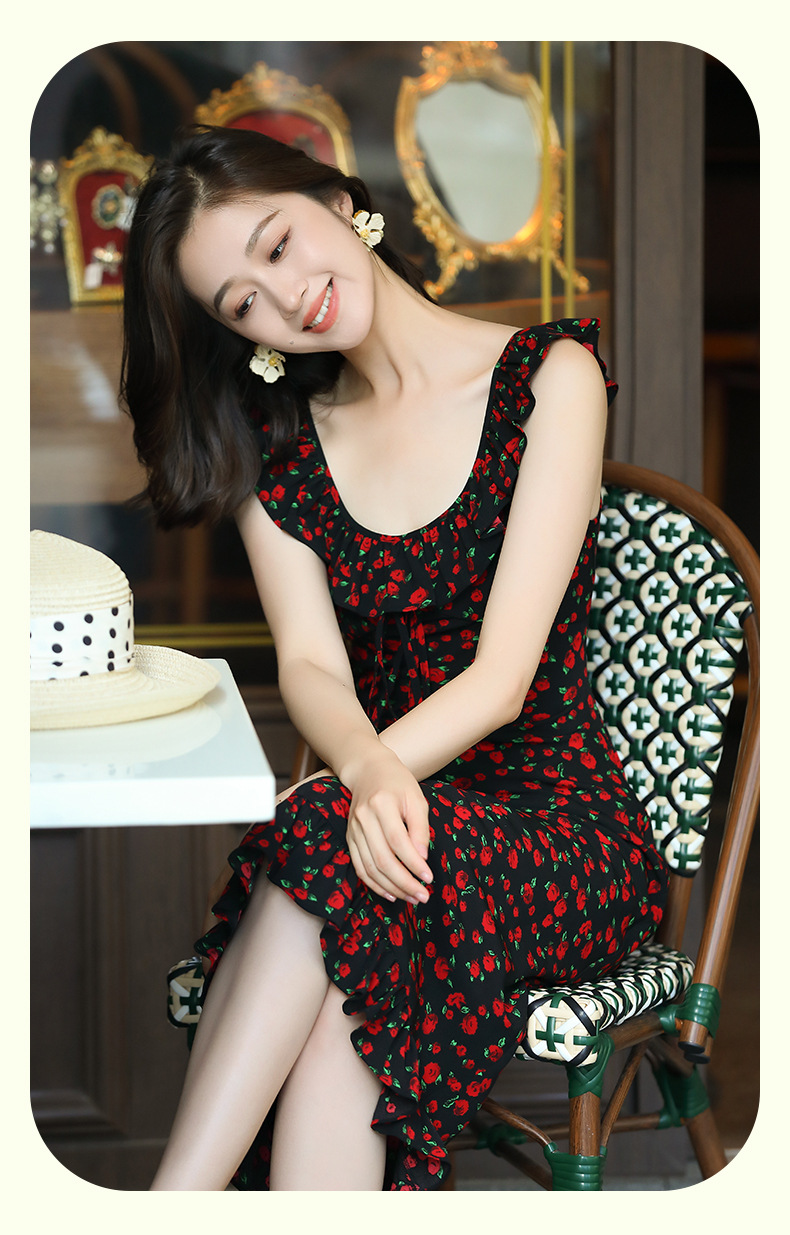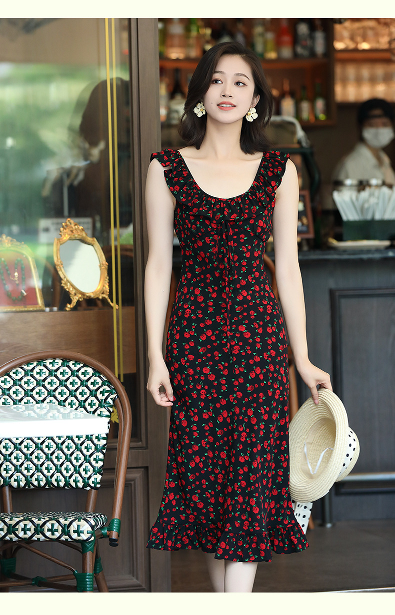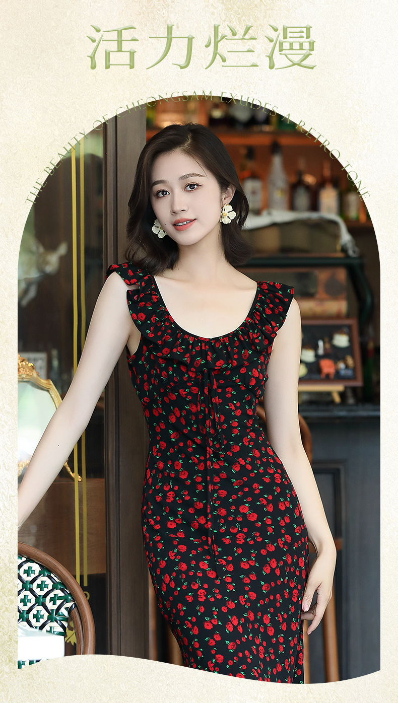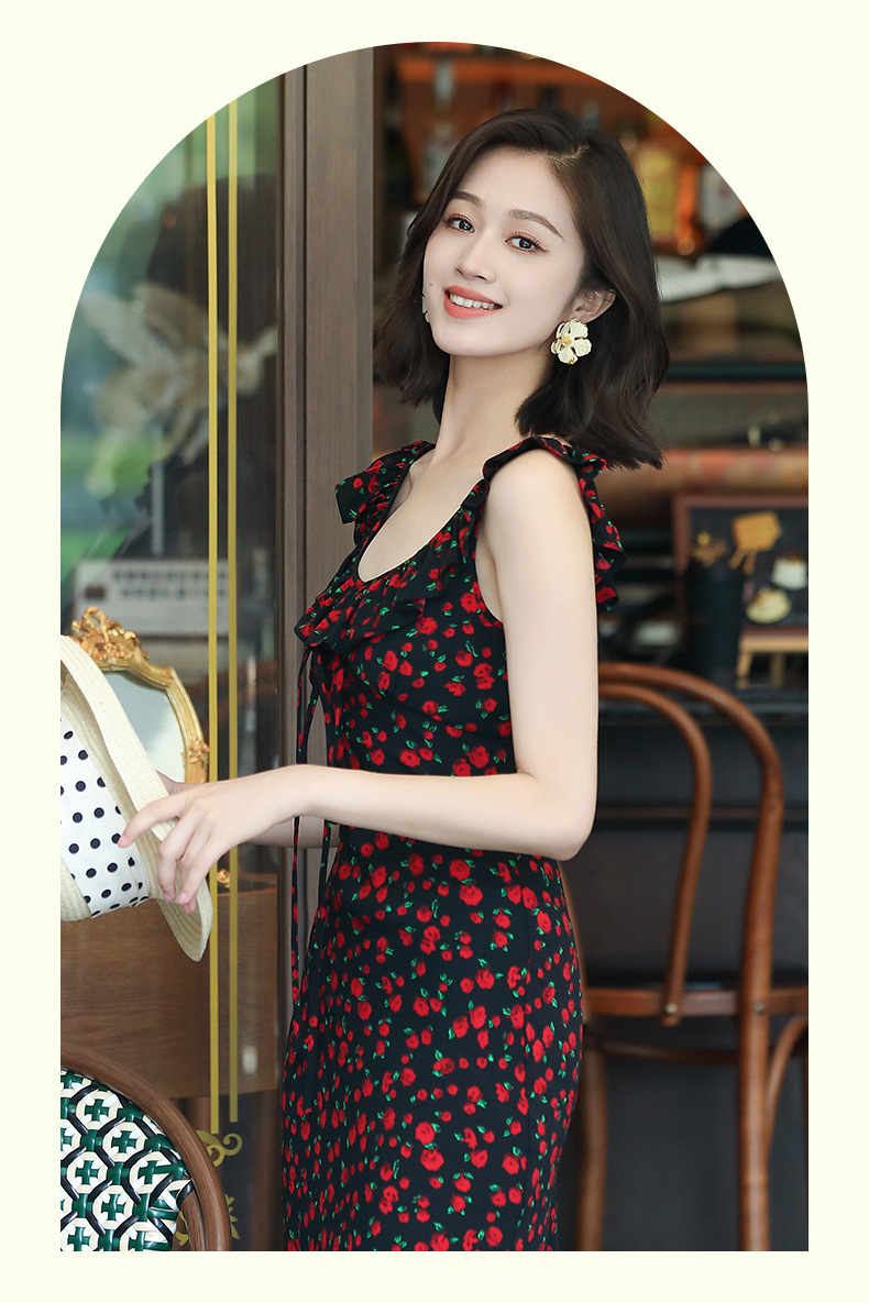 OY-24508夏季新款碎花无袖连衣裙优雅红色显瘦修身吊带鱼尾裙24508