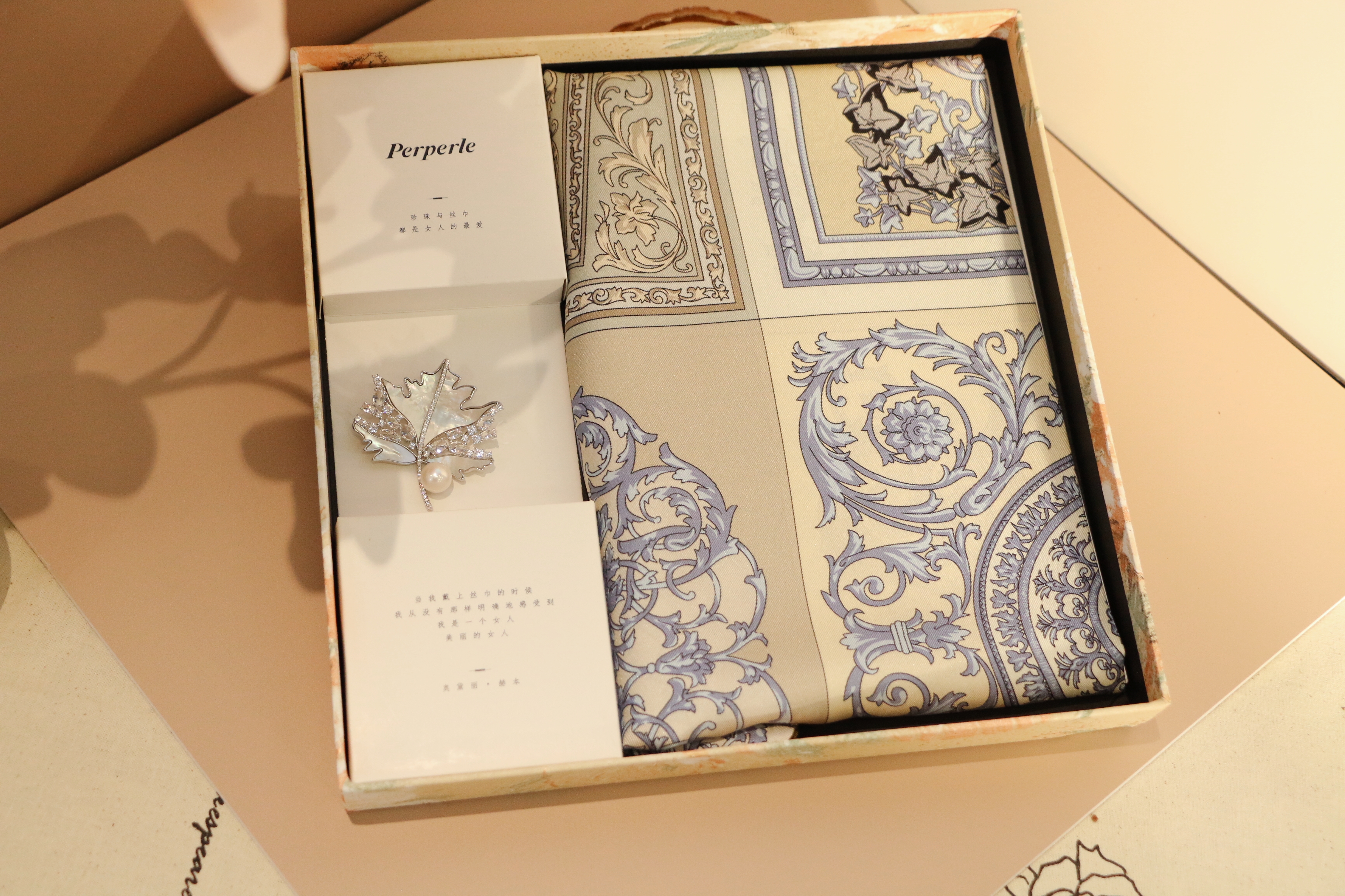 【甄珠贝·国风系列】90*90cm清冷感青瓷丝巾和【秘境蝶生】淡水珍珠枫叶胸花礼盒套装【适合送外宾】