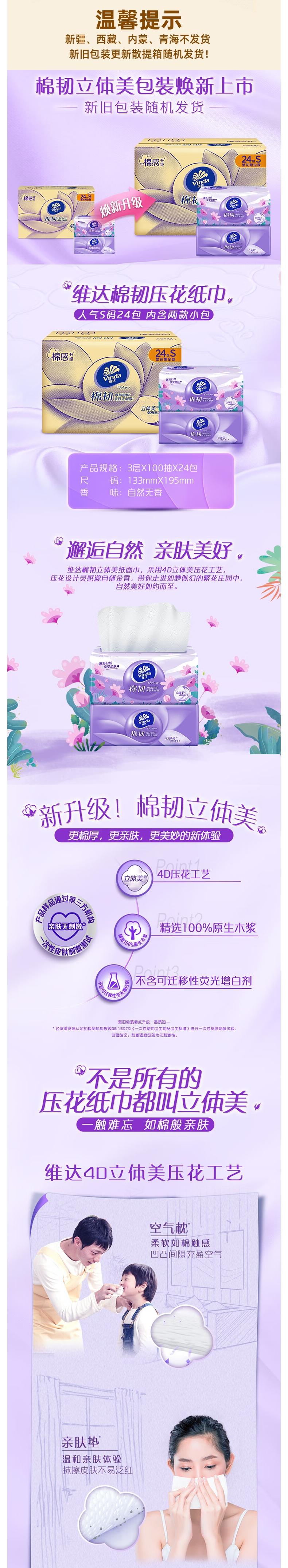 Vinda维达 棉韧立体美压花抽纸3层100抽*24包S码 RW-MR100C24S