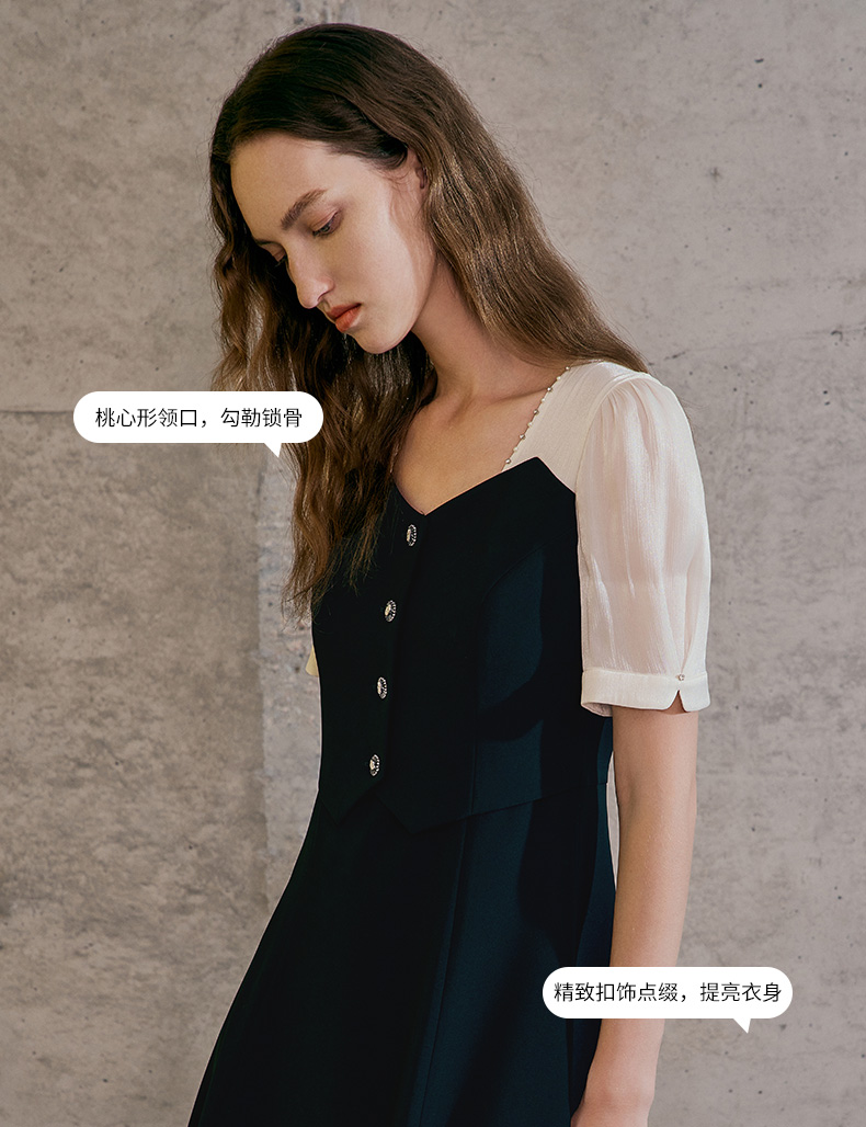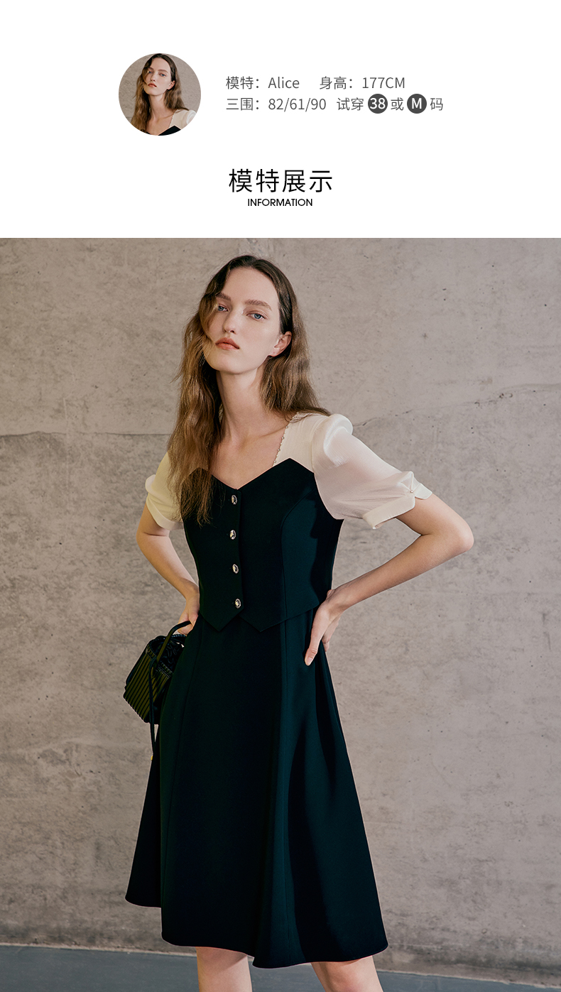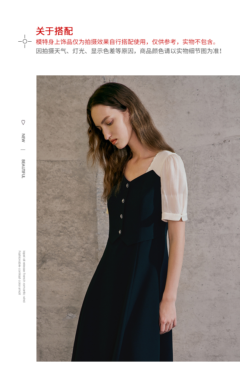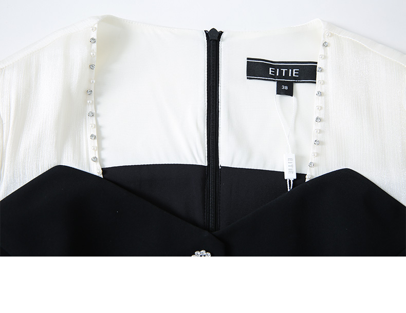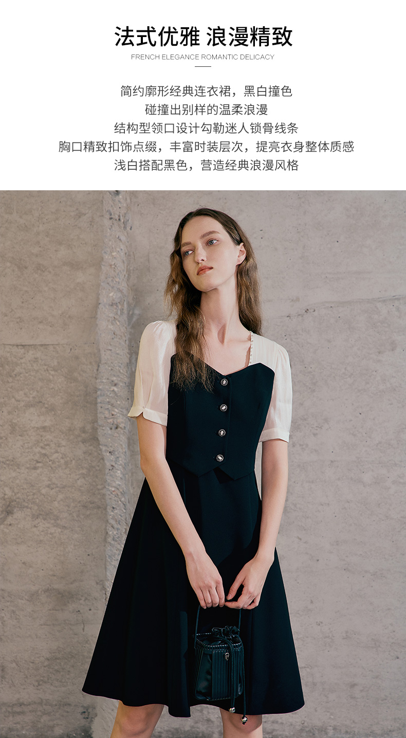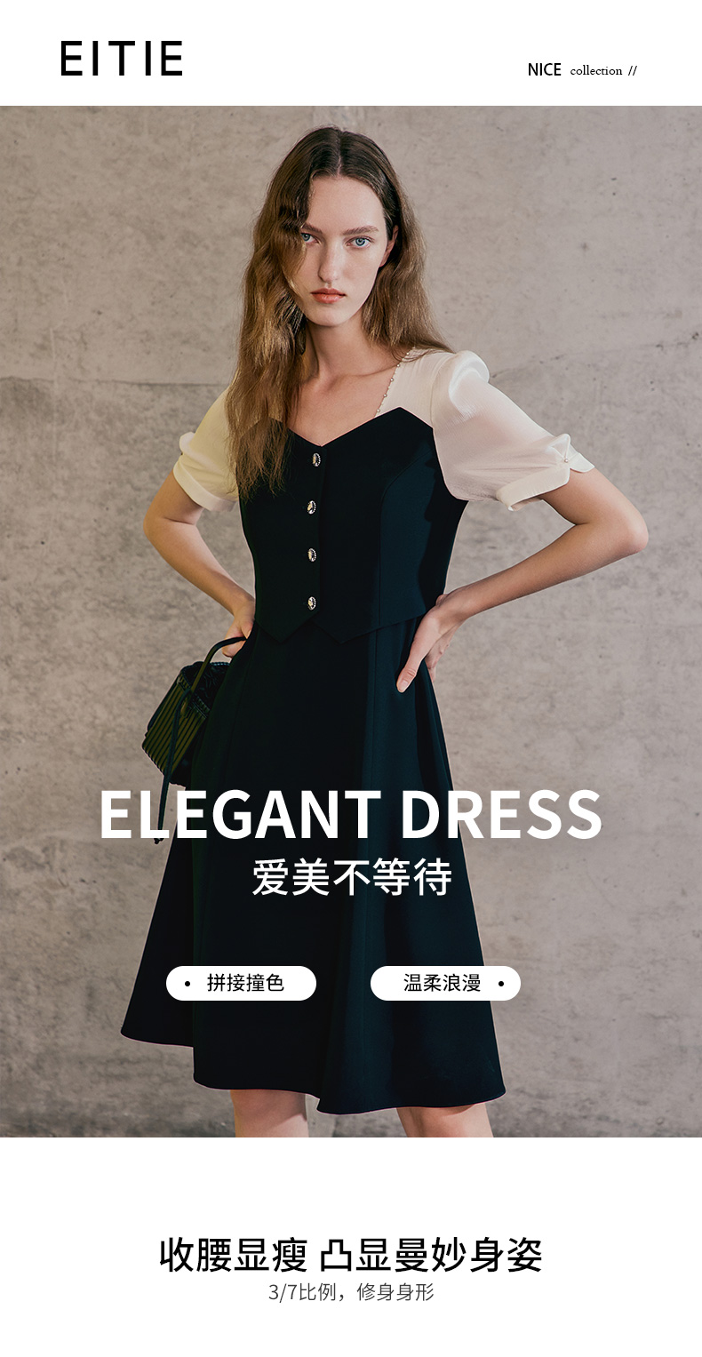 EITIE爱特爱春夏新款时尚气质V领收腰撞色A版显瘦连衣裙7307017