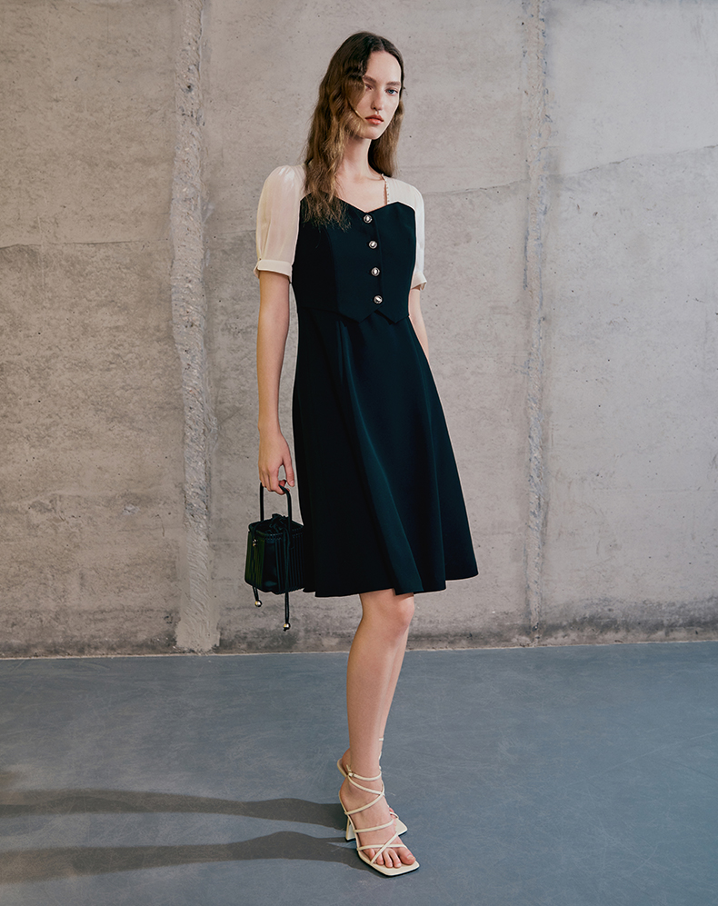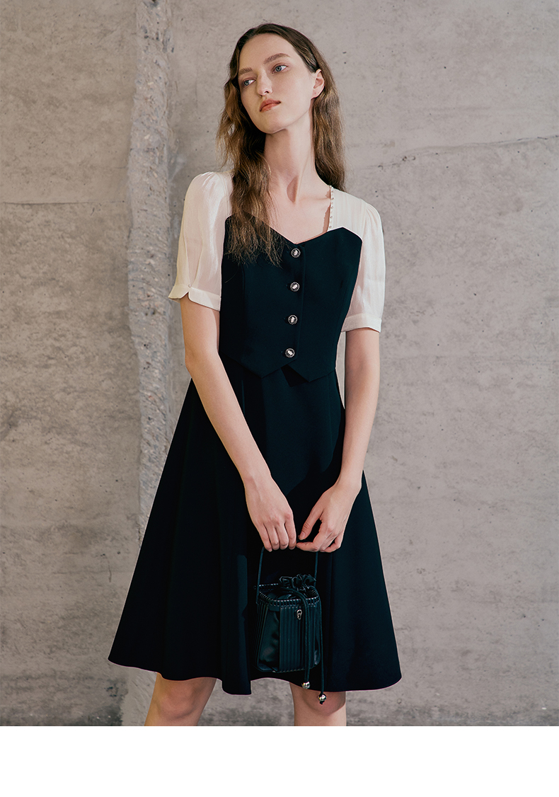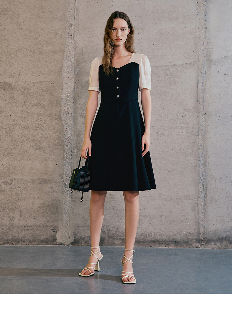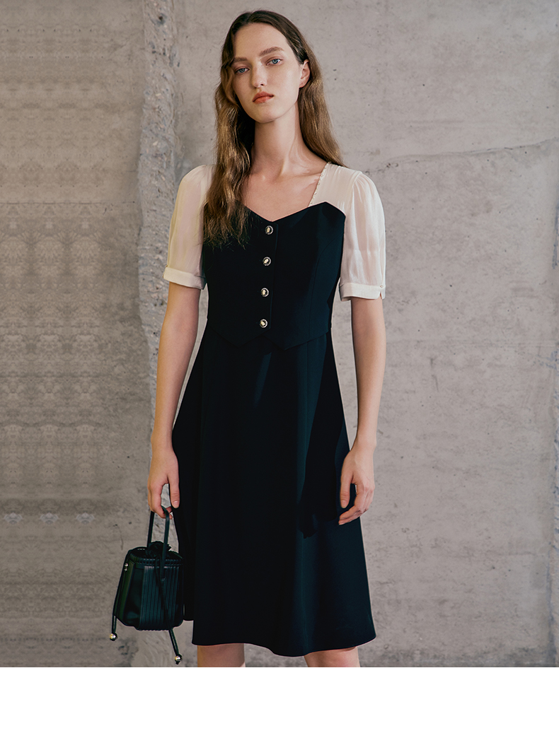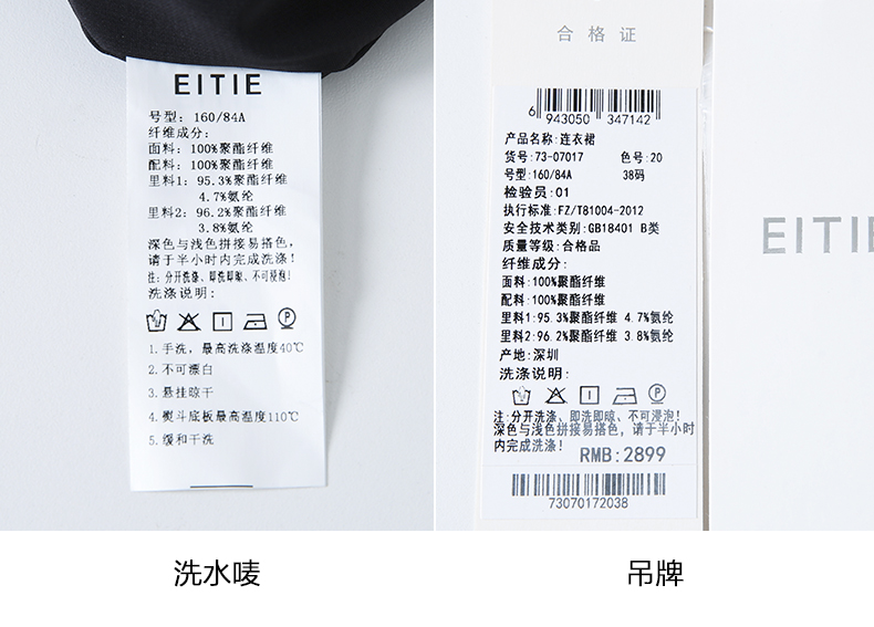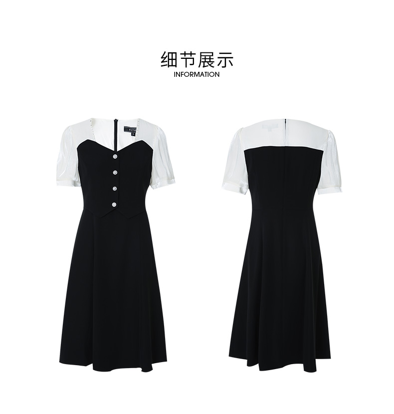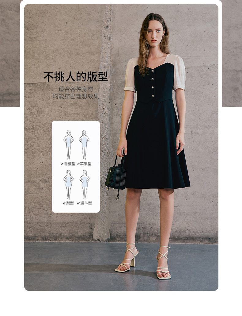 EITIE爱特爱春夏新款时尚气质V领收腰撞色A版显瘦连衣裙7307017