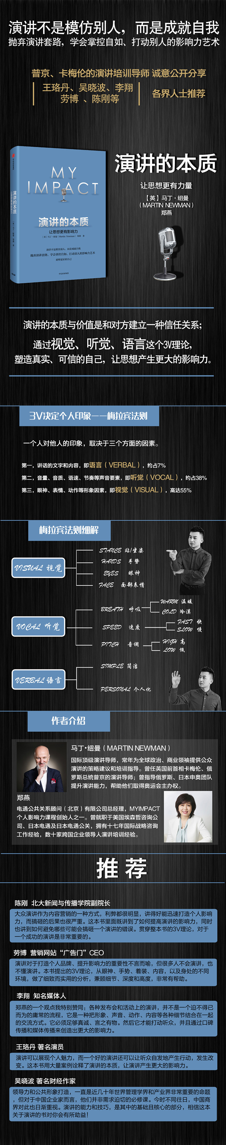 在《演讲的本质》一书中,马丁�9�9纽曼和郑燕娓娓道来,向你讲述了演讲的本质与价值;从视觉(visual)、听觉(vocal)、语言(verbal)三个方面,分享了如何在演讲中打造个人影响力;用大量深入浅出的具体案例,为你剖析了如何在演讲中发挥个人影响力。