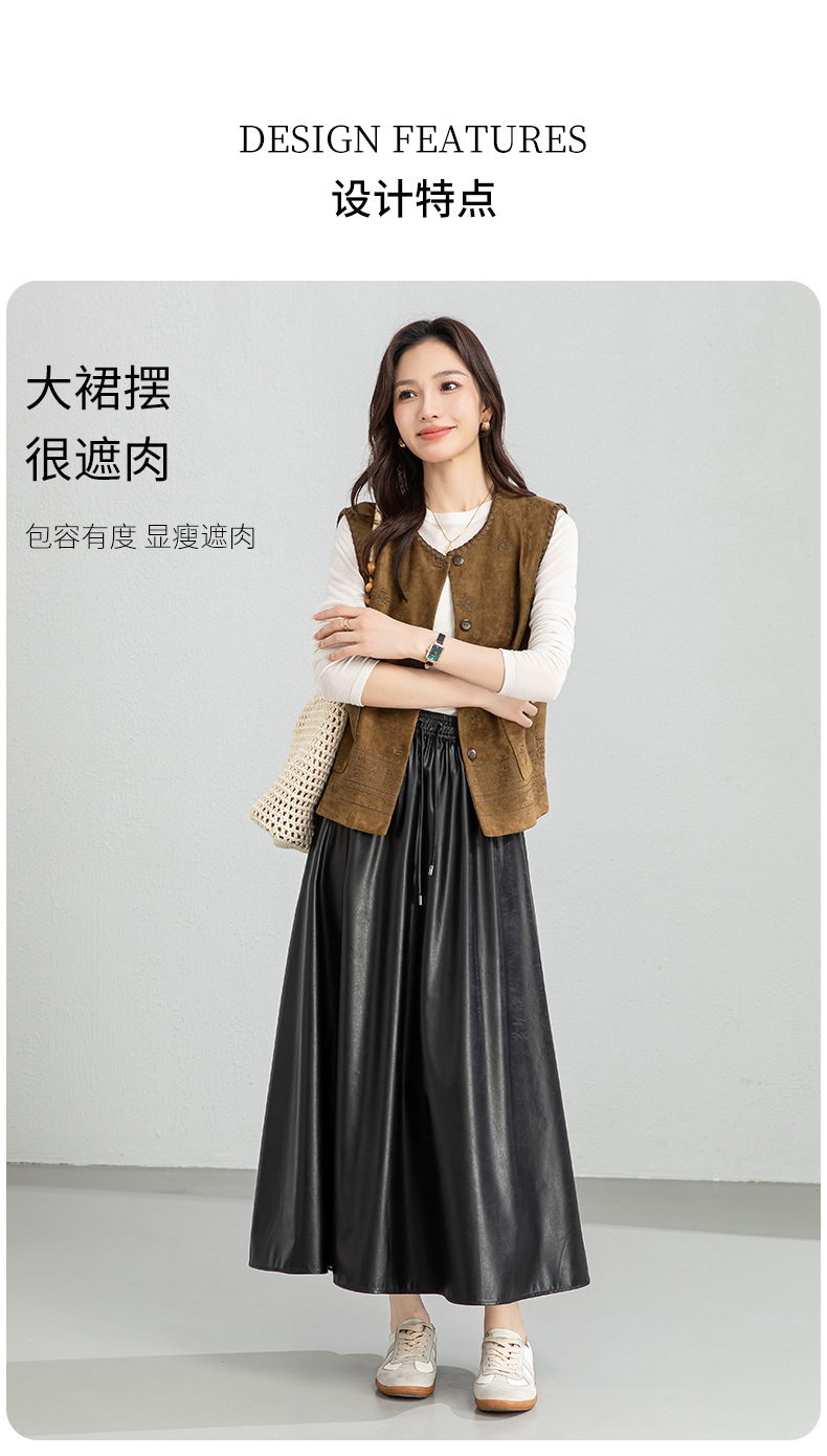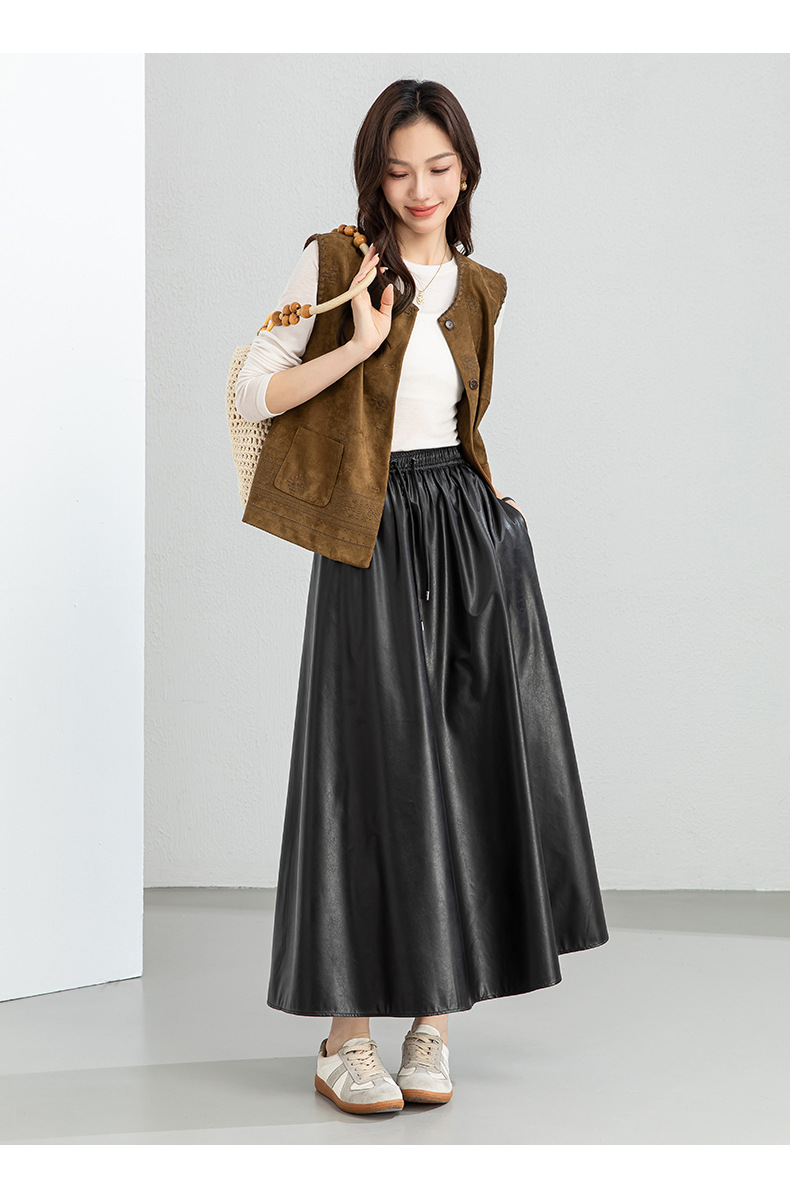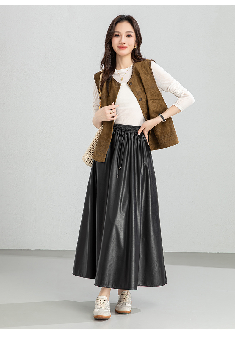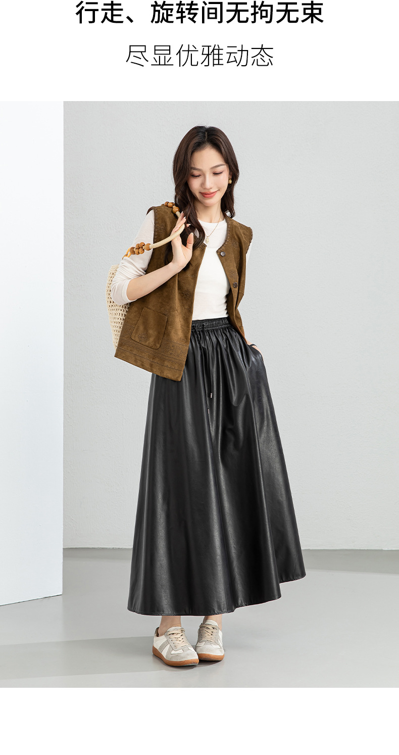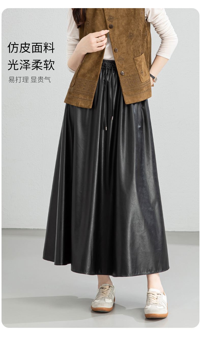 百媚生 pu皮半身裙女春季中长款百褶皮裙BC66077