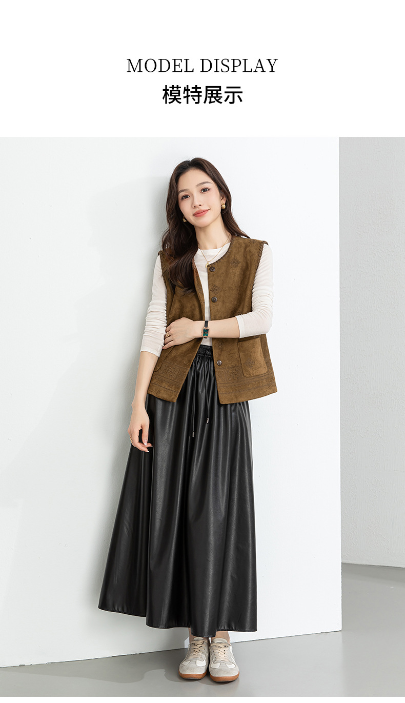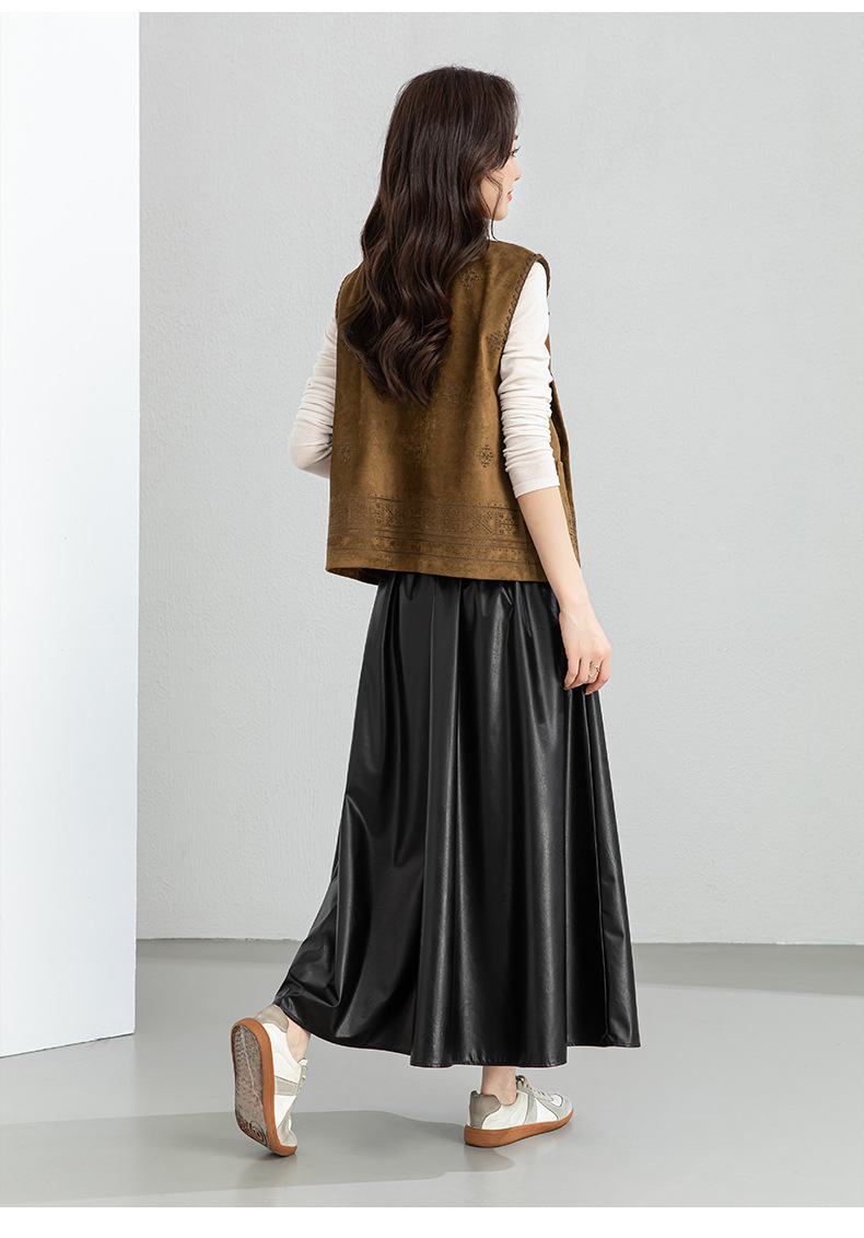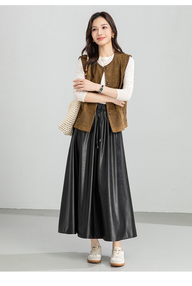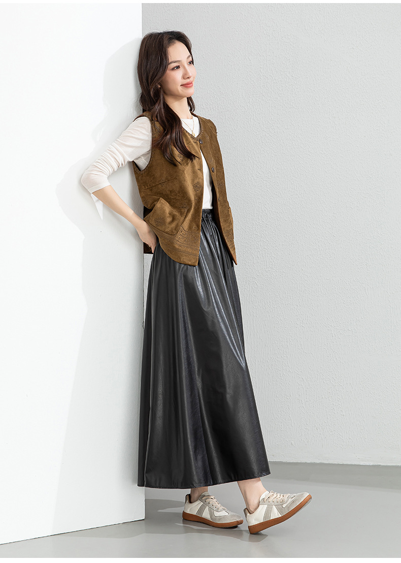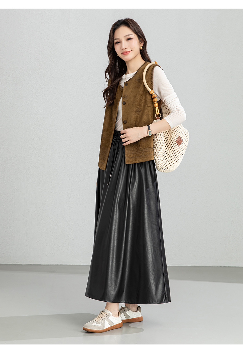 百媚生 pu皮半身裙女春季中长款百褶皮裙BC66077