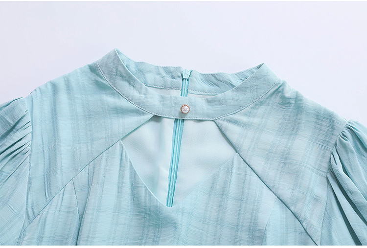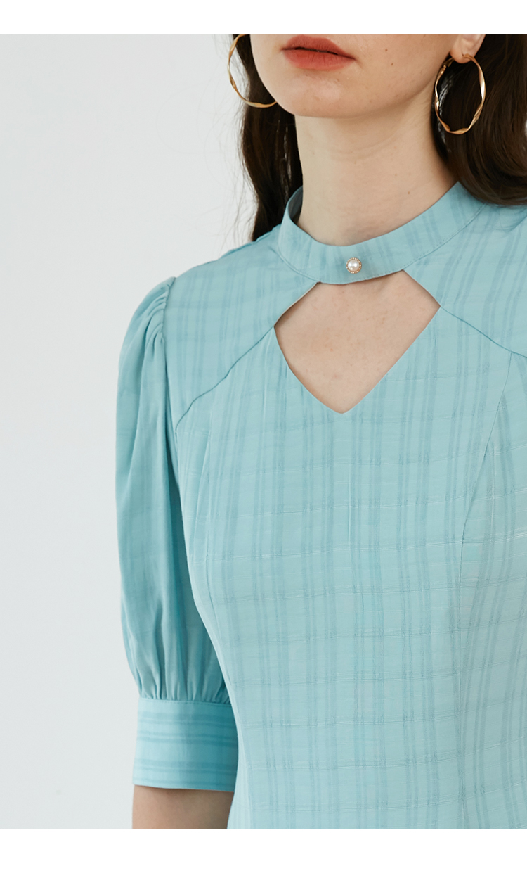 领口镂空设计,优美钻石型镂空, 领中有一粒复古珍珠装饰扣,展现女性美。 |