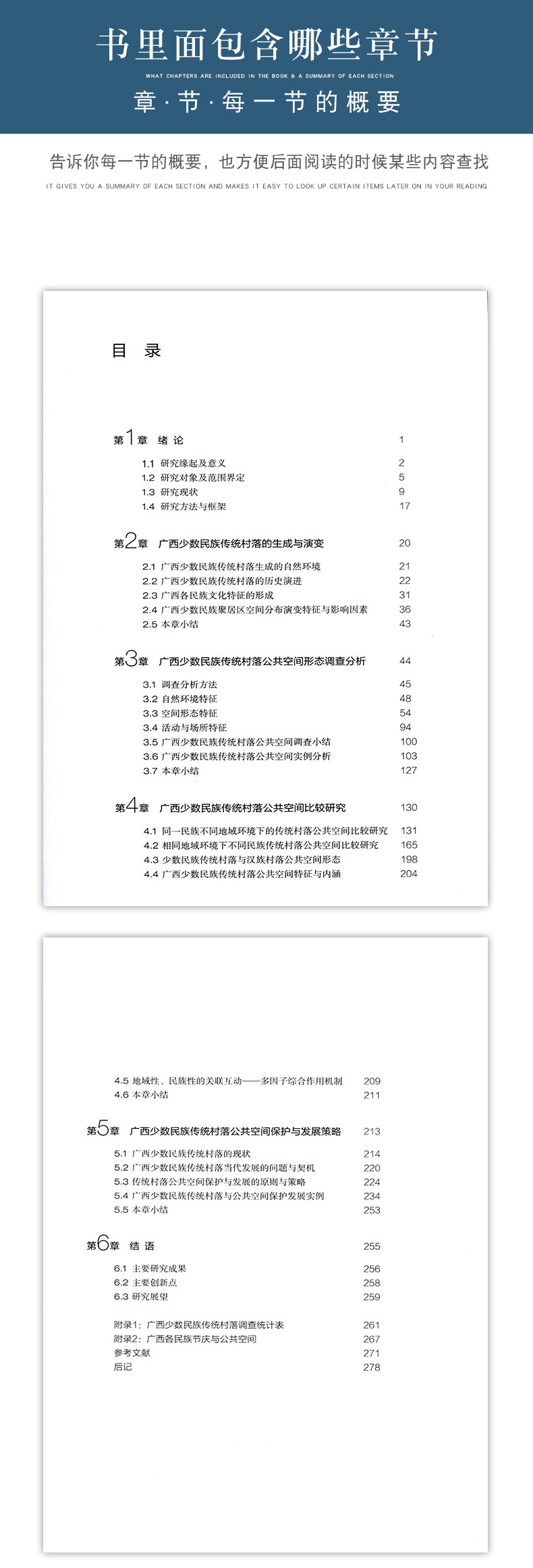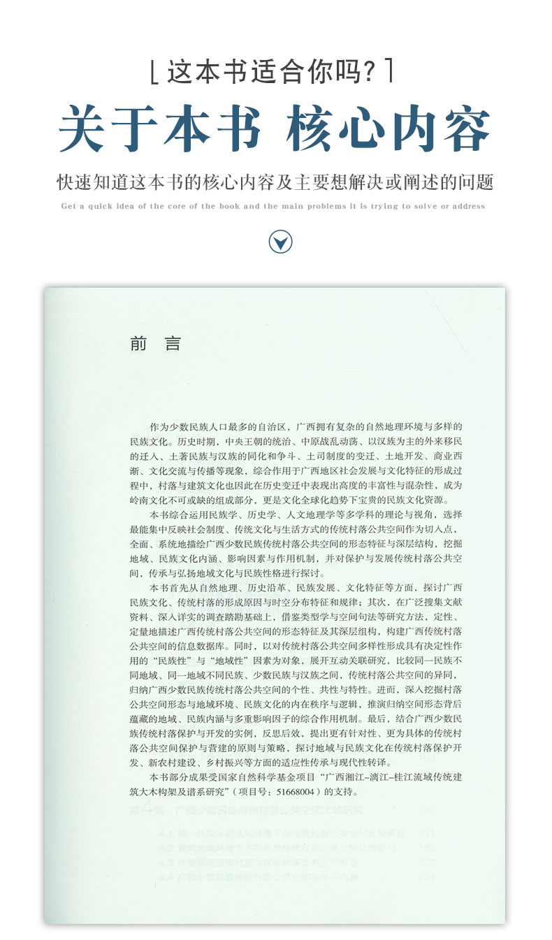 “广西少数民族传统村落公共空间形态研究”一书,以实地调研为基础,通过对广西独特的自然地理、历史沿革、民族发展、文化特征与规律的梳理,借鉴类型学与空间句法,定性、定量地描述广西传统村落公共空间的形态、特征及其深层组构,构建大数据信息库。同时,对“民族性”与“地域性”因素进行互动关联研究,比较同一民族不同地域、同一地域不同民族、少数民族与汉族之间,传统村落公共空间的异同,归纳广西少数民族传统村落公共空间的个性、共性与特性,进一步挖掘地域、民族的内涵与源动力,以及多重影响因子的综合作用机制。最后,结合保护开发实例,反思后效,提出更有针对性、更为具体的传统村落公共空间保护与营建的原则与策略,探讨地域与民族文化在传统村落保护开发、新农村建设、乡村振兴、新建公共建筑中的适应性传承与现代性转译。