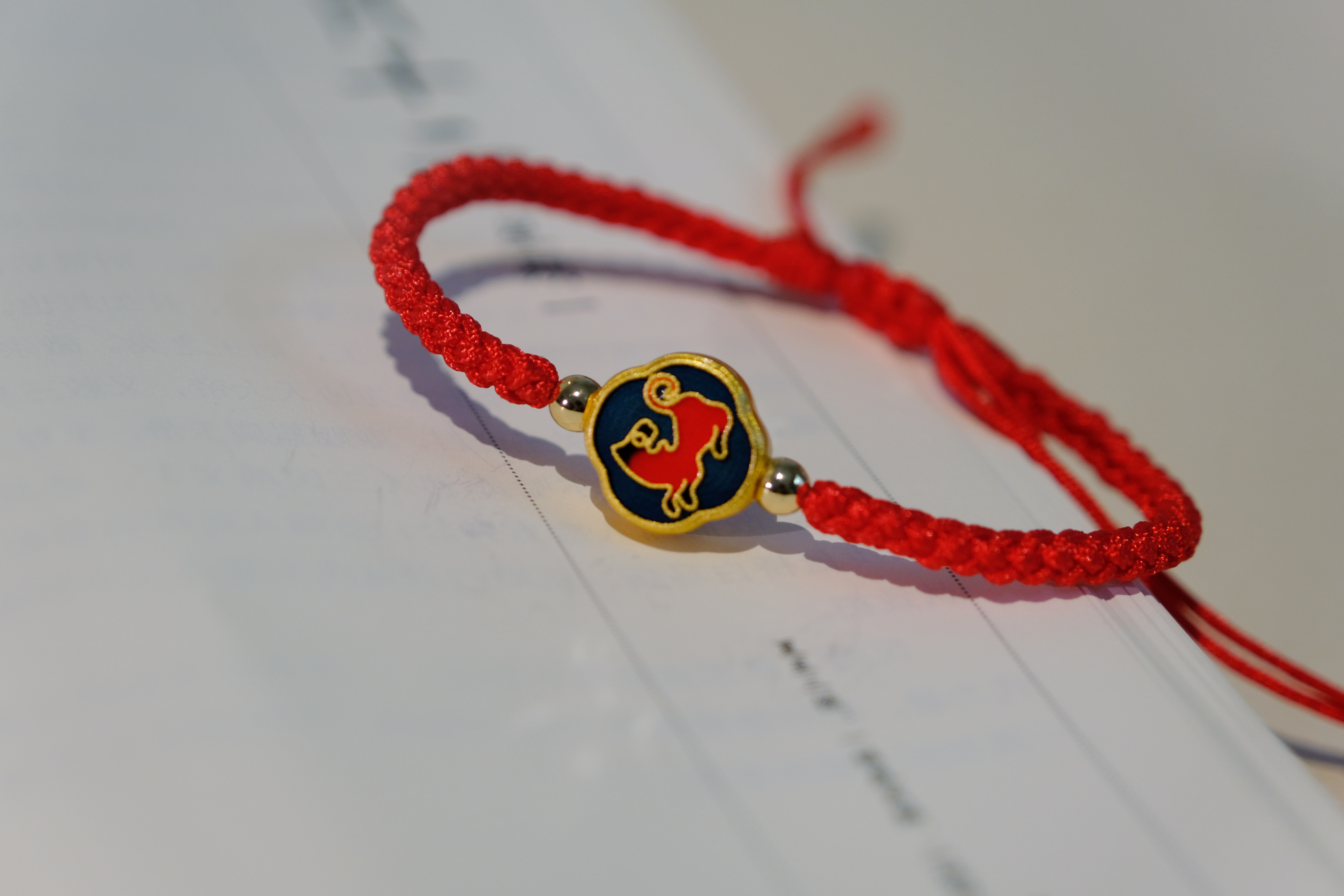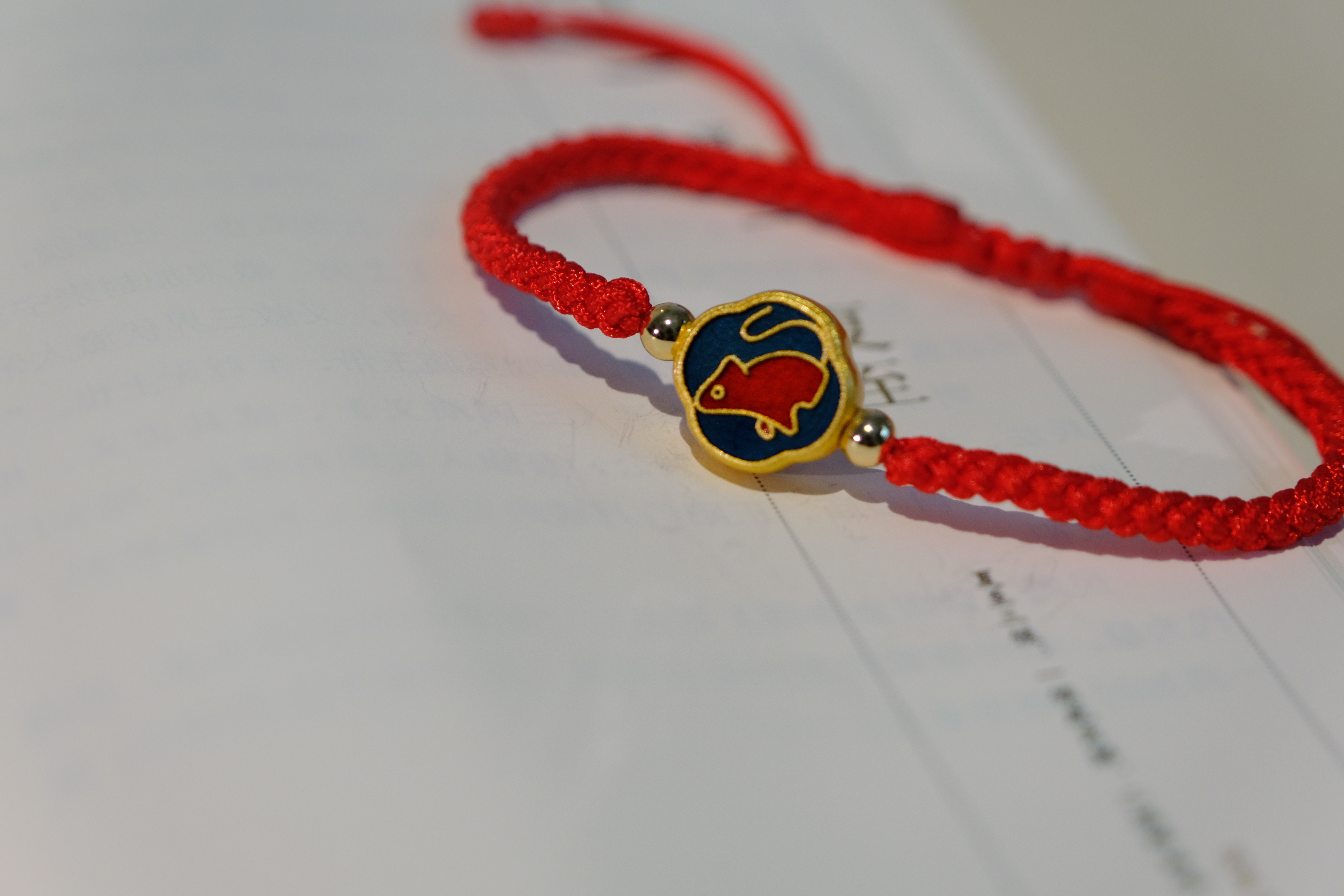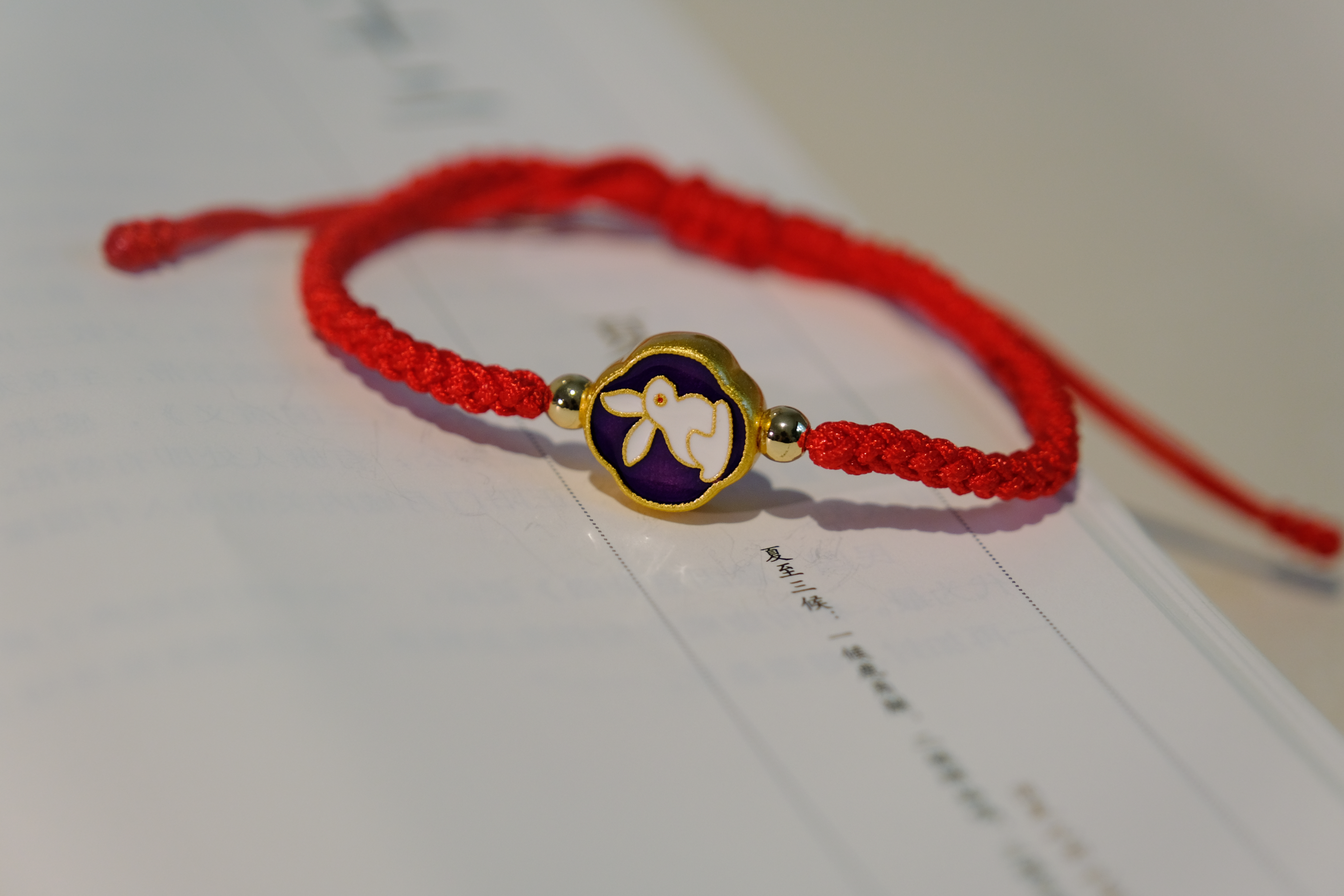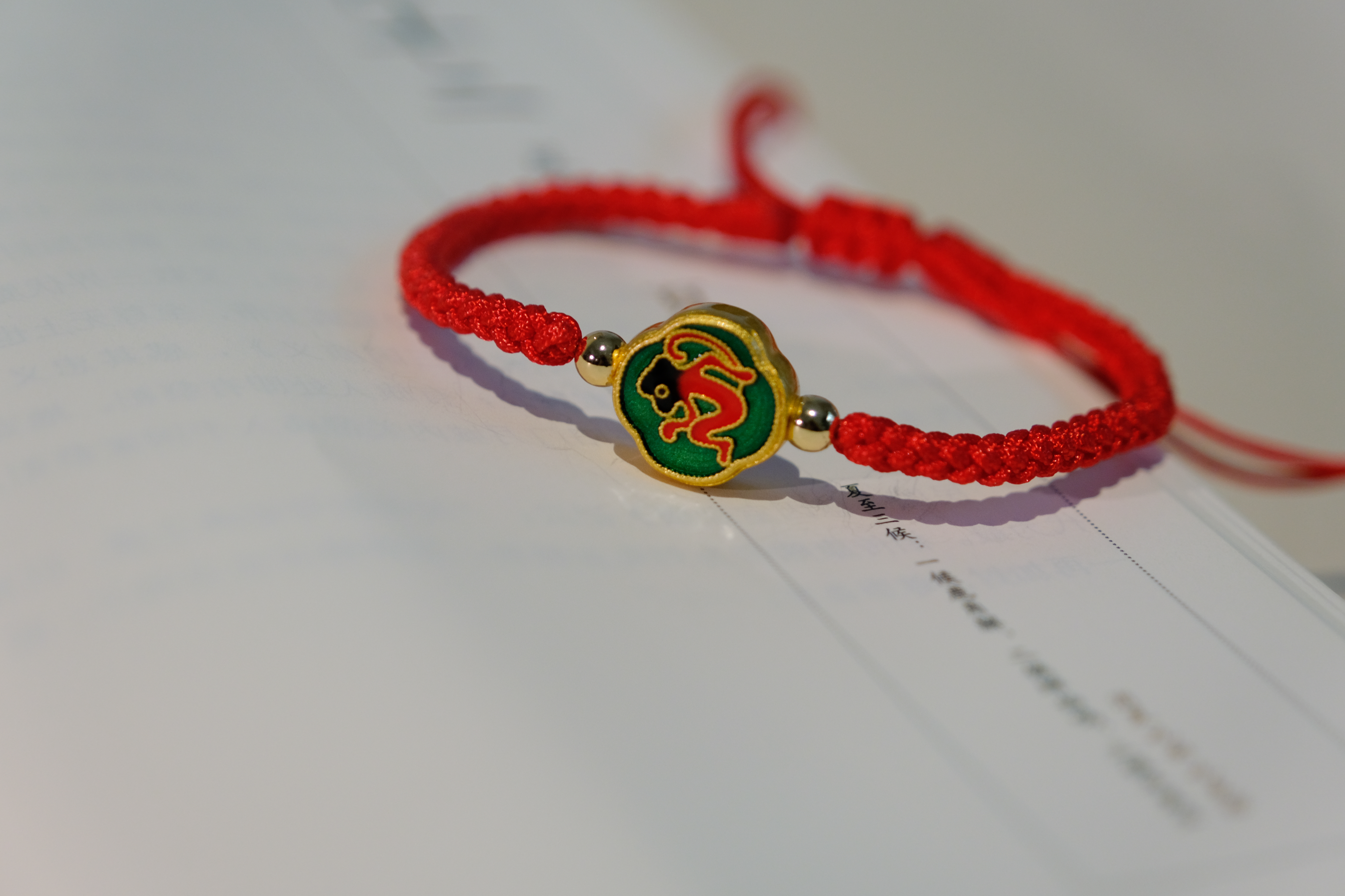 材质:铜镀18K金珐琅,进口红绳,进口14k包金配件