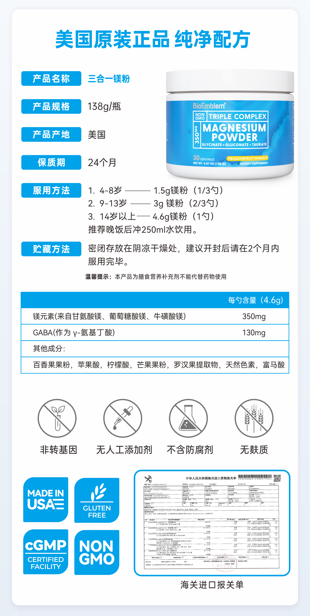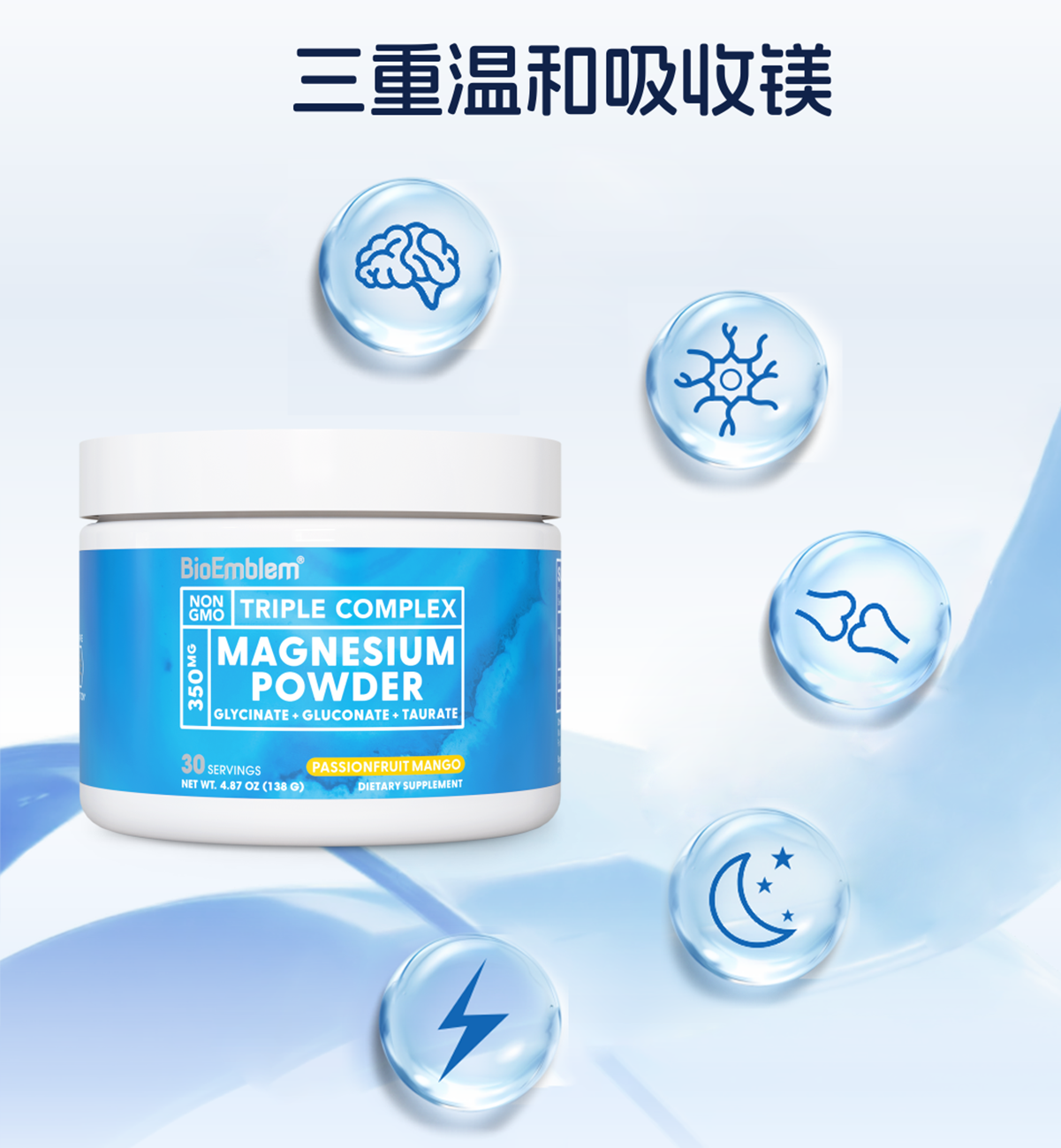 美国BioEmblem保康博 三合一镁粉补充剂 138g/罐