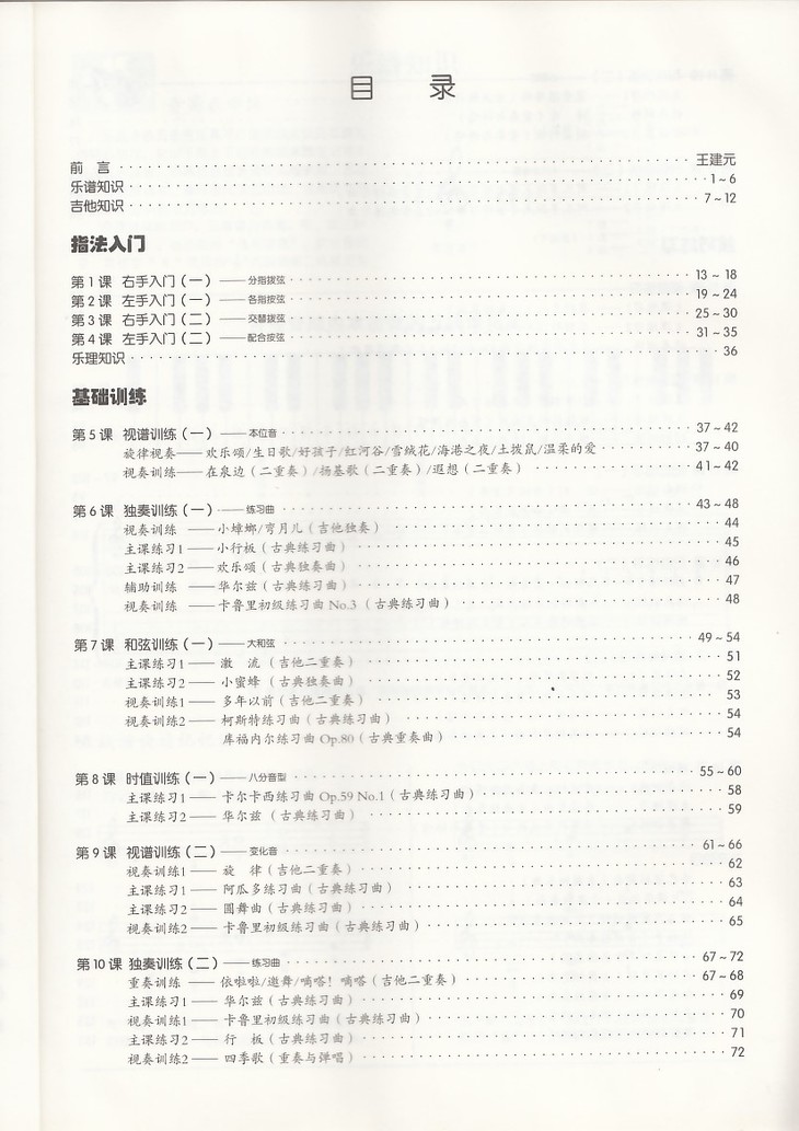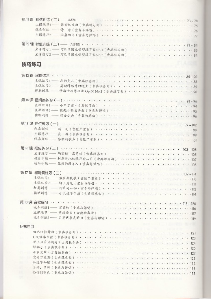 这是南艺——流行音乐学院系列丛书之一,作为教材使用多年,堪称经典。本书由中国著名吉他演奏家、教育家吴子彪和赵长贵合编,他们将吉他理论和教学实践经验相结合,是实用性很高的成熟教程。内容从最基本的乐理知识入手,以古典吉他独特的演奏技巧与指法训练为基础,配合课内丰富的知识点与详细的训练要求,并辅以响应难度的独奏曲与重奏曲,使广大吉他初学者既学会乐理,又掌握技巧;既领会要领,又乐在其中,在不知不觉中逐步熟练古典吉他的演奏。