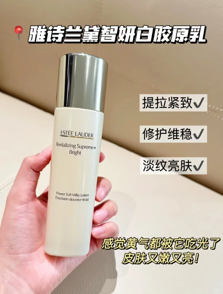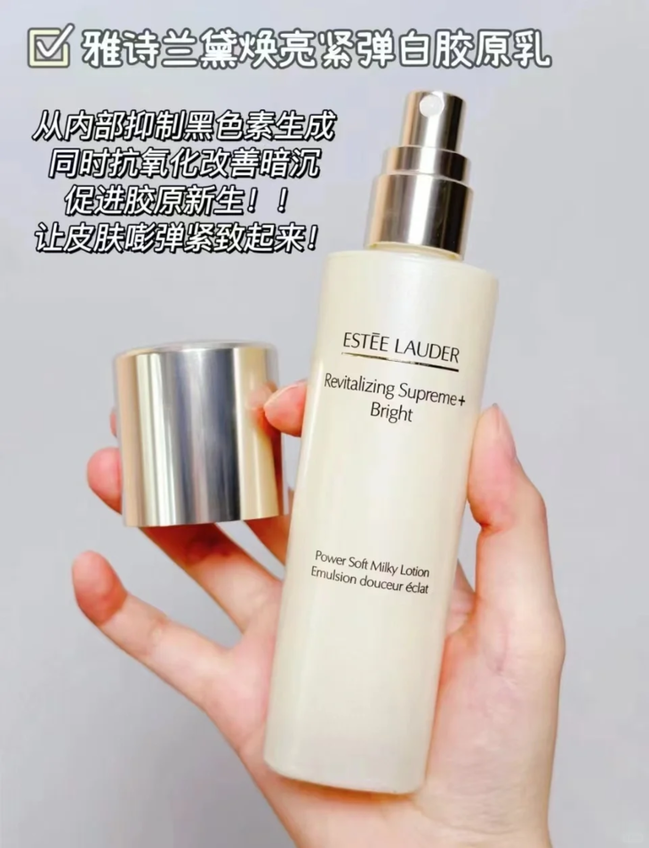 👑雅诗兰黛智妍美白乳液100ml 💎【淡斑美白首选】雅诗兰黛【新品】白胶原乳液 ✨含有两倍辣木籽精华抗氧化+日本莓果成分+烟酰胺美白透亮+六胜肽抗皱去纹等 💫皮肤补水锁水功效出色,抗衰老、淡化斑点 提亮肤色简直完美! ✅从内部抑制黑色素生成,同时抗氧化改善暗沉促进胶原新生!! 🤍质地像牛奶乳液一样流动性很好,轻薄好吸收! 💚有效:提拉紧致✔️修护维稳✔️淡纹亮肤✔️ 👍让你美白➕抗皱抗衰一瓶搞定!