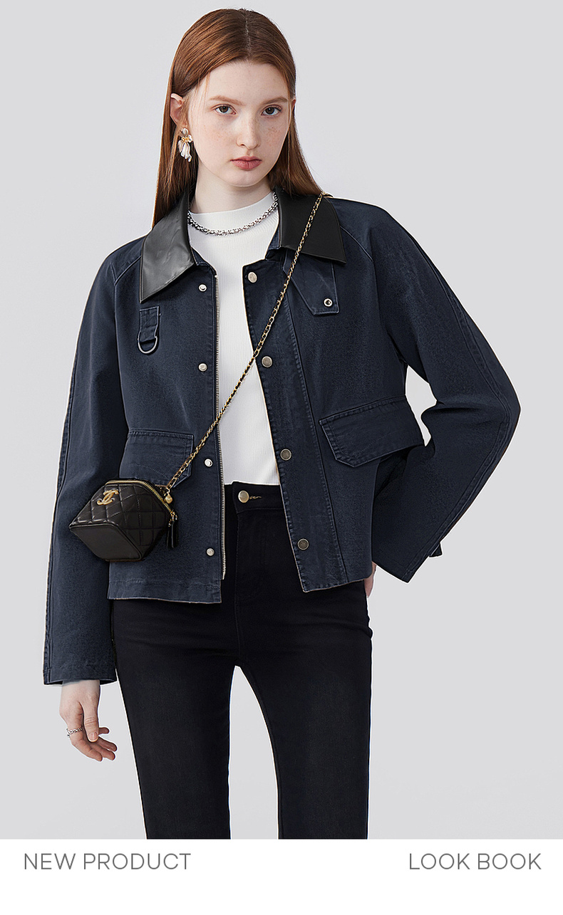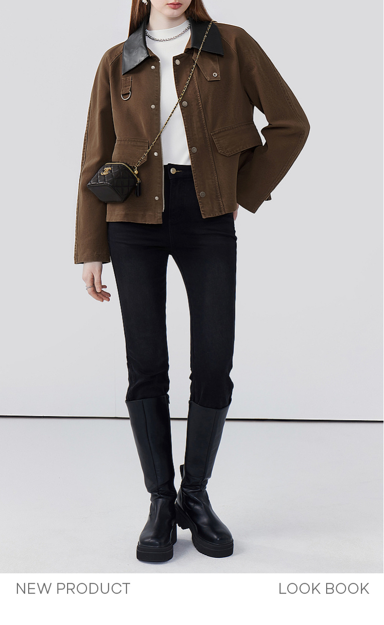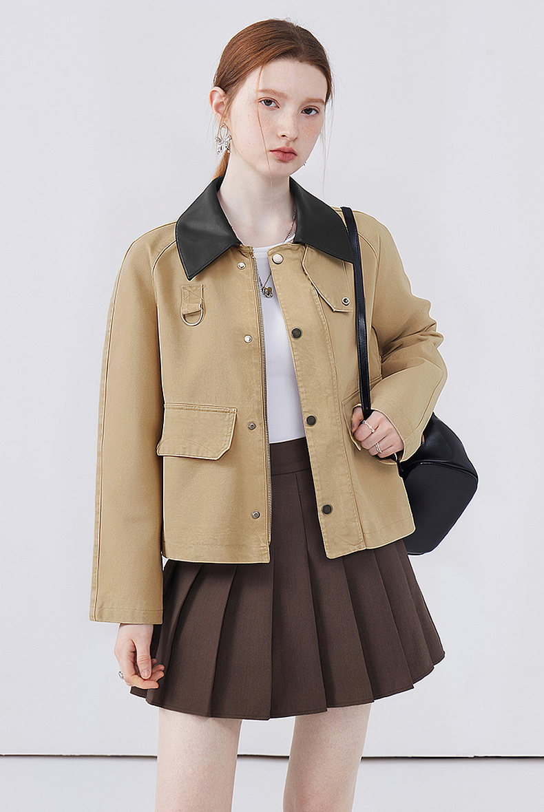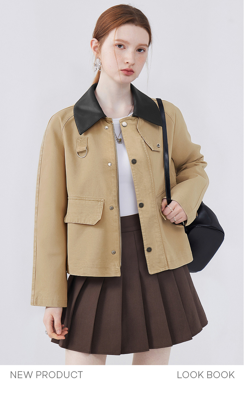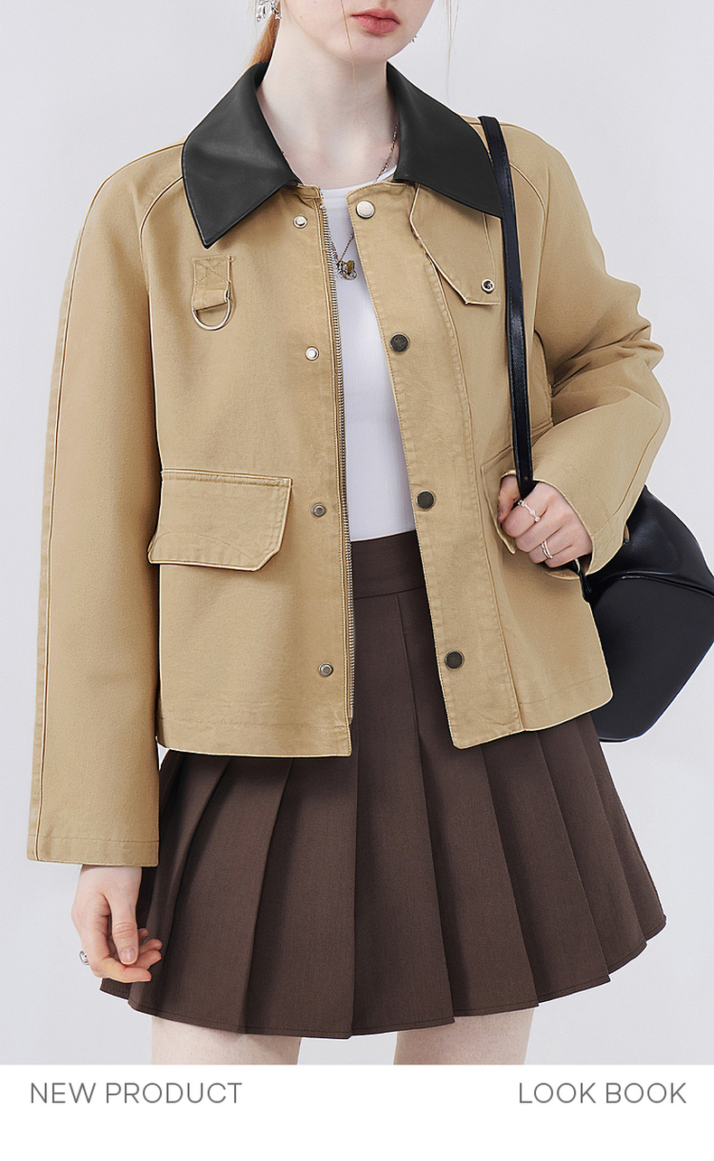 天猫同步【时髦巴恩风】拉夏贝尔/La Chapelle皮质翻领D字环翻盖口袋外套女复古设计感休闲时髦夹克衫