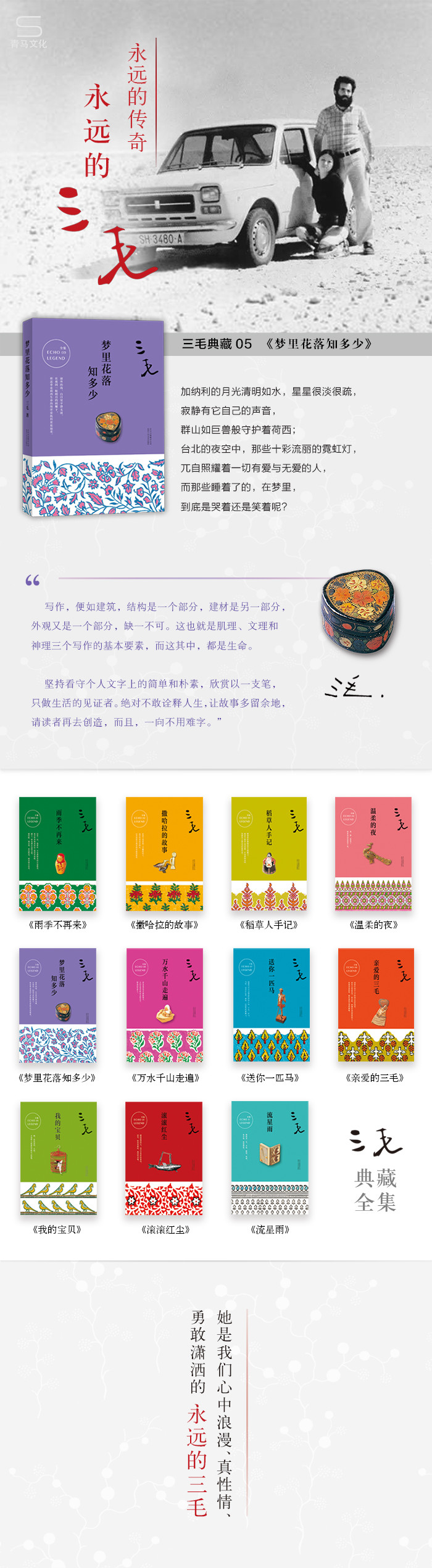 她以一支笔坚持看守个人文字上的简单和朴素;从遥远的撒哈拉到敦煌戈壁,她不随波逐流,也不诠释人生,只做生活的见证者;她是我们心中浪漫、洒脱、真性情的永远的三毛,永恒的传奇。《梦里花落知多少》真实地记录了爱人荷西意外离世后,三毛所经历的黑暗时光,然而哀恸过后的她愈发坚强,文字也愈发透着深情与力量。