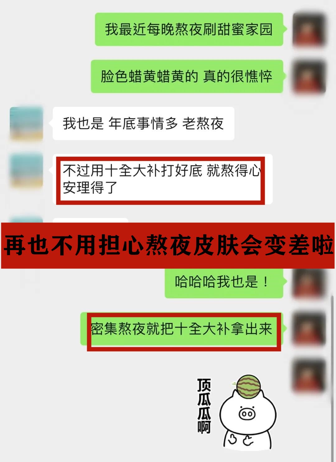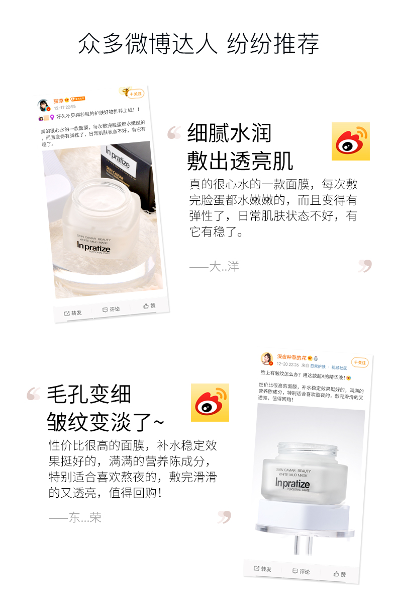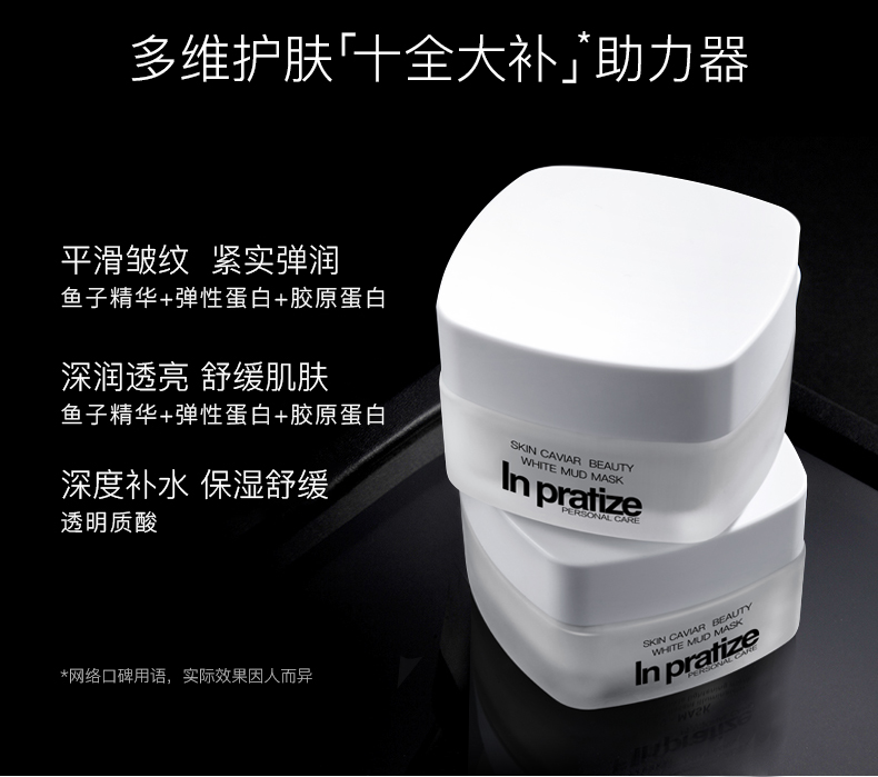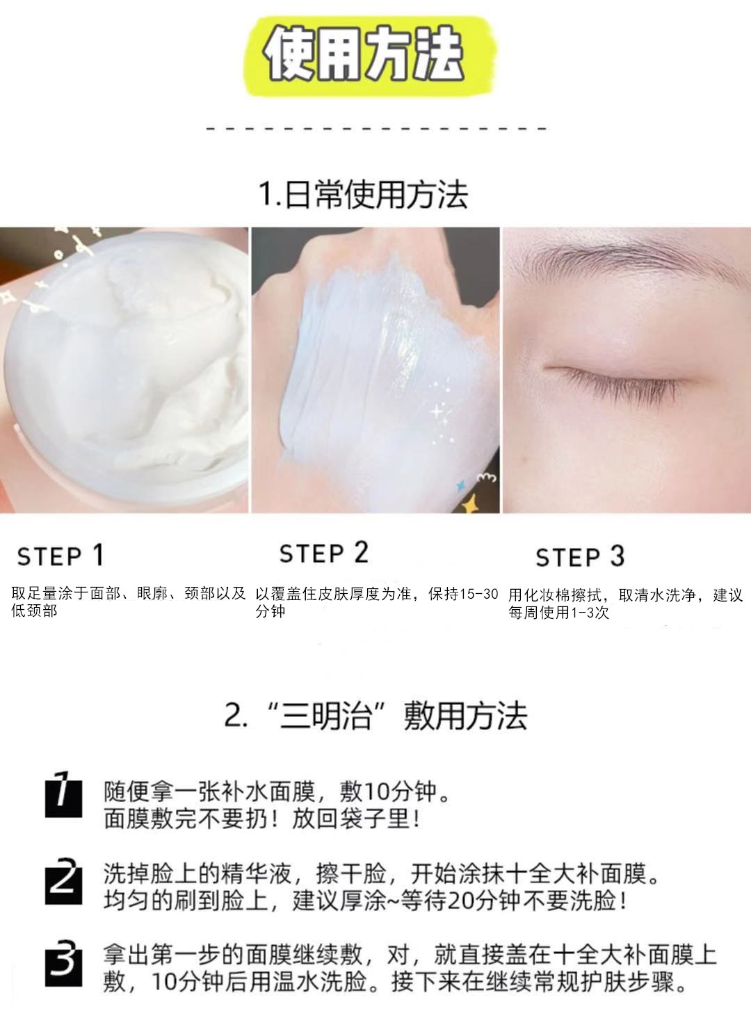 2.补水保湿、提亮肤色、紧致肌肤、增加弹性、收缩毛孔、舒缓肌肤、抚平细纹,尤其是熬夜星人的急救面膜,用完气色立马提升,是熬夜后的紧急护肤法宝。被称为“十全大补”、“一夜回春”“换脸面膜”。