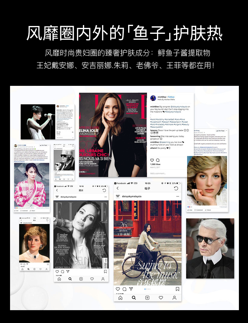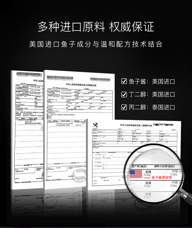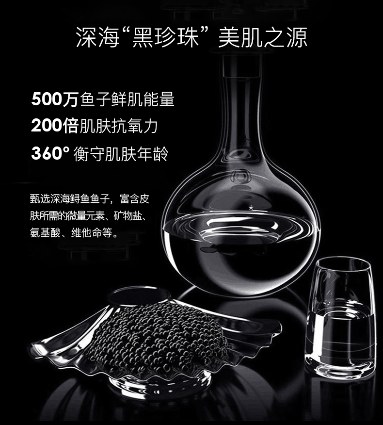 1. 蕴含深海“黑珍珠”——美国鲟鱼子酱成分。借助医用级别透明质酸,来储存相当于本身重量1000倍水分的分子,以此提高肌肤的储水力,使皮肤饱满丰盈。